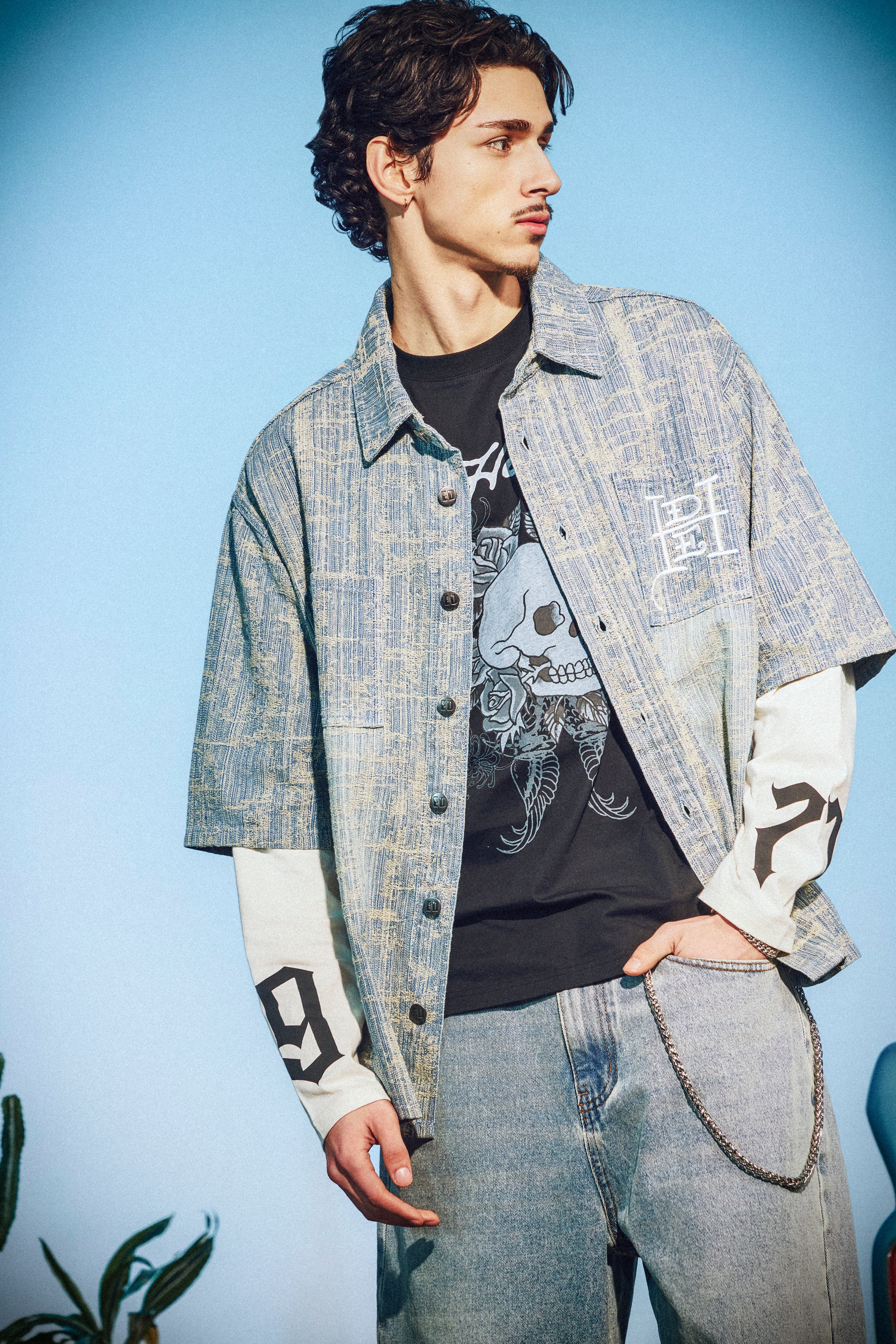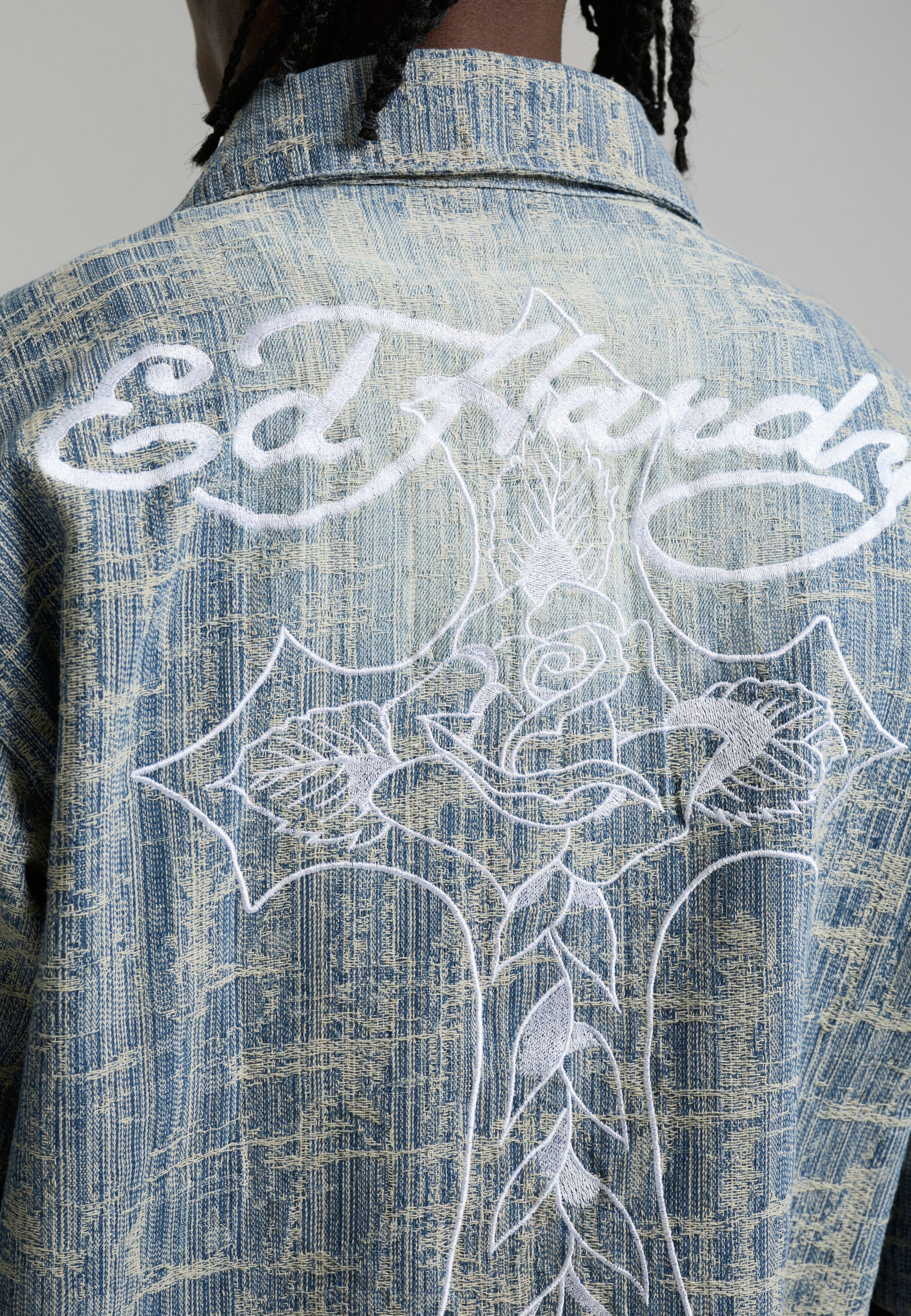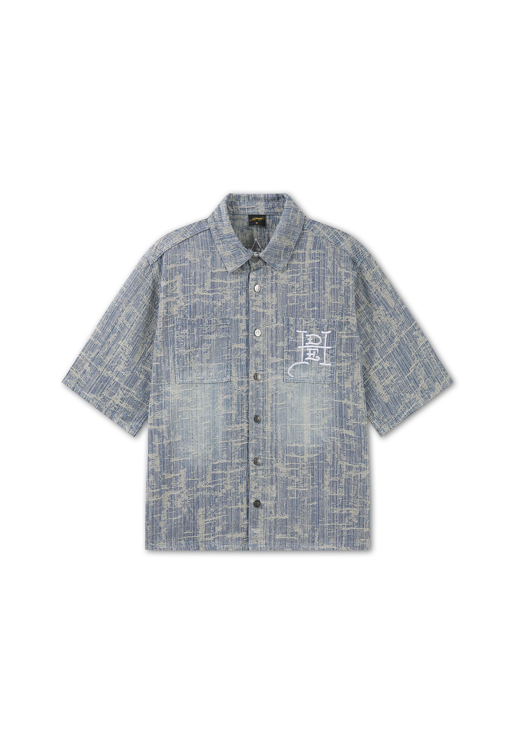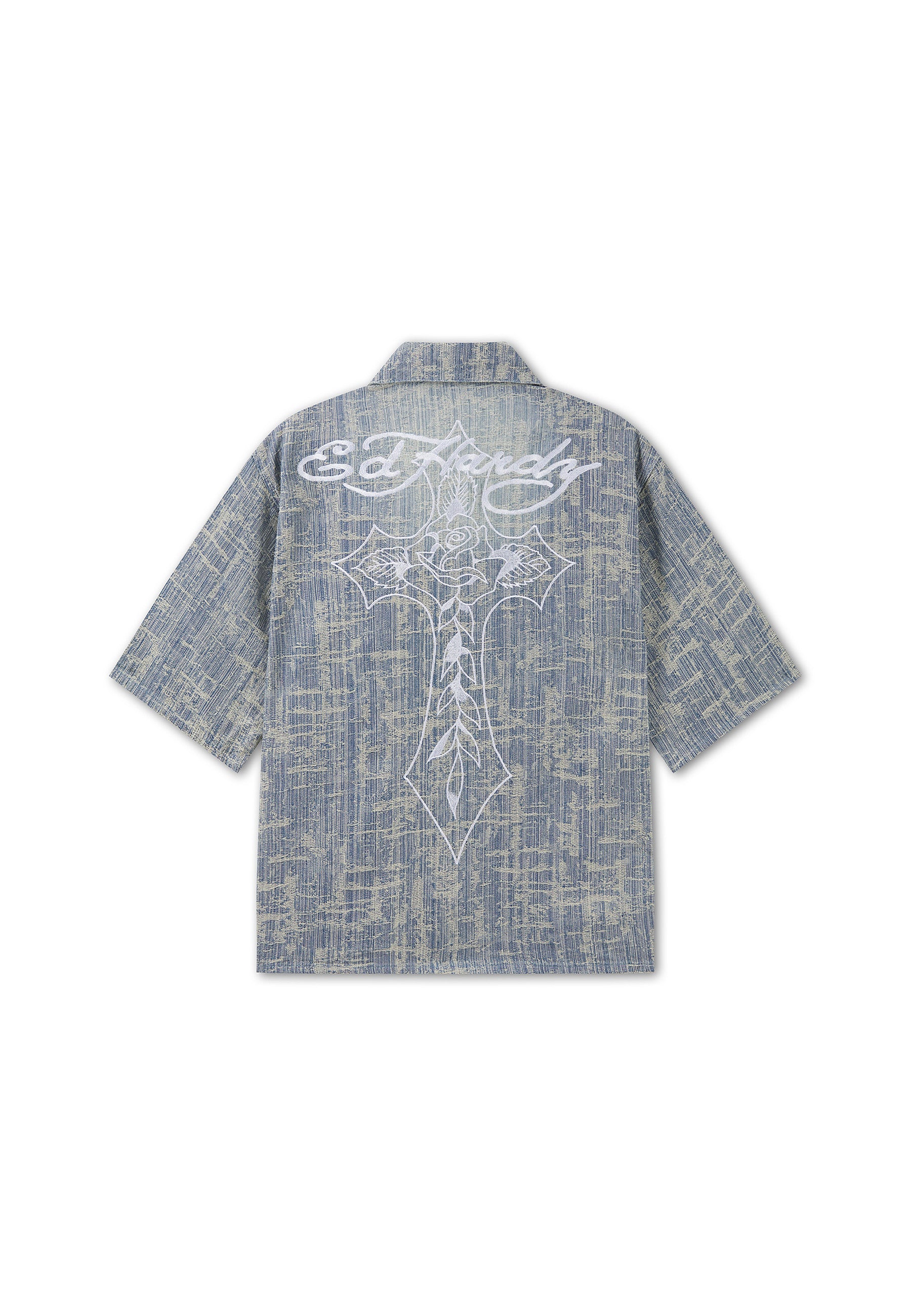 Mens Distressed Cross Relaxed Denim Shirt - Blue