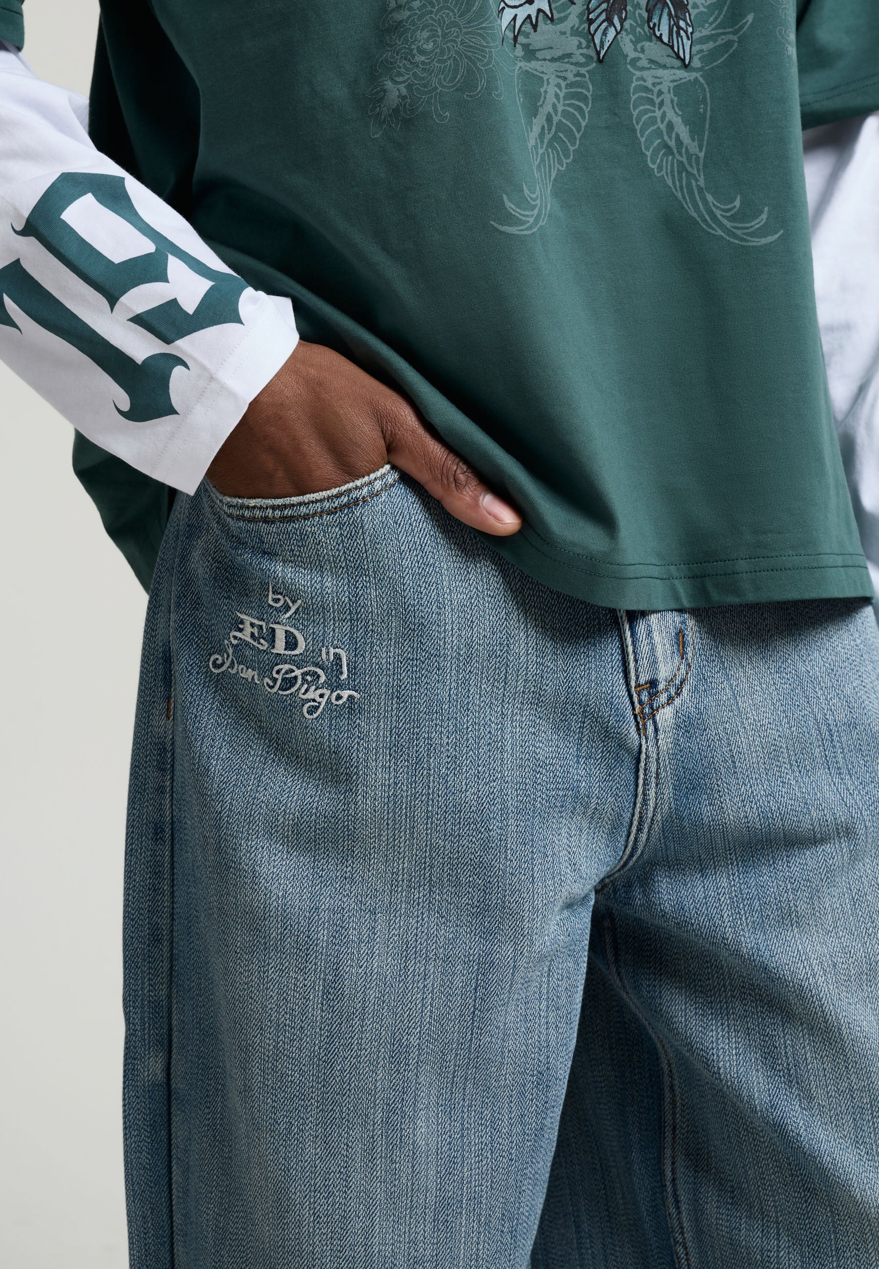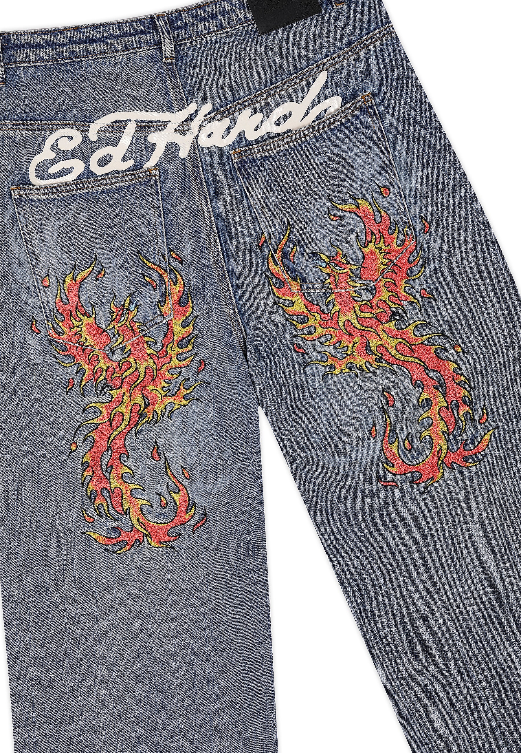 Mens Embroidered Angel Xxtra Fit Jeans - Distressed Blue Wash