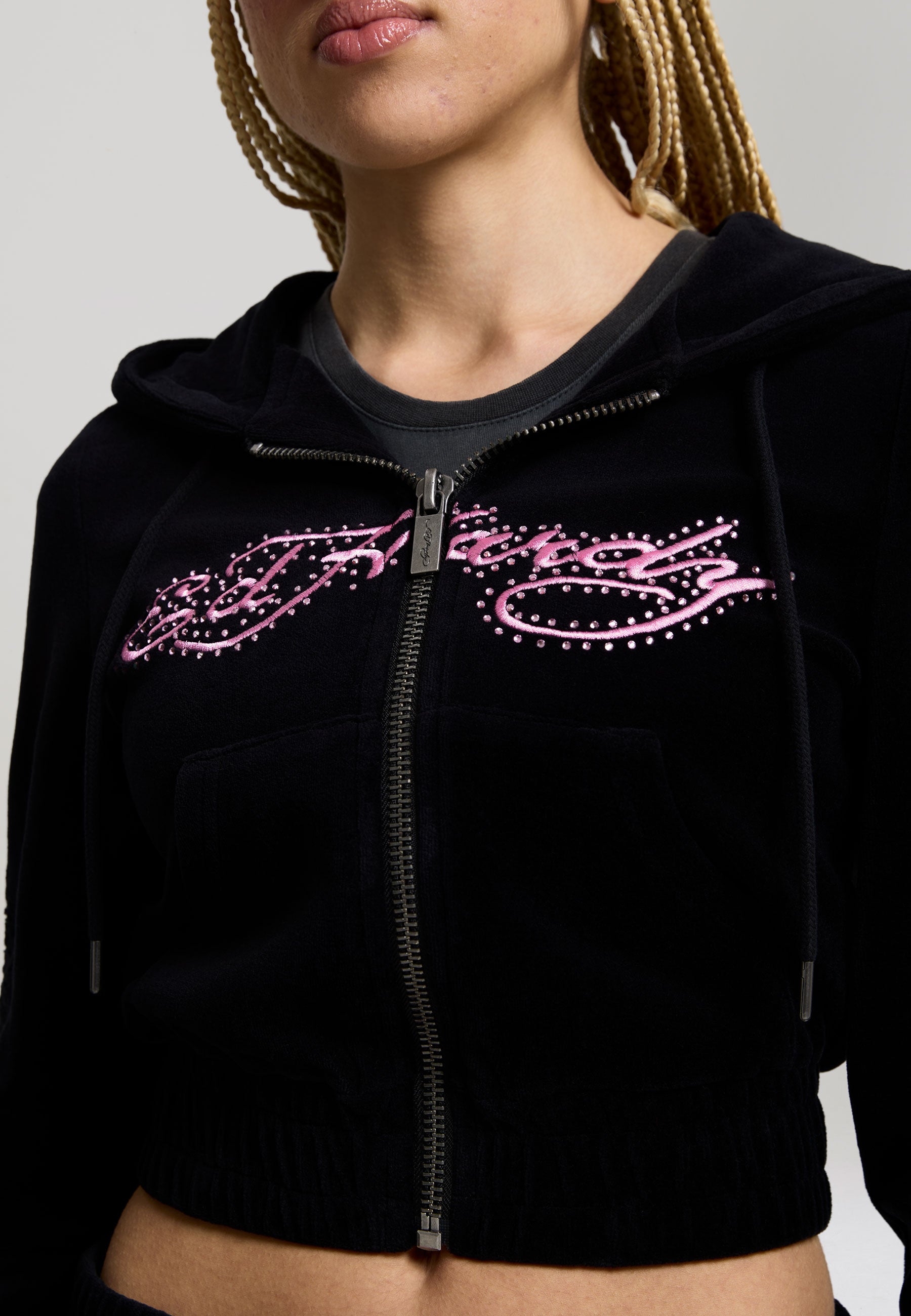 Womens Love And Thorns Diamante Velour Fitted Cropped Hoodie - Black
