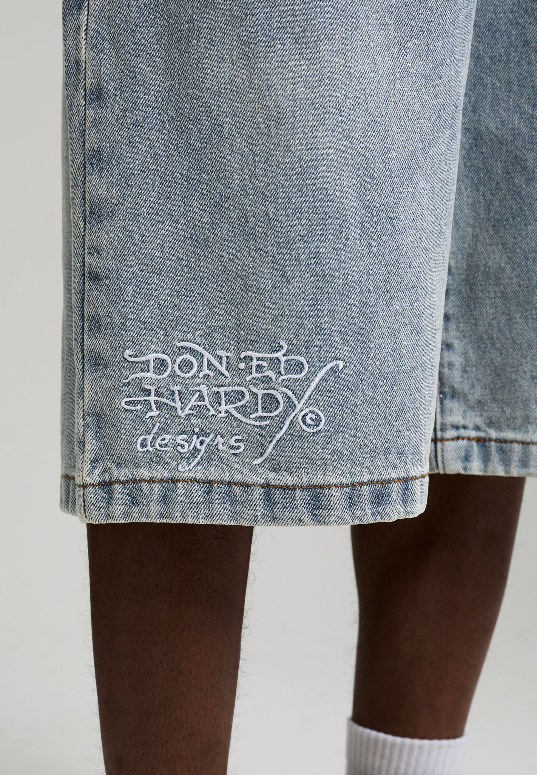 Womens Multi Badge Tattoo Denim Relaxed Jort - Bleach Denim
