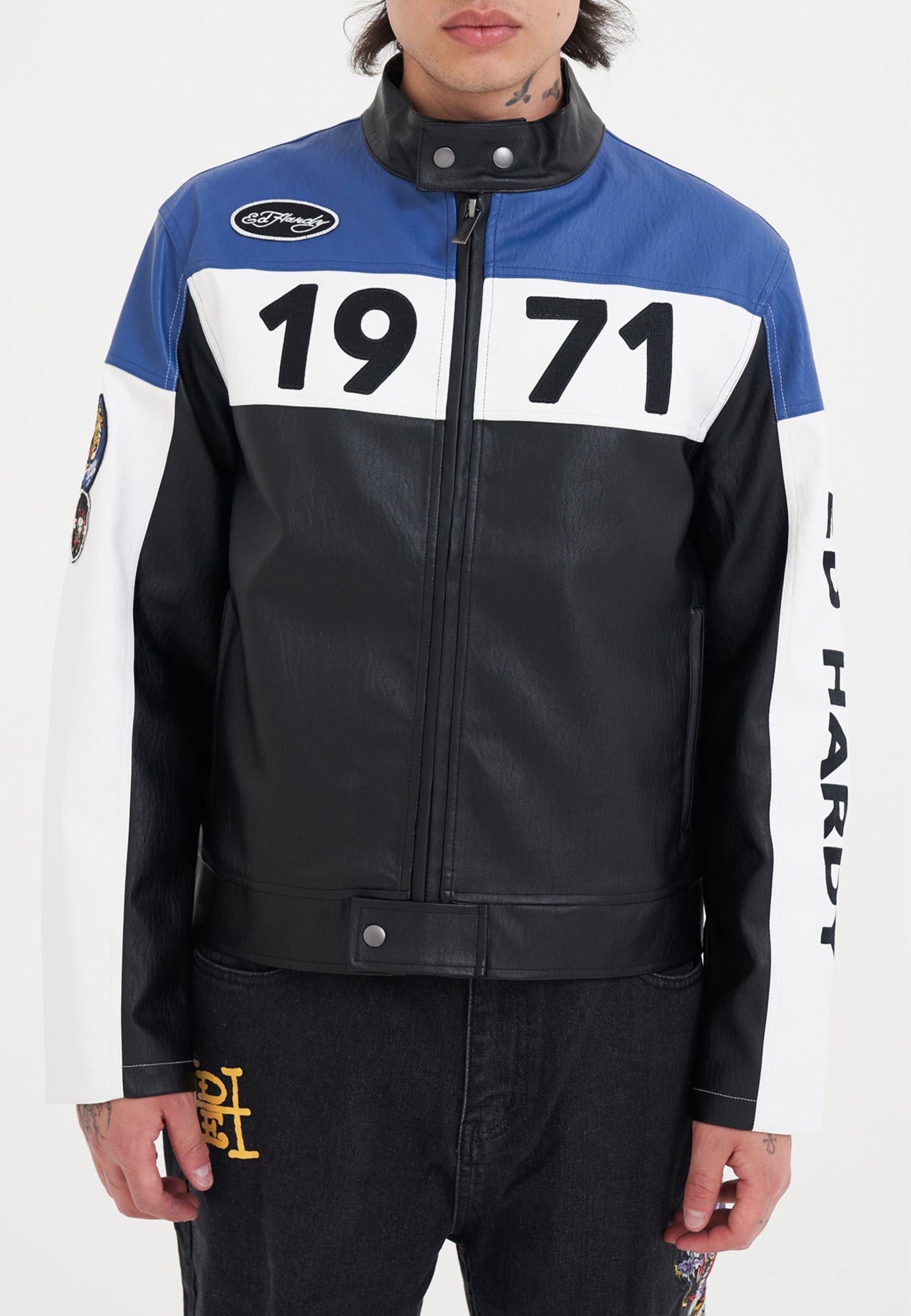 Unisex ED-1971 Moto Biker Jacket- Black/Blue/White