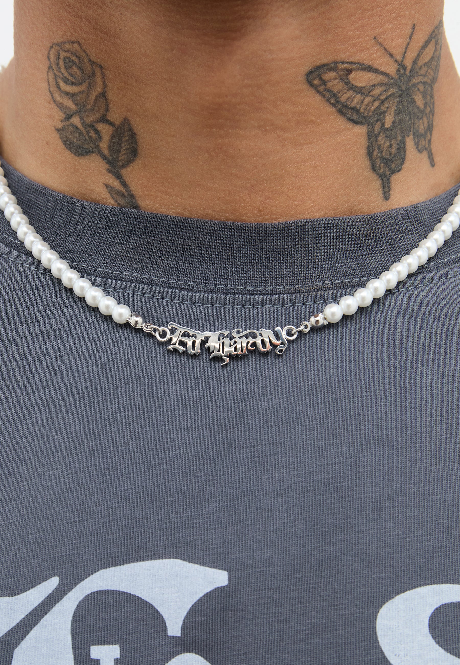 Stainless Steel Gothic Logo Pearl Necklace - Silver