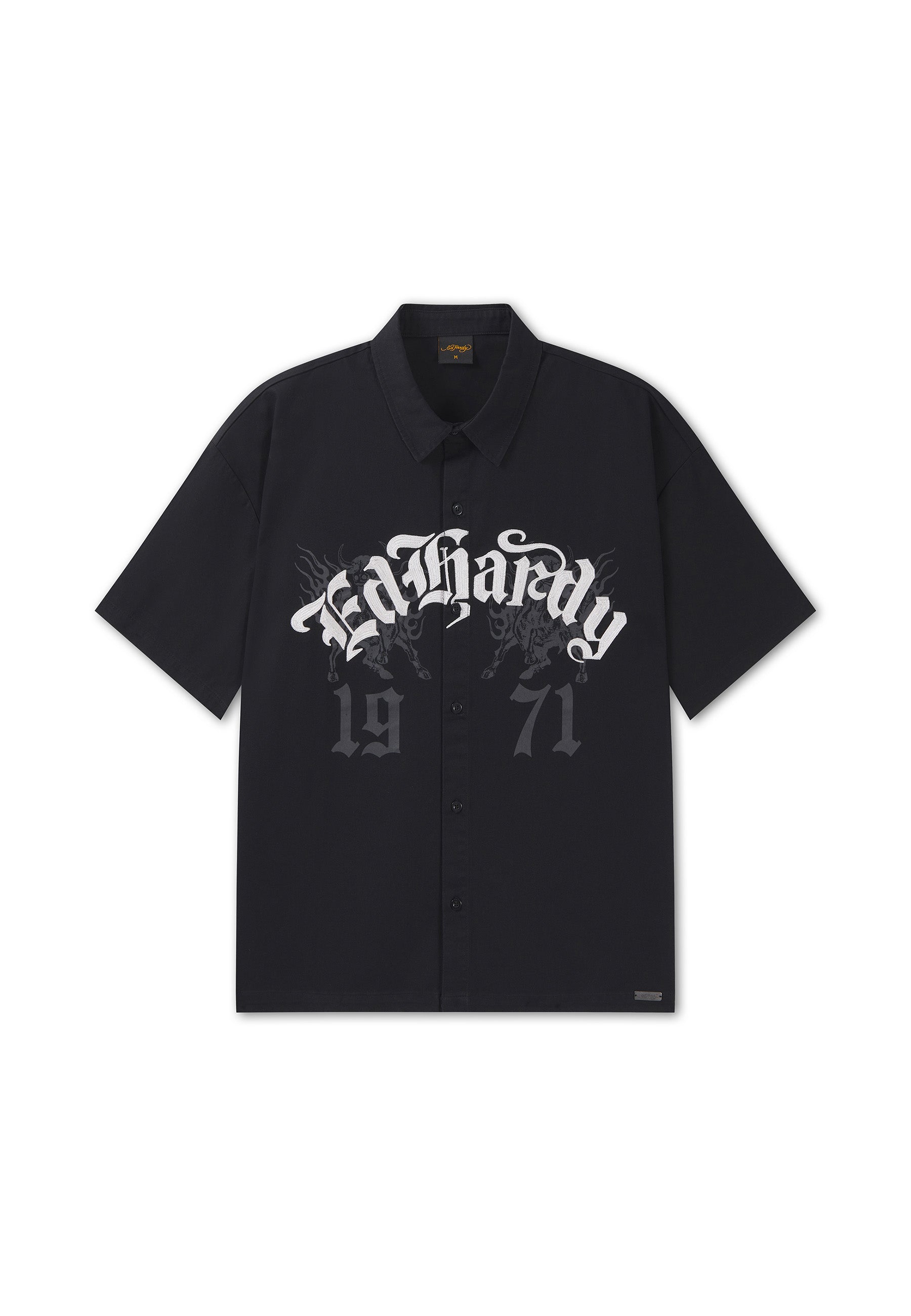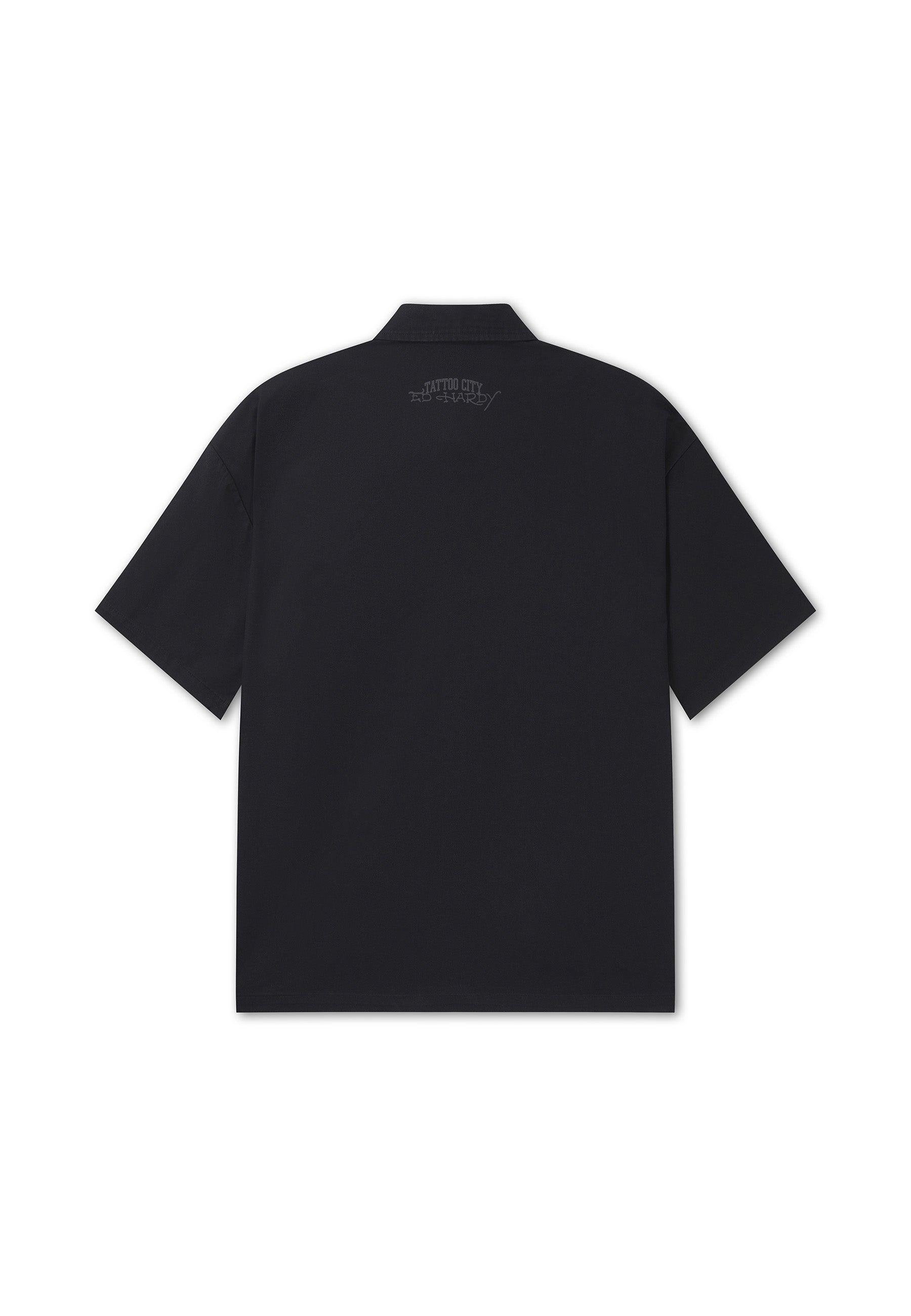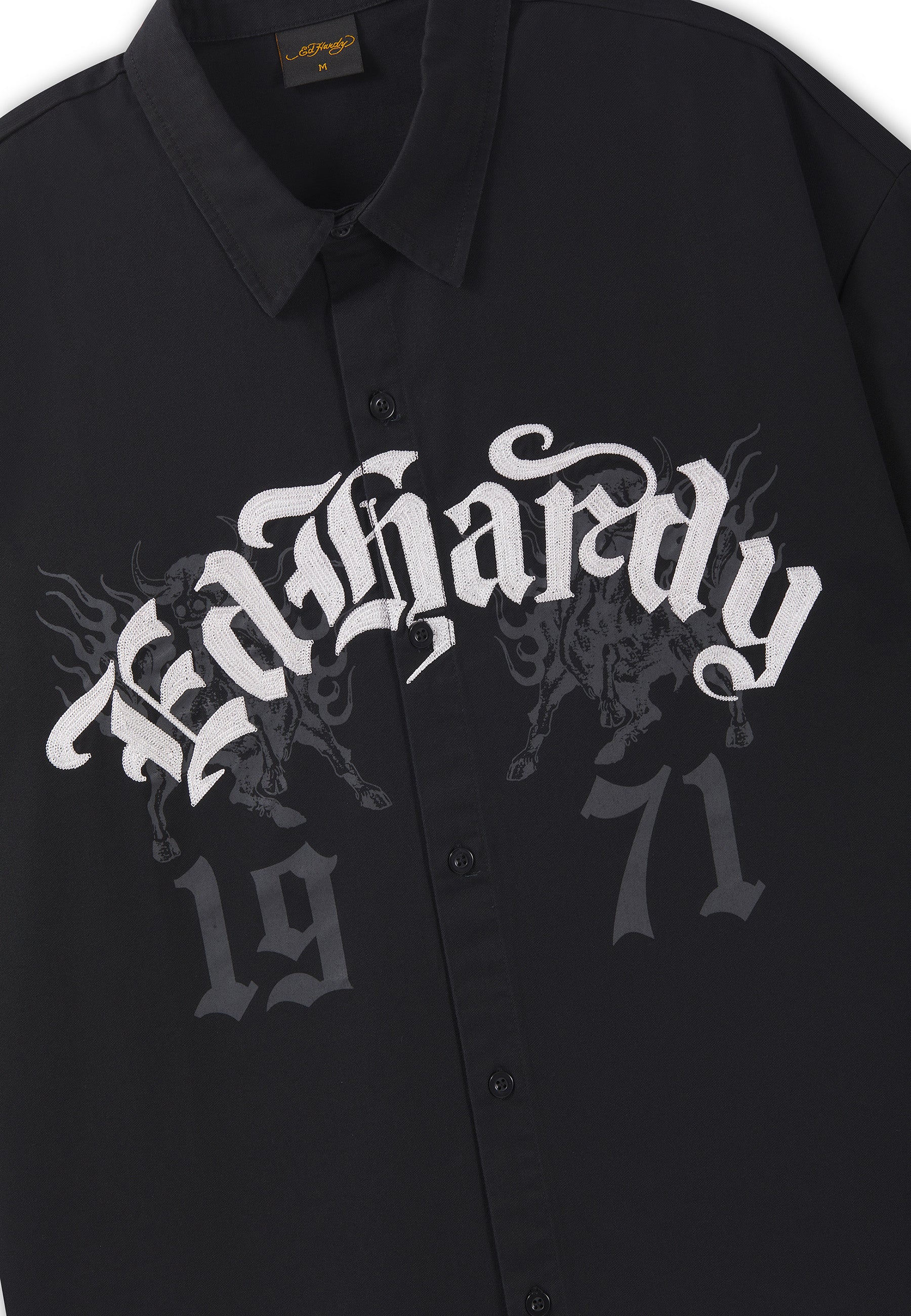 Mens Embroidered Gothic Ed Hardy Boxy Twill Shirt - Black