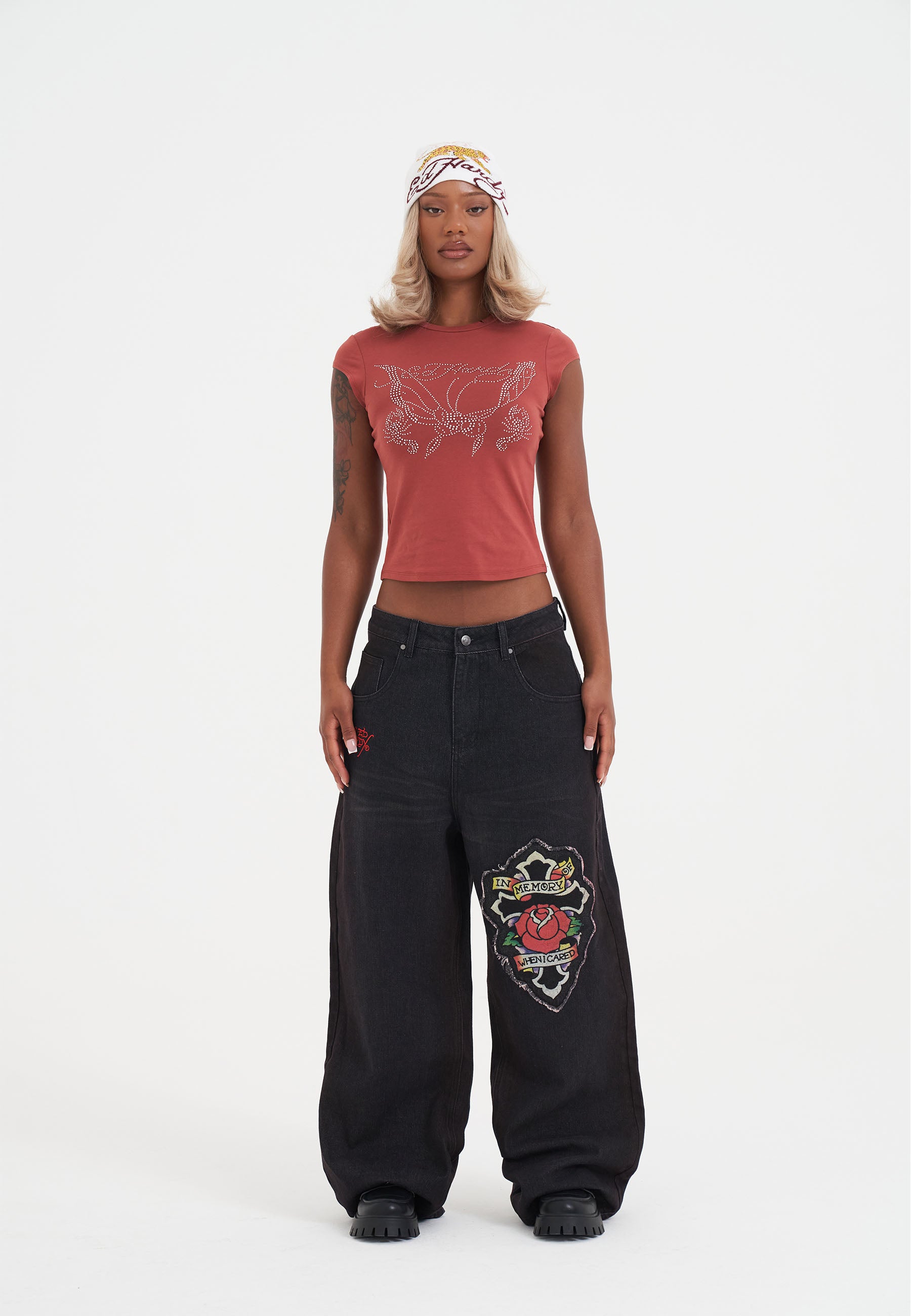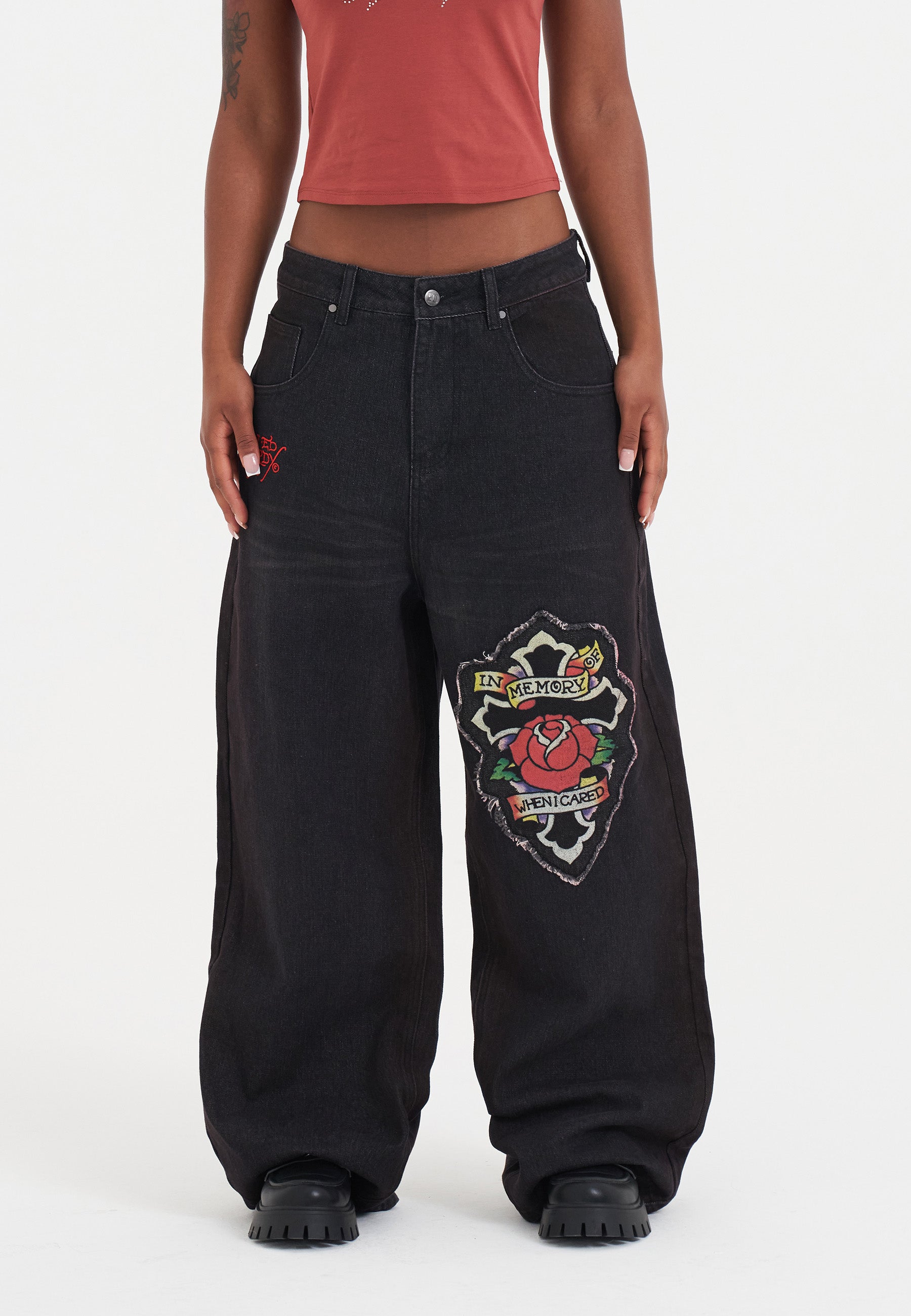 Womens Tattoo Collage Seam Detail Wide Leg Joggers - Black