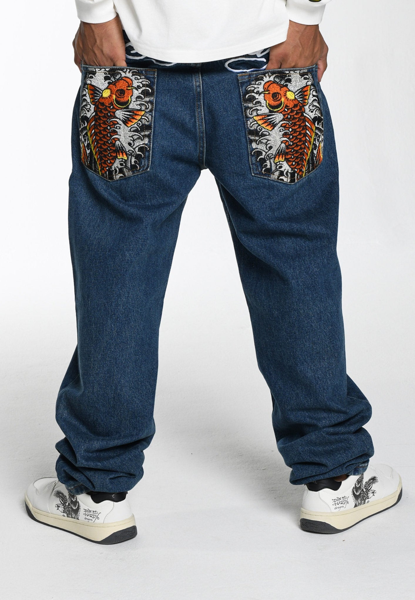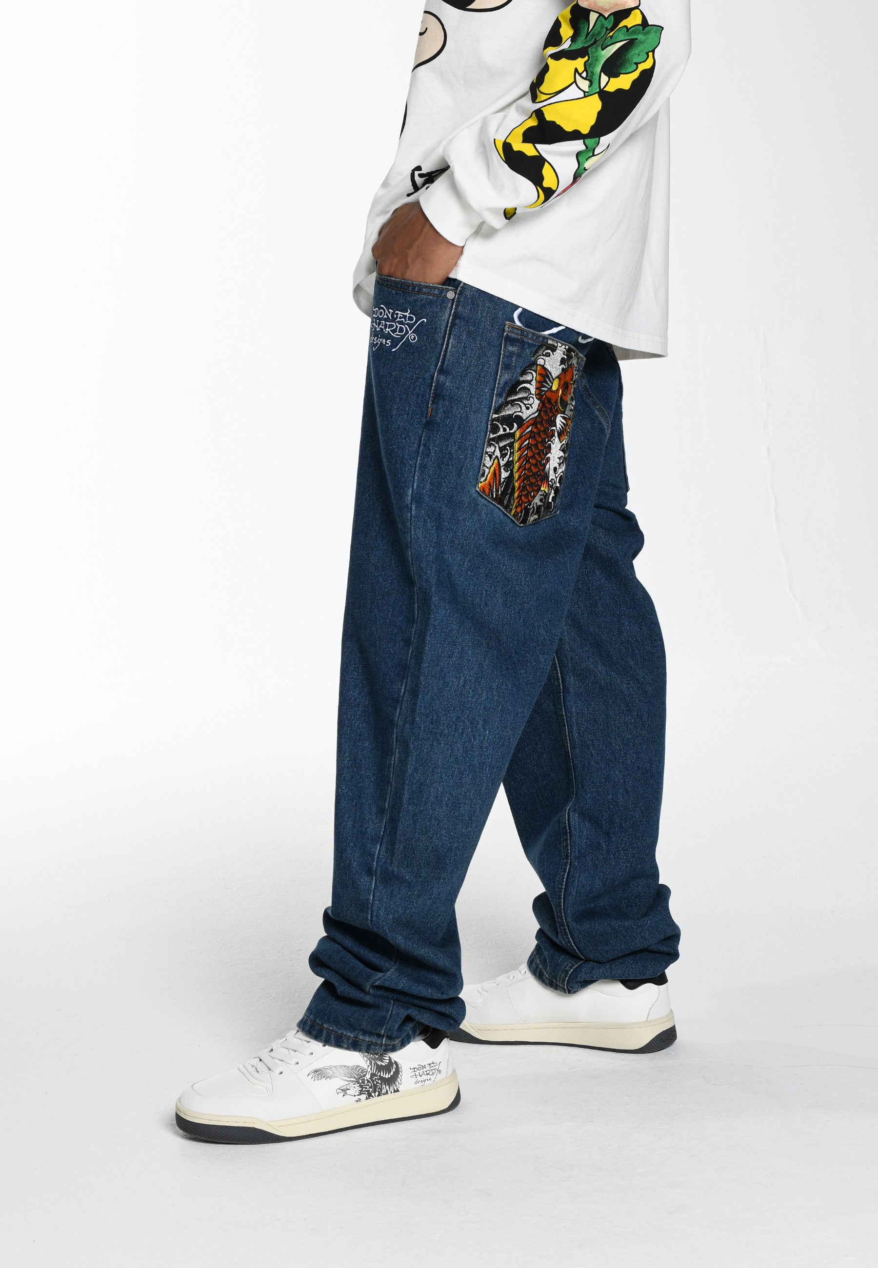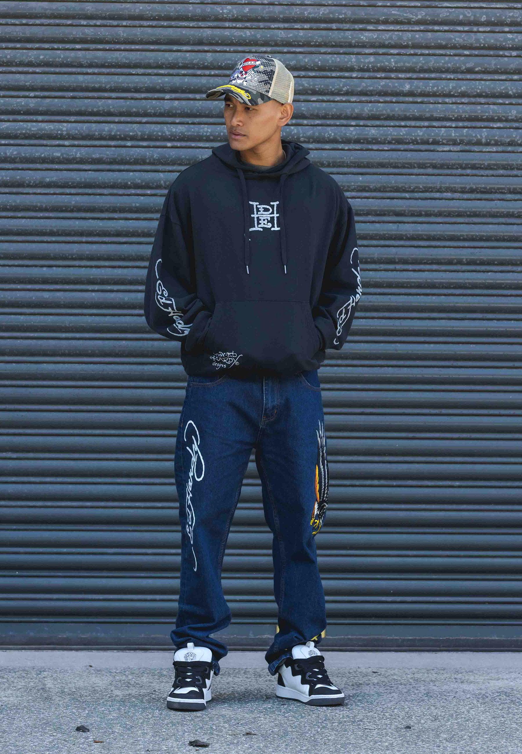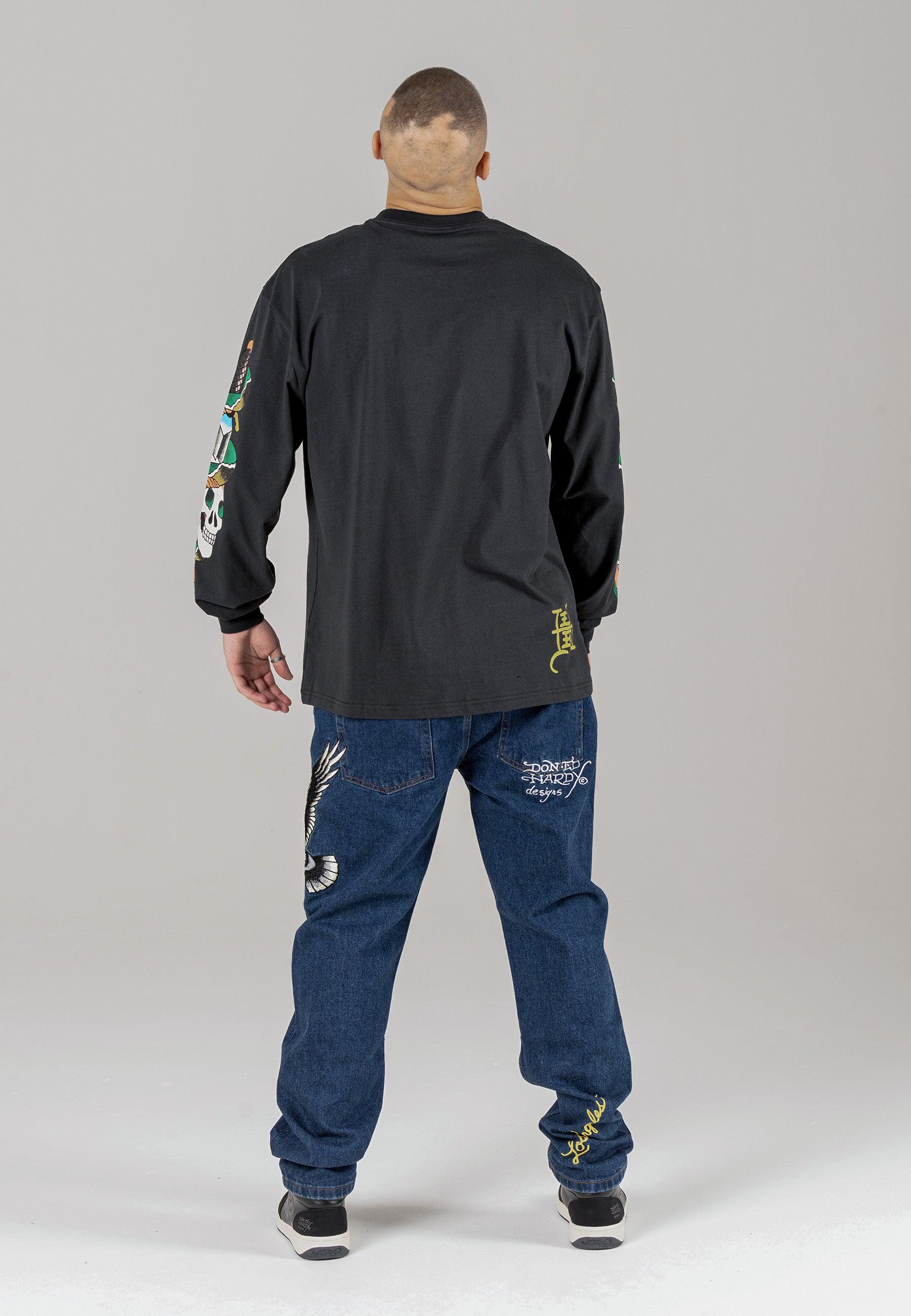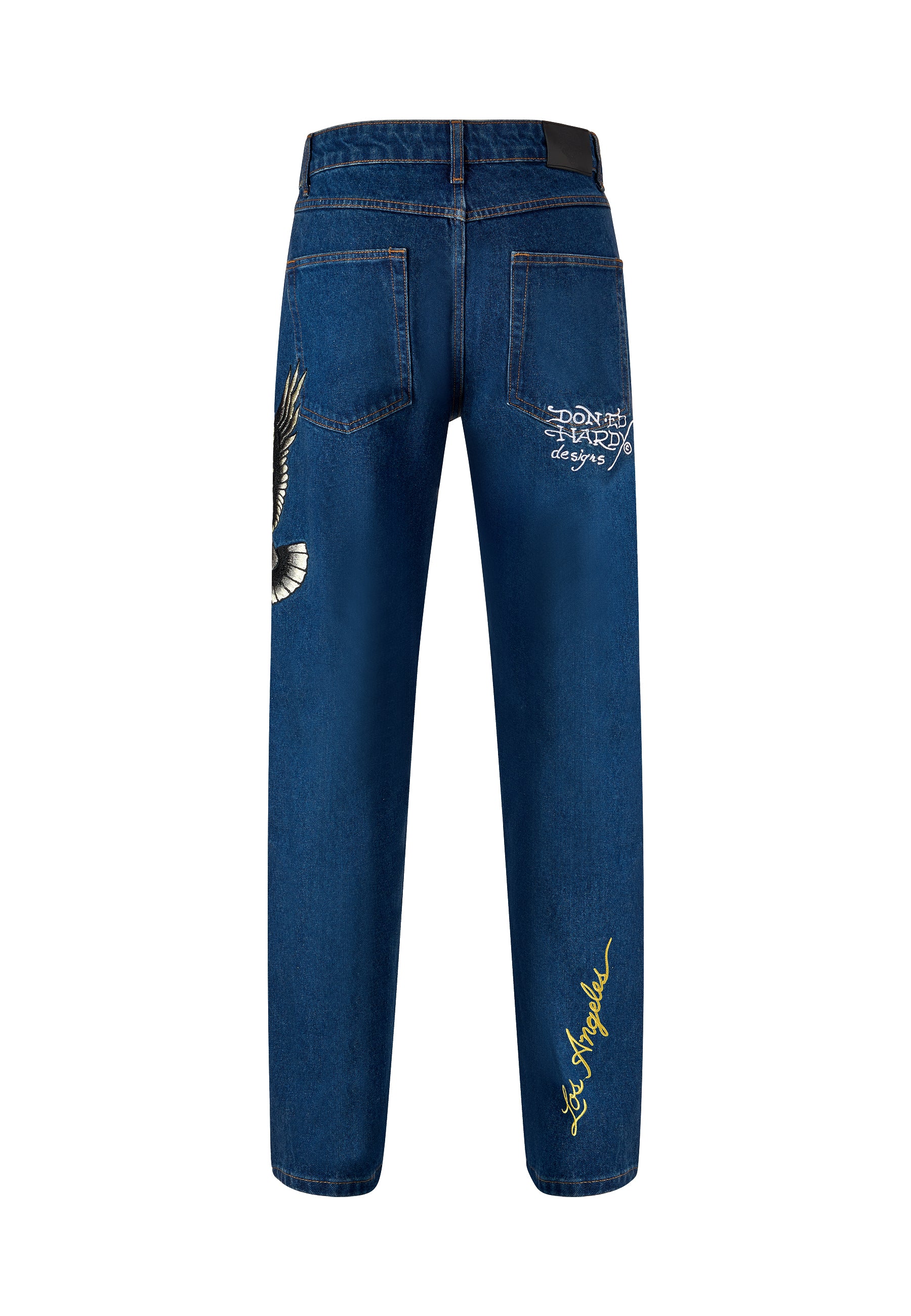 Mens Golden-Eagle Tattoo Graphic Denim Trousers Jeans - Indigo