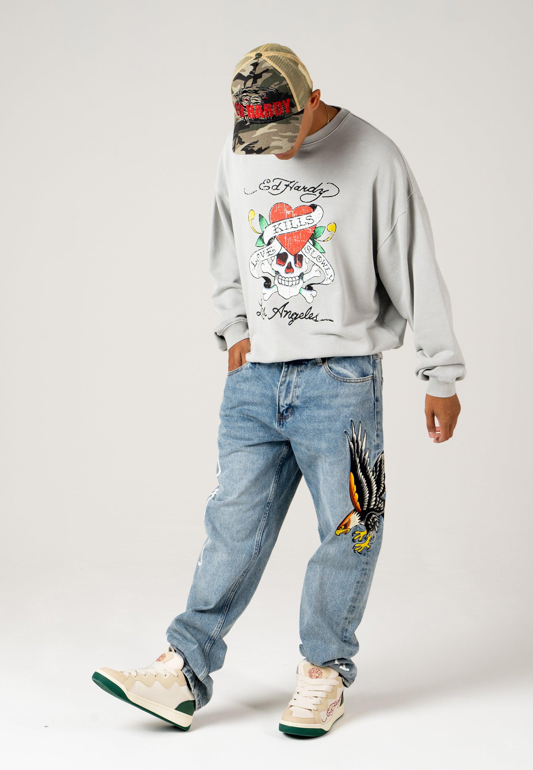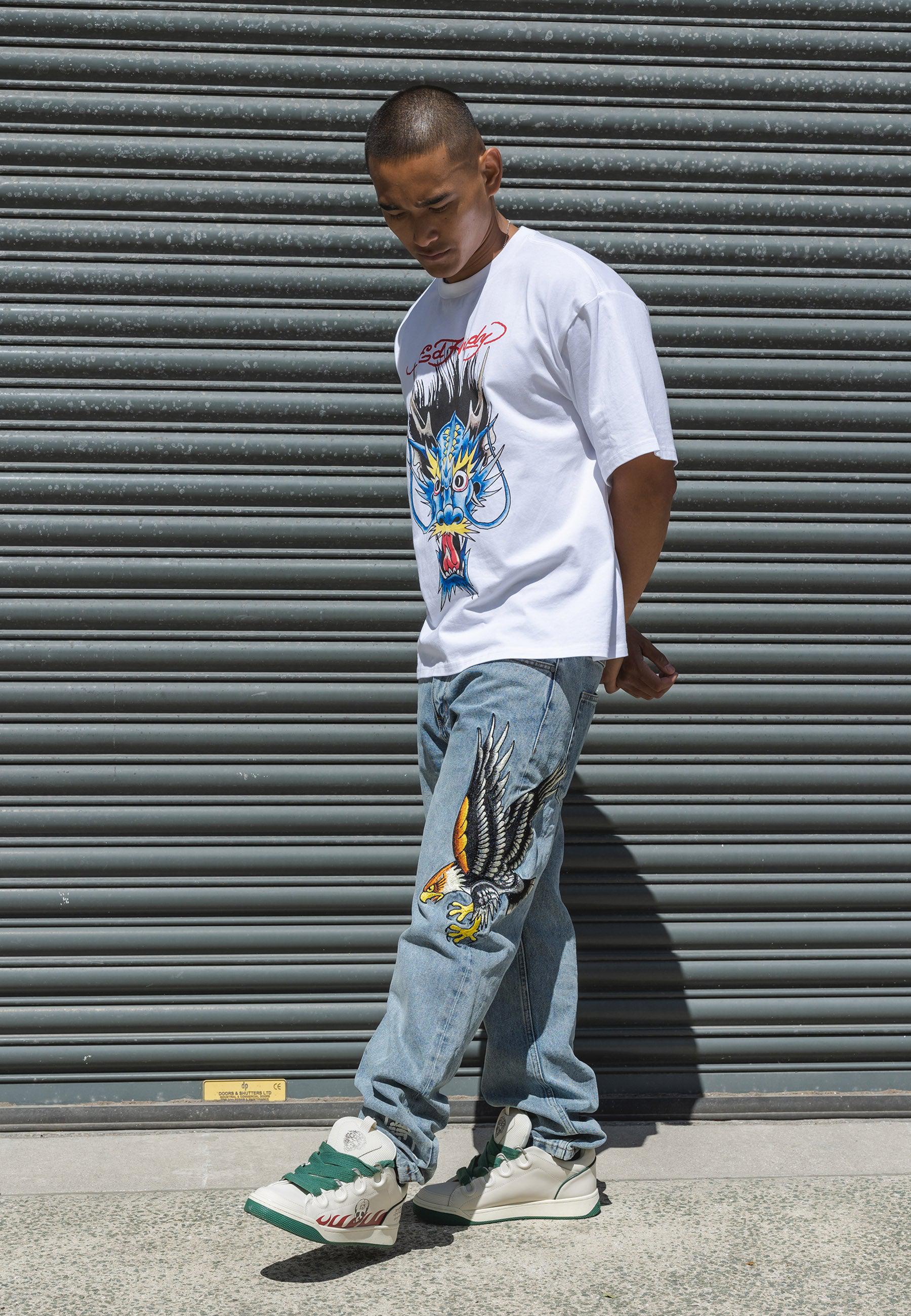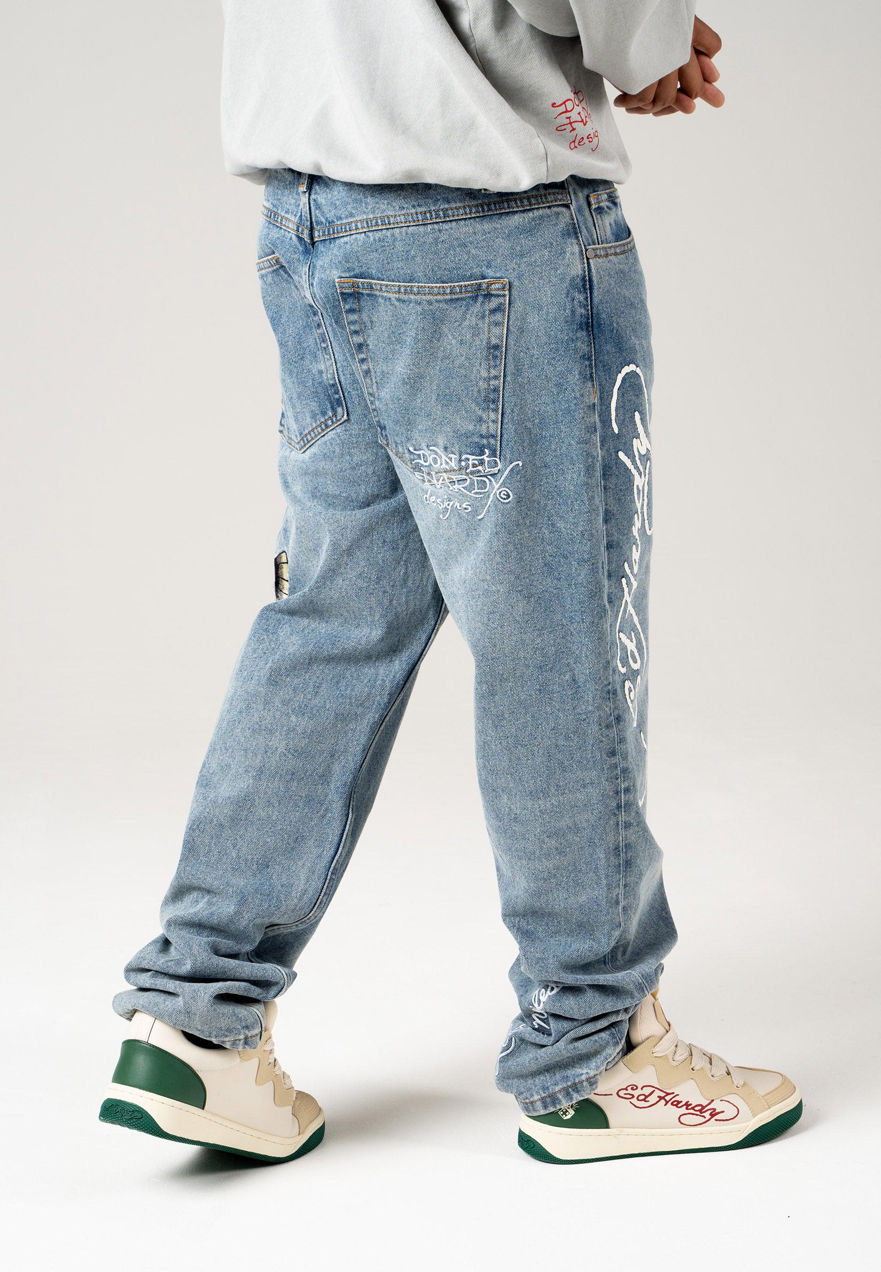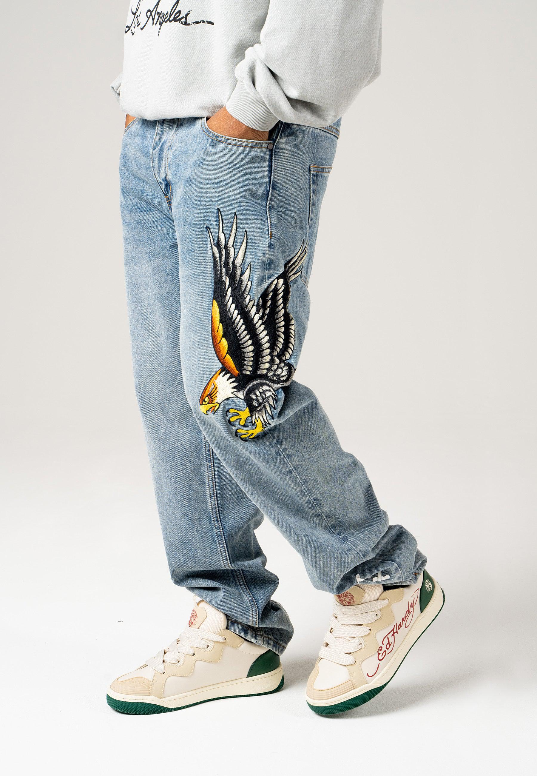With Ed Hardy’s iconic logo emblazoned on the right leg and a detail-rich, embroidered golden eagle graphic, Ed Hardy’s unique take on denim is truly something special. With a contemporary twist on a classic eagle tattoo, these bleach wash jeans provide utility, as well as style, as all high-quality denim should.100%COTTON DENIM.