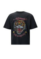 With a vivid, fierce LA tiger print centrally located on the front and a crimson variant of the iconic Ed Hardy logo above it, this washed-black T-shirt combines vintage tattoo design with modern style.