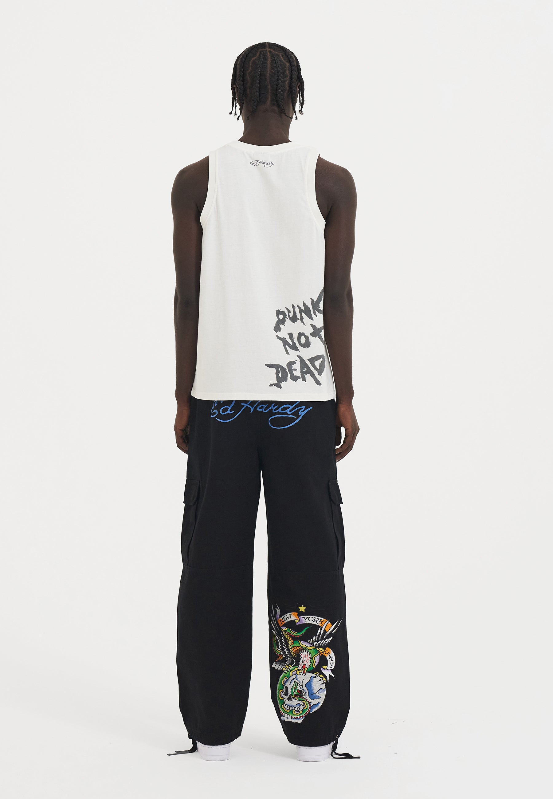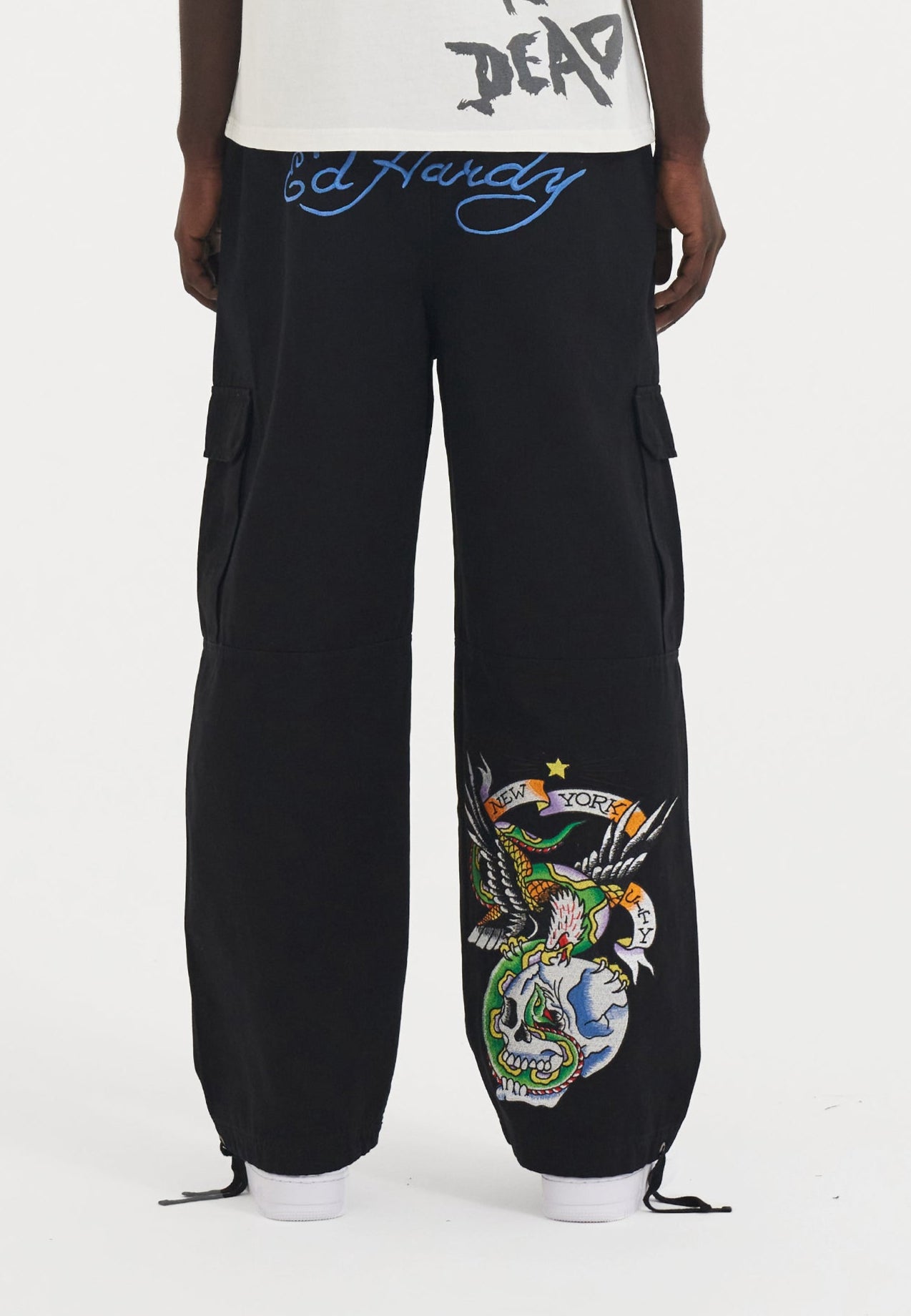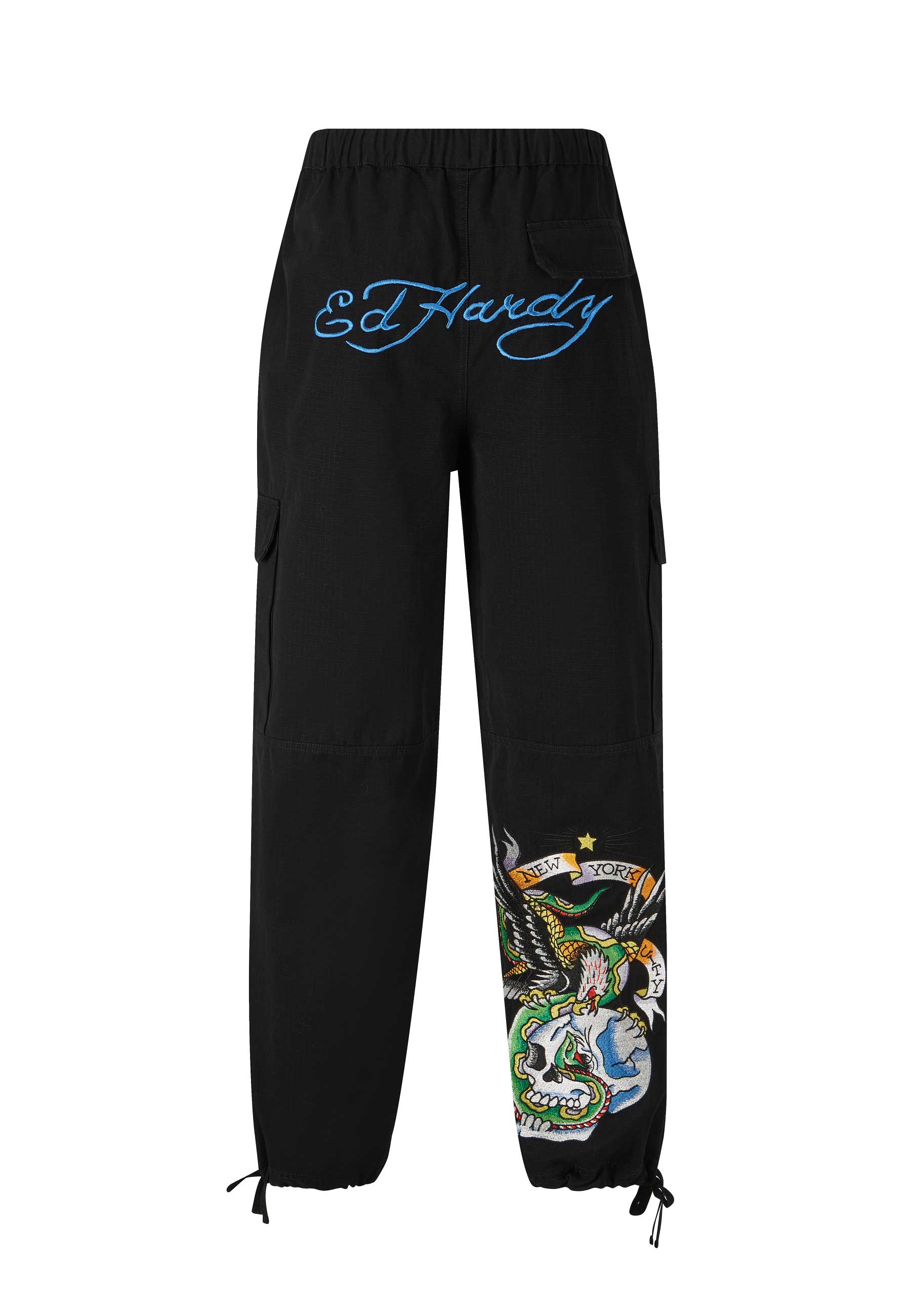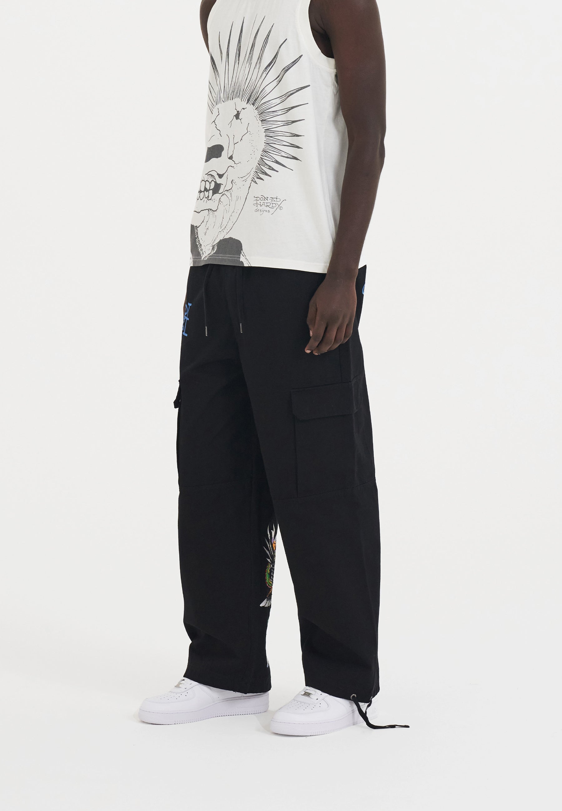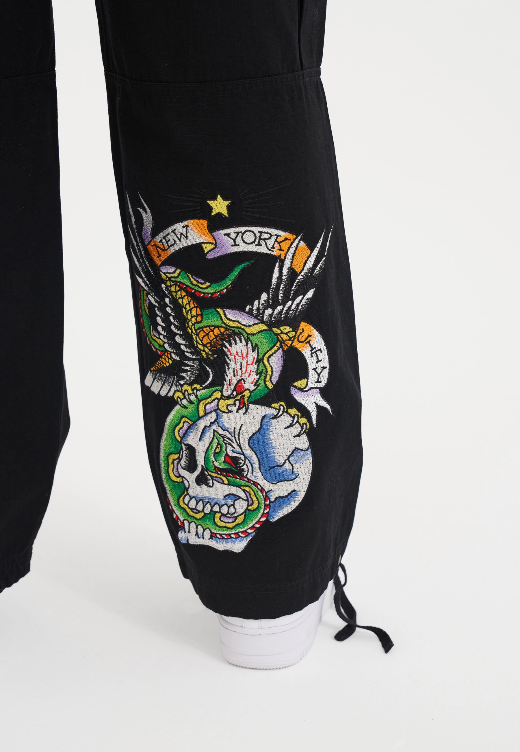 These lightweight and adaptable cargos bear the unmistakable mark of Ed Hardy, showcasing his legendary vibrant sketchbook illustrations re-mastered in embroidery.