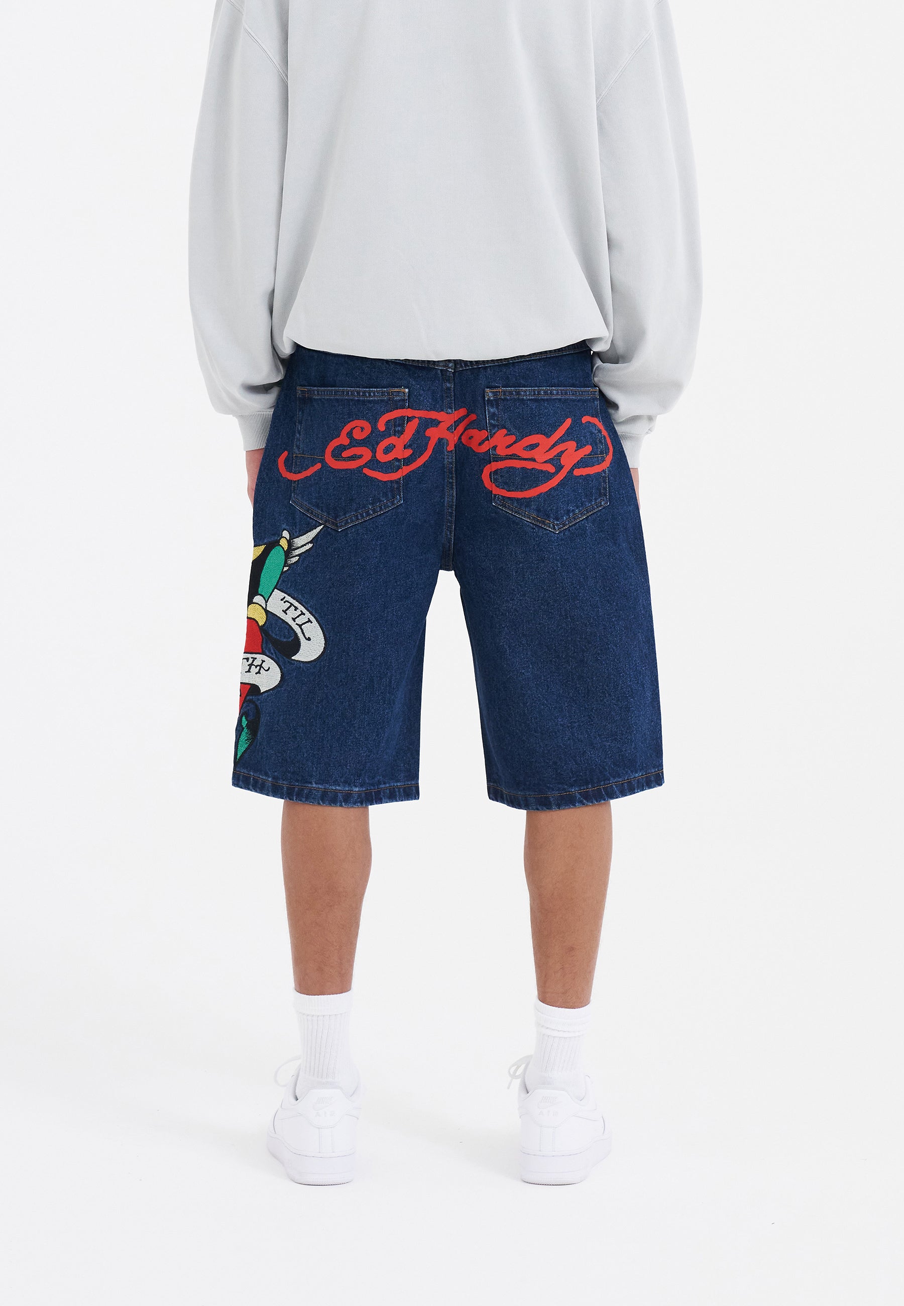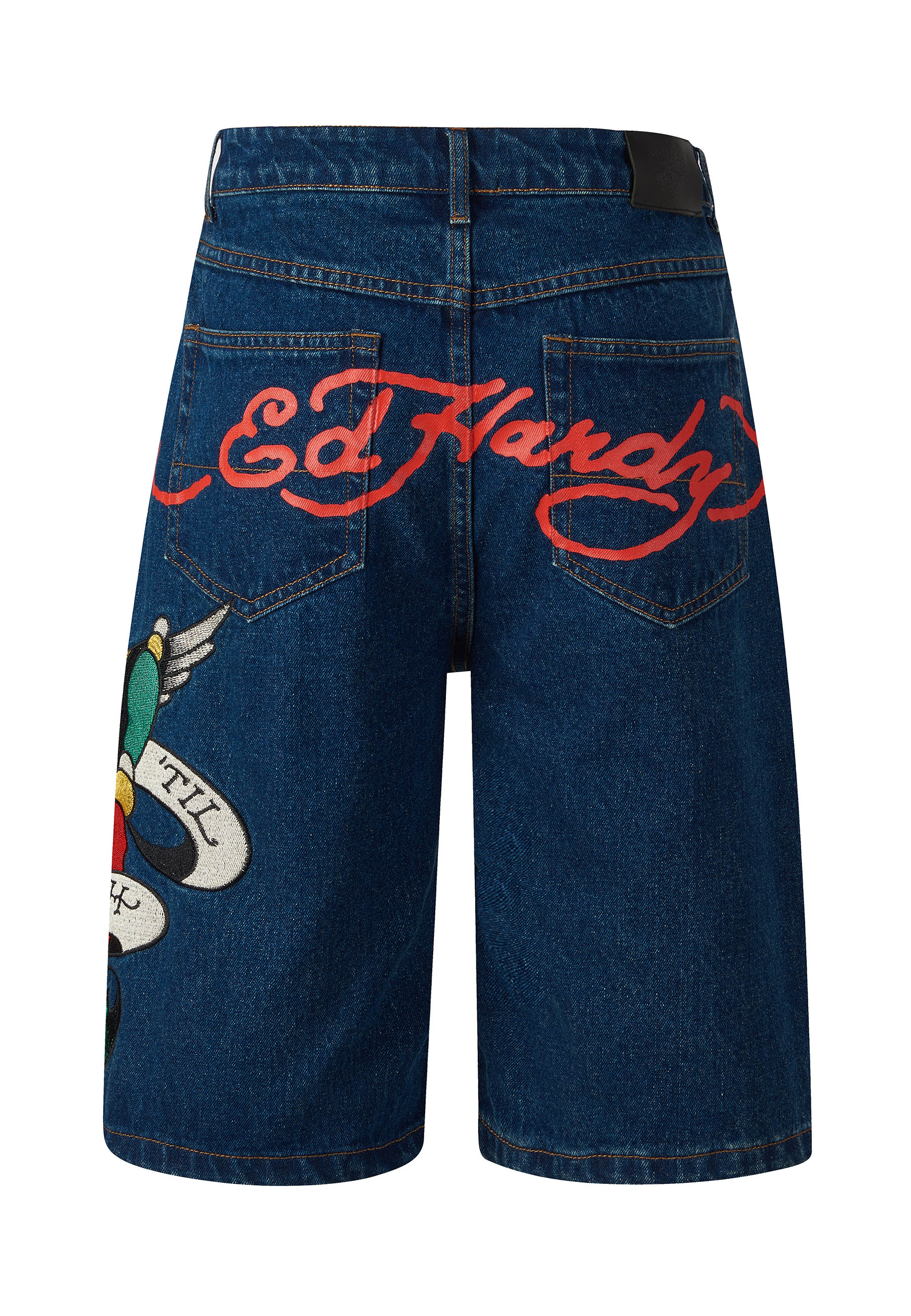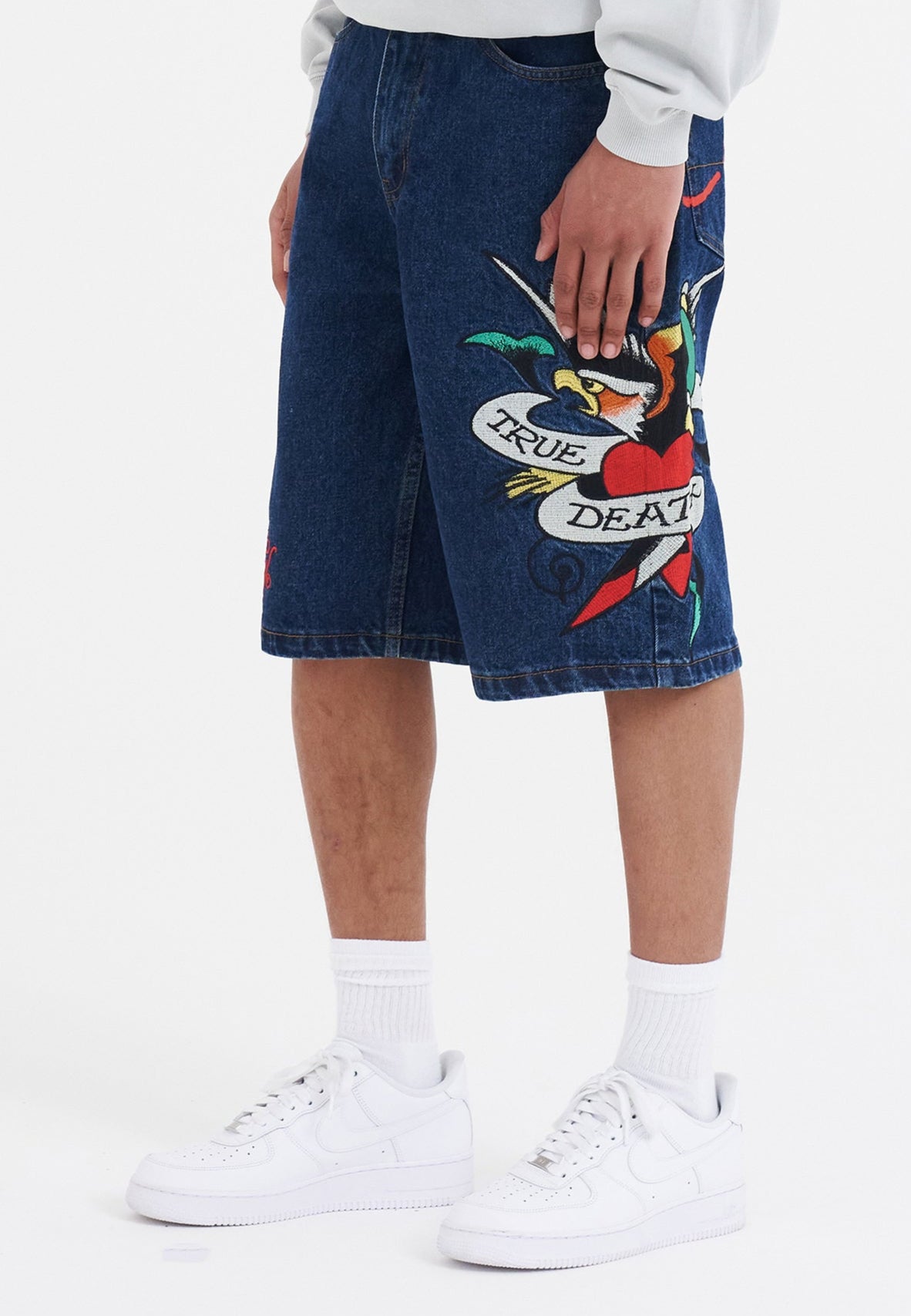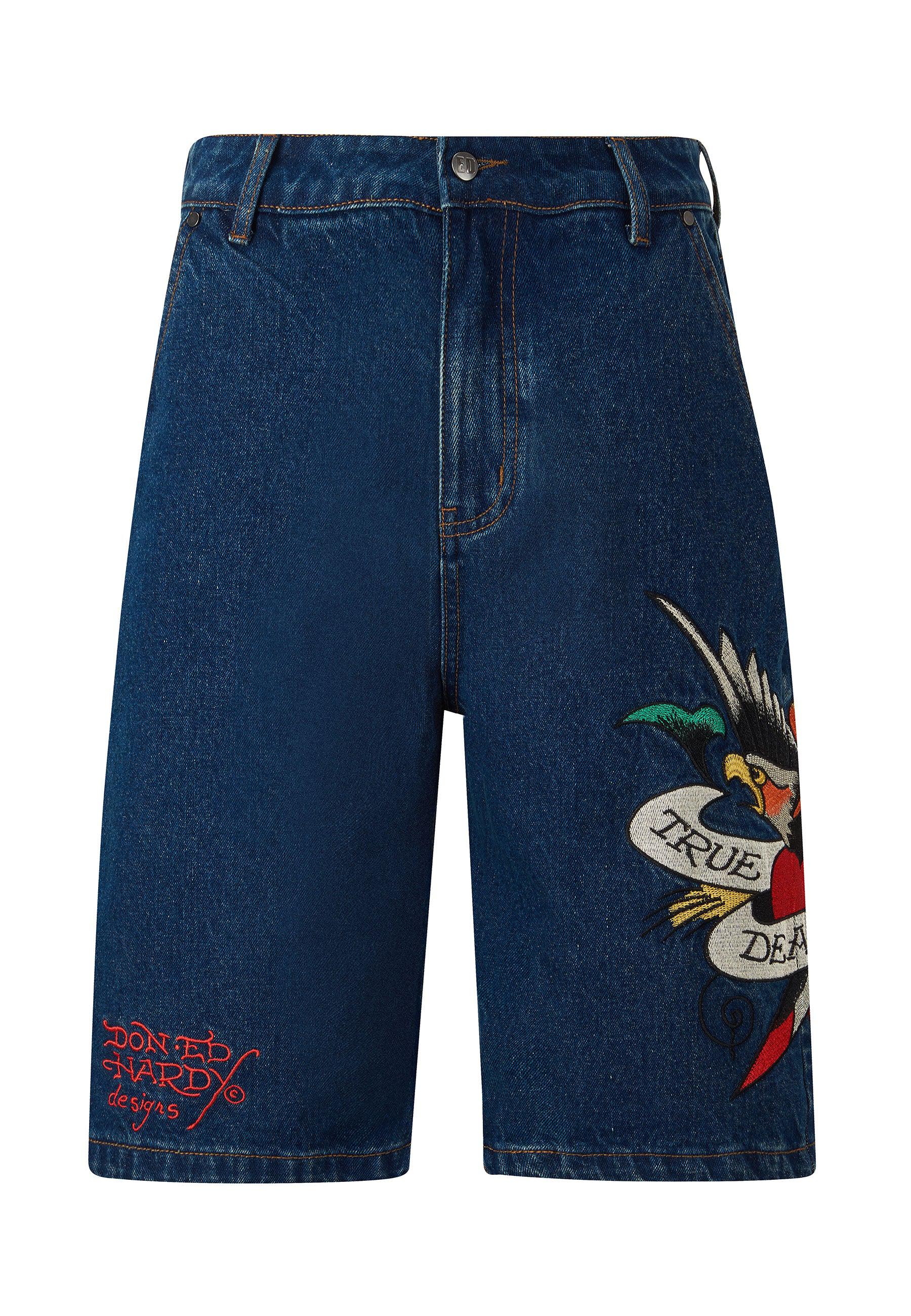 Featuring a crimson variation of Ed Hardy’s classic logo across the upper back and a vivid “TRUE TIL DEATH” eagle heart tattoo graphic embroidered on the left leg, these indigo shorts are an absolute Ed Hardy summer must-have.