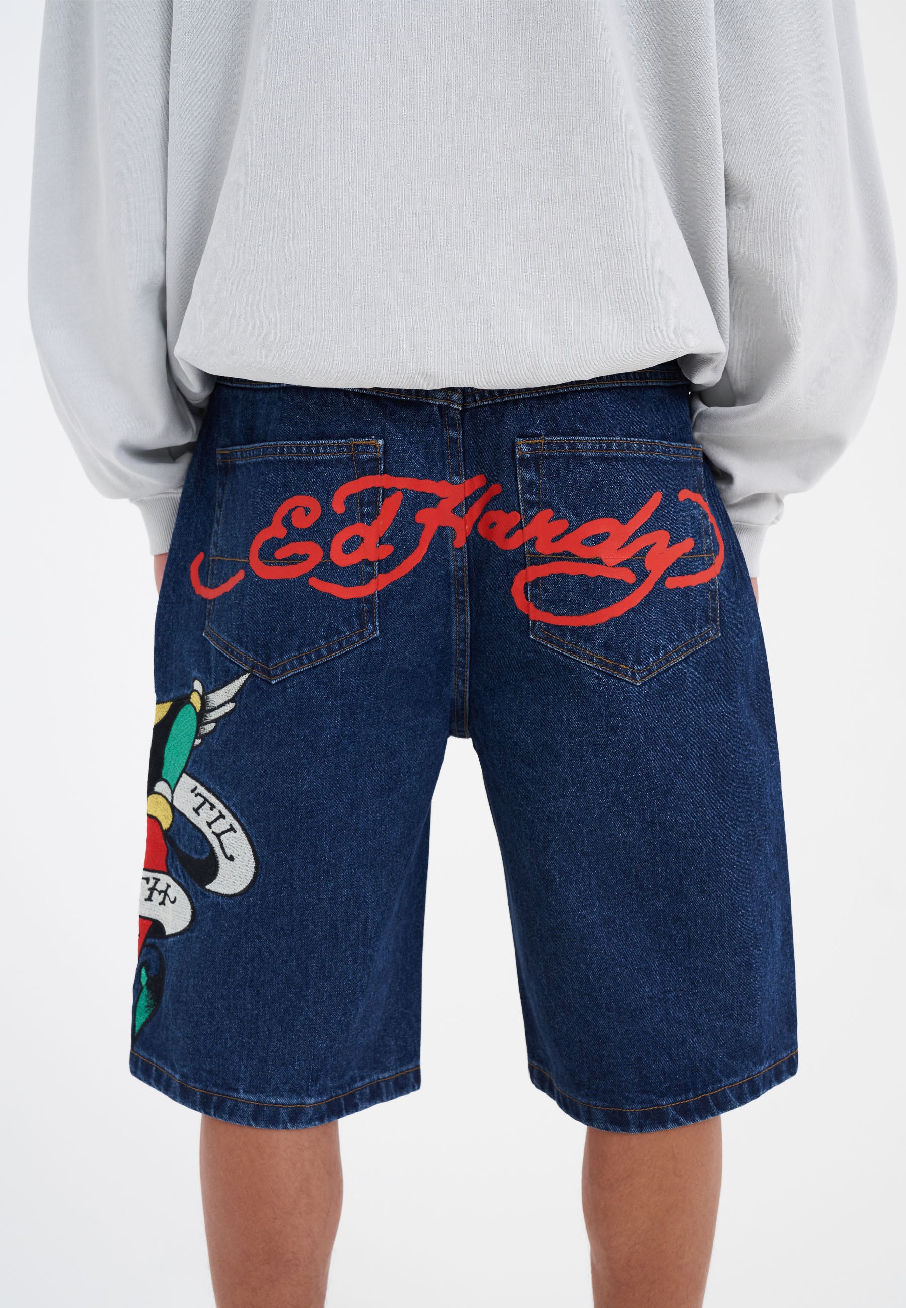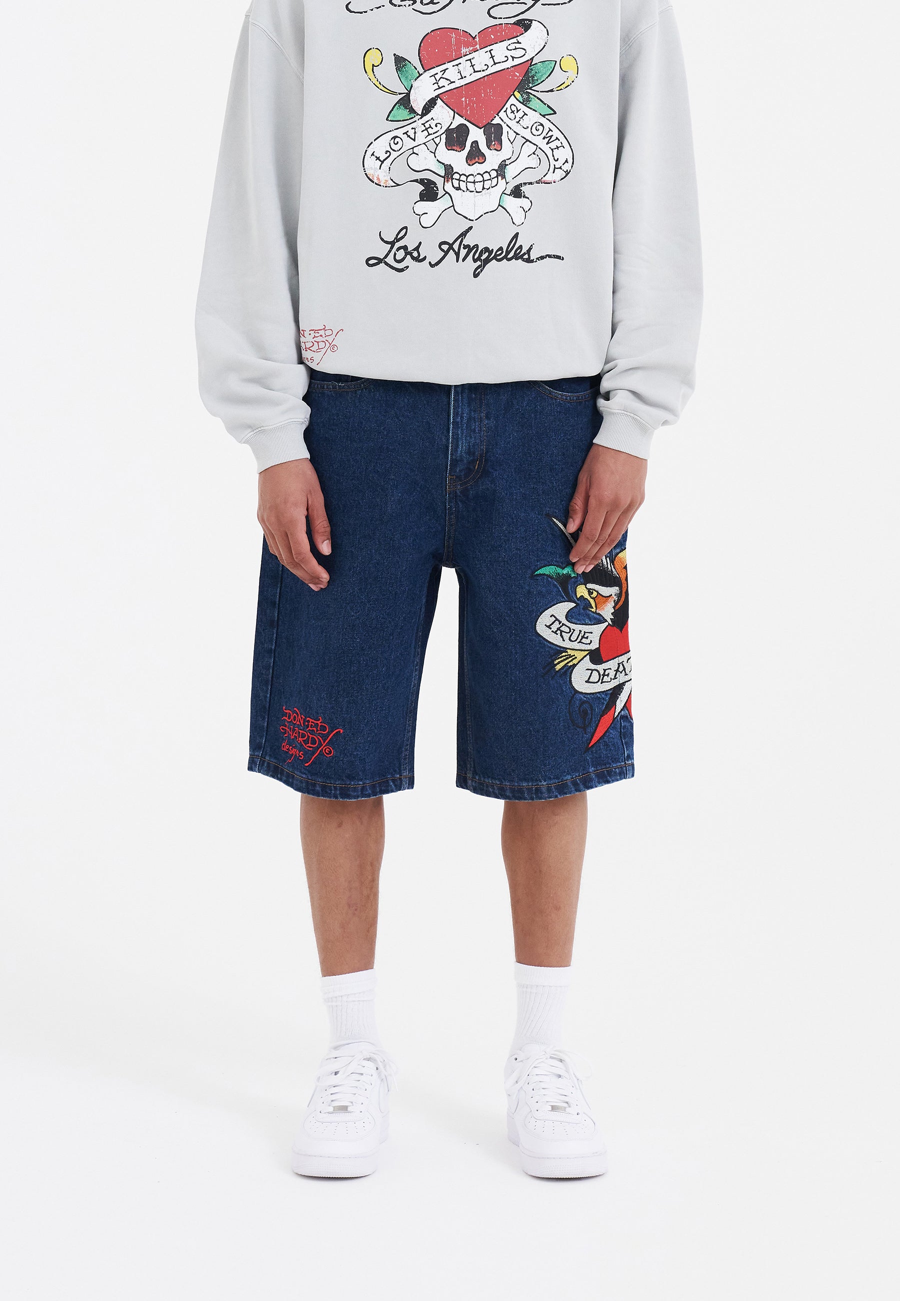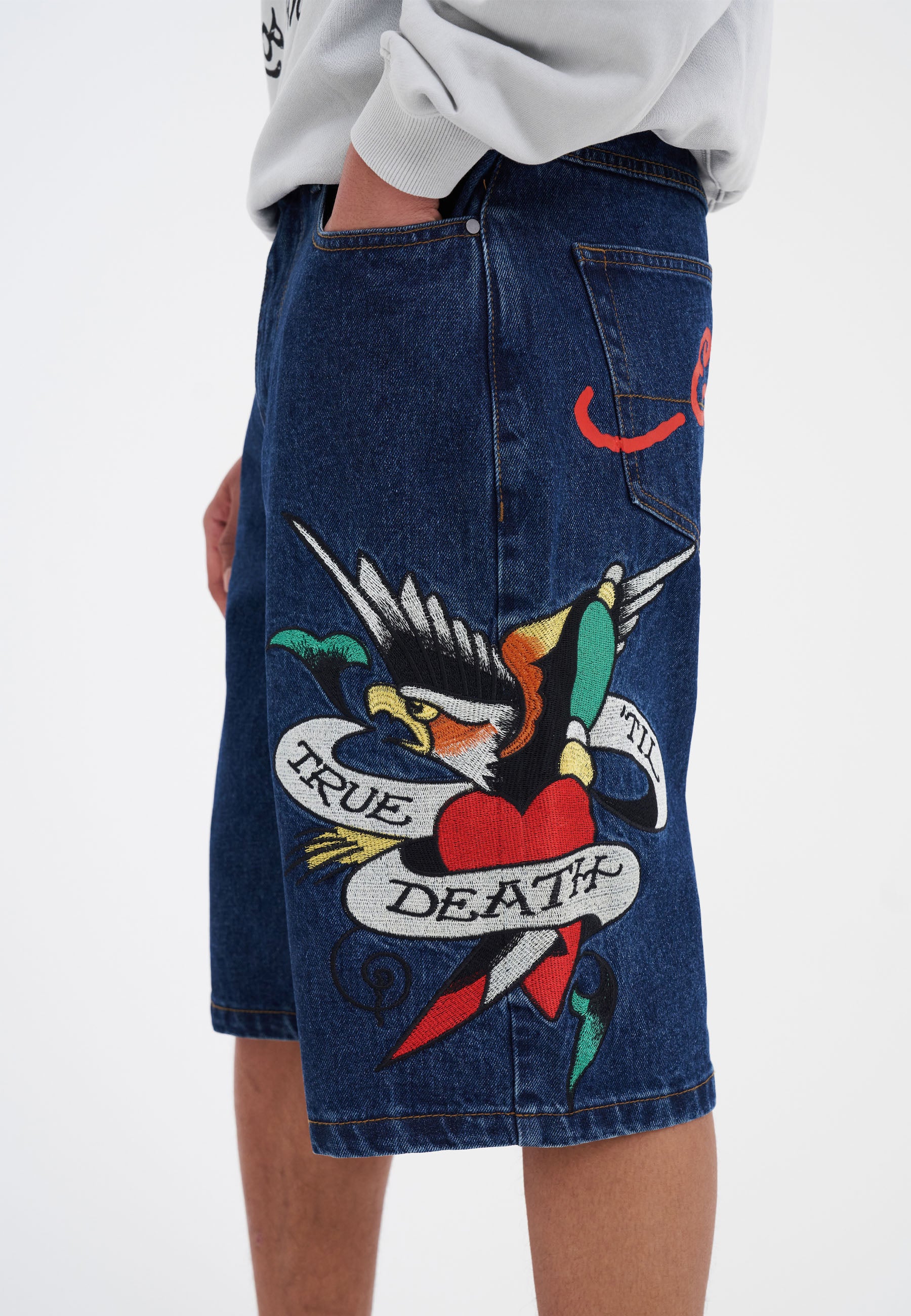 Featuring a crimson variation of Ed Hardy’s classic logo across the upper back and a vivid “TRUE TIL DEATH” eagle heart tattoo graphic embroidered on the left leg, these indigo shorts are an absolute Ed Hardy summer must-have.