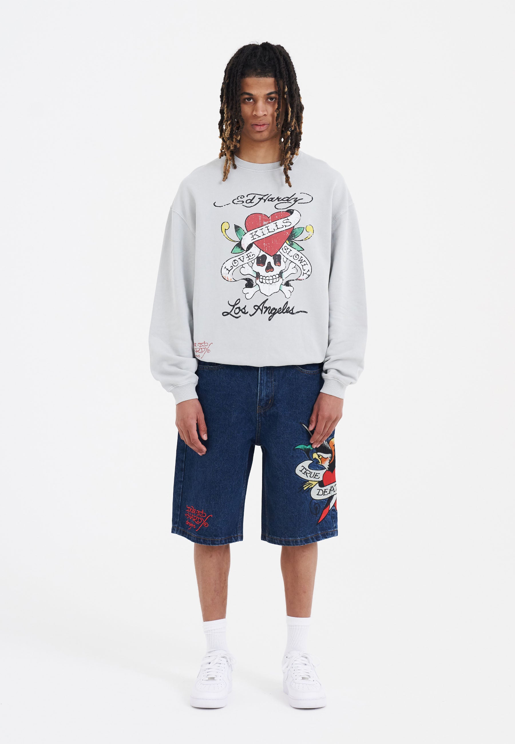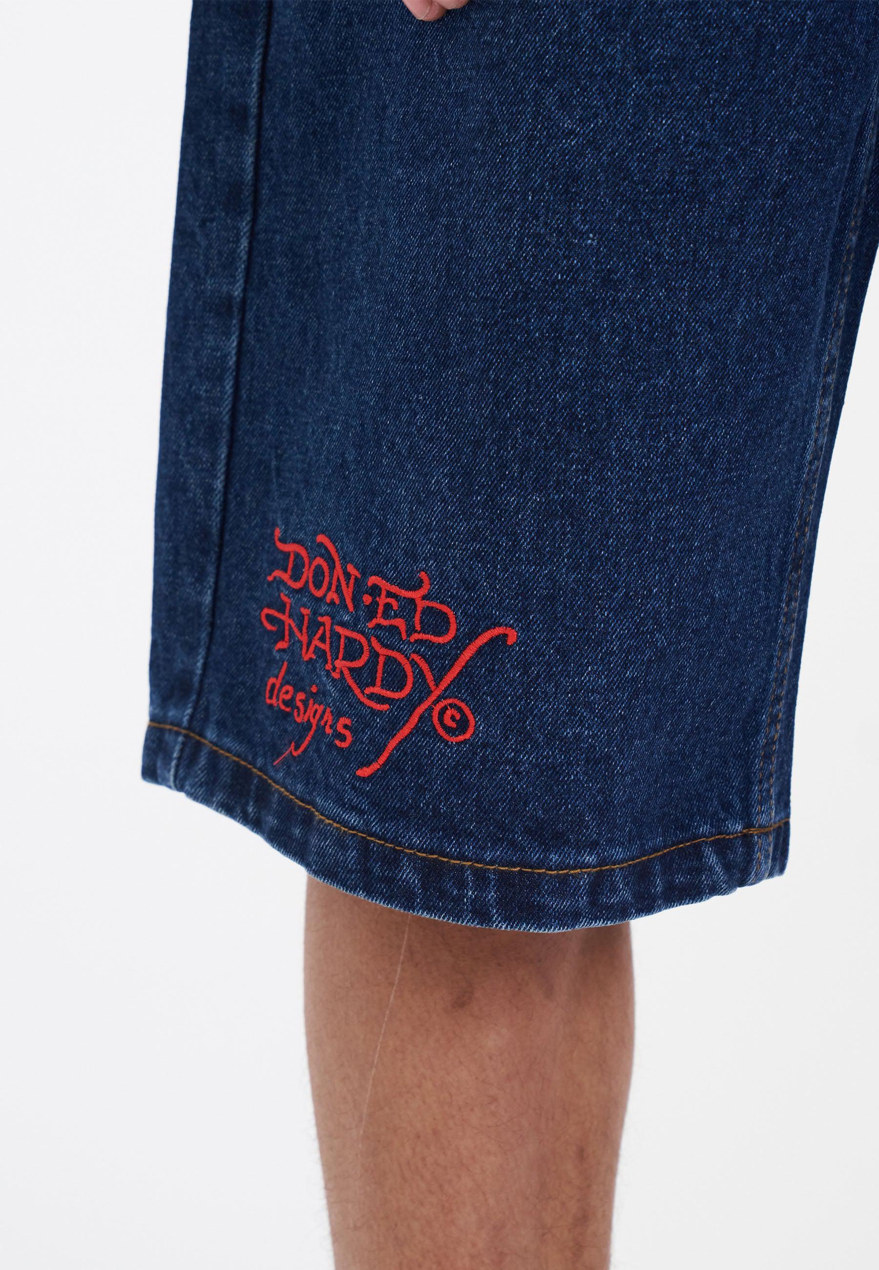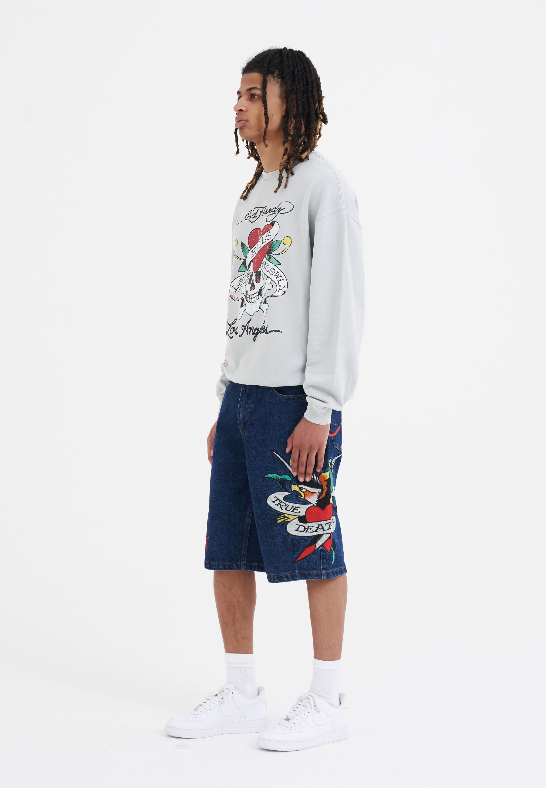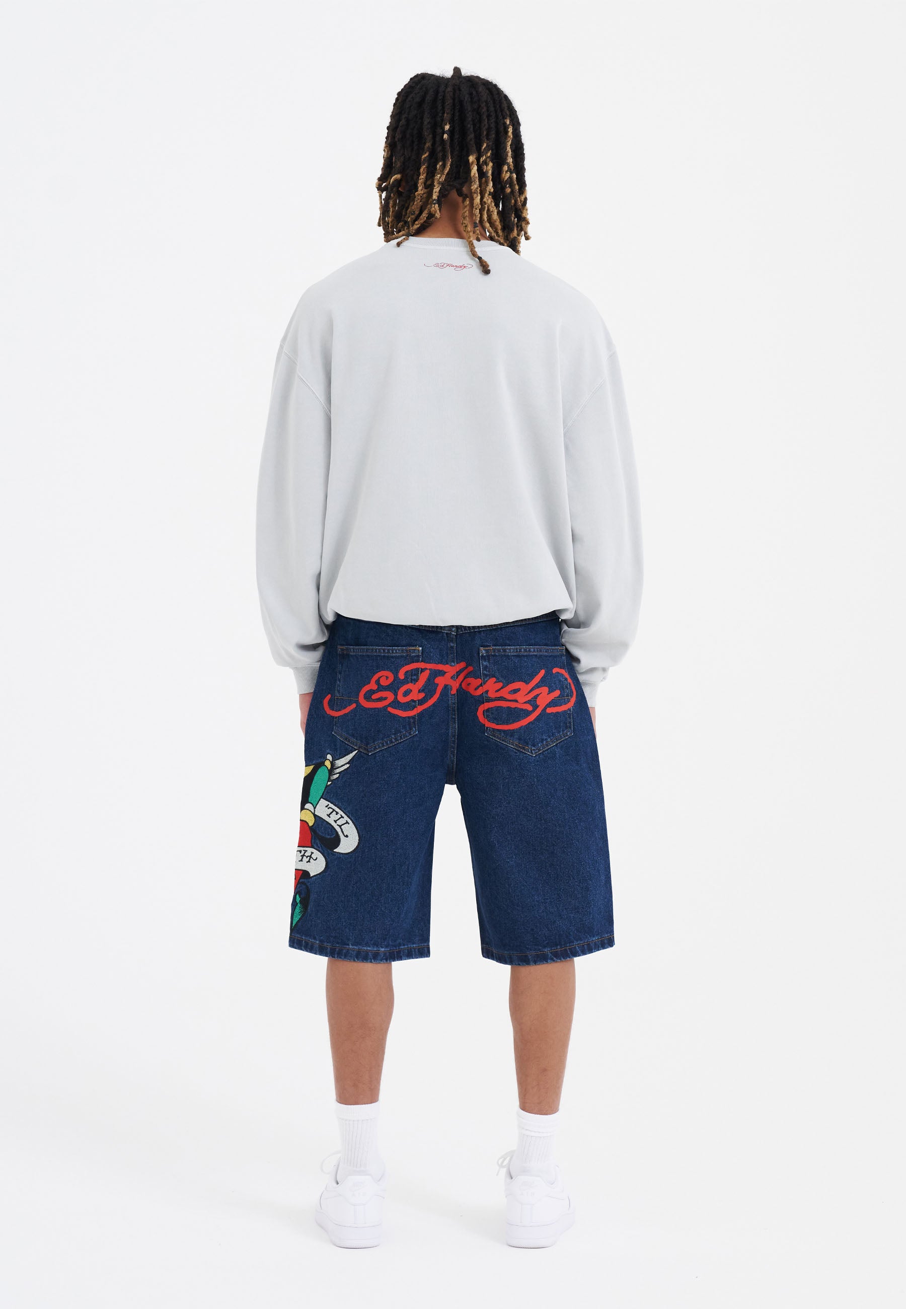 Featuring a crimson variation of Ed Hardy’s classic logo across the upper back and a vivid “TRUE TIL DEATH” eagle heart tattoo graphic embroidered on the left leg, these indigo shorts are an absolute Ed Hardy summer must-have.