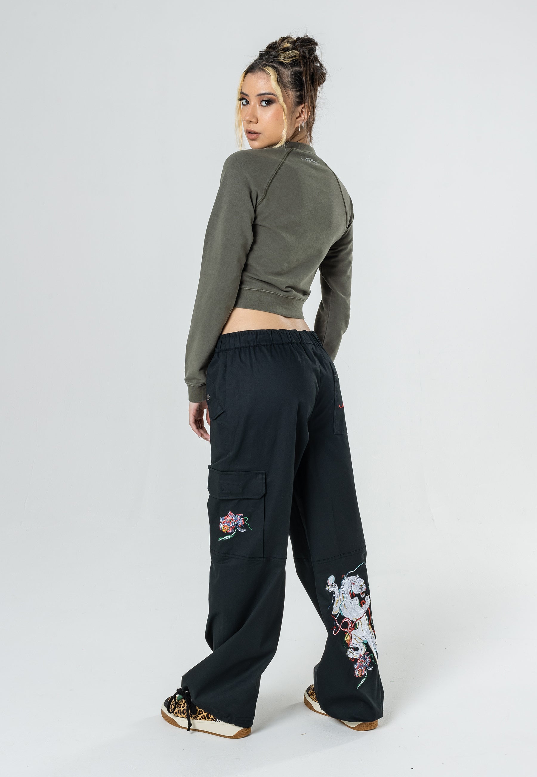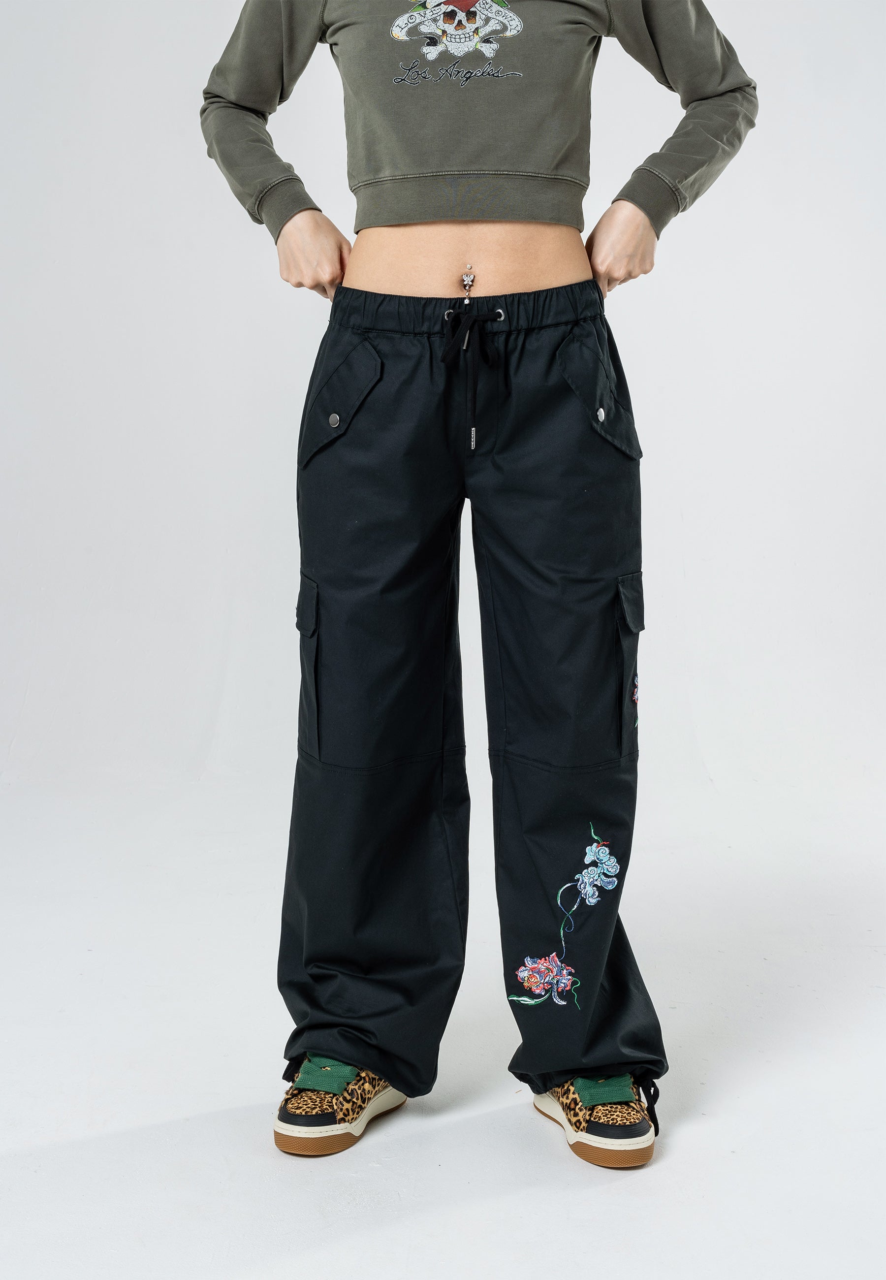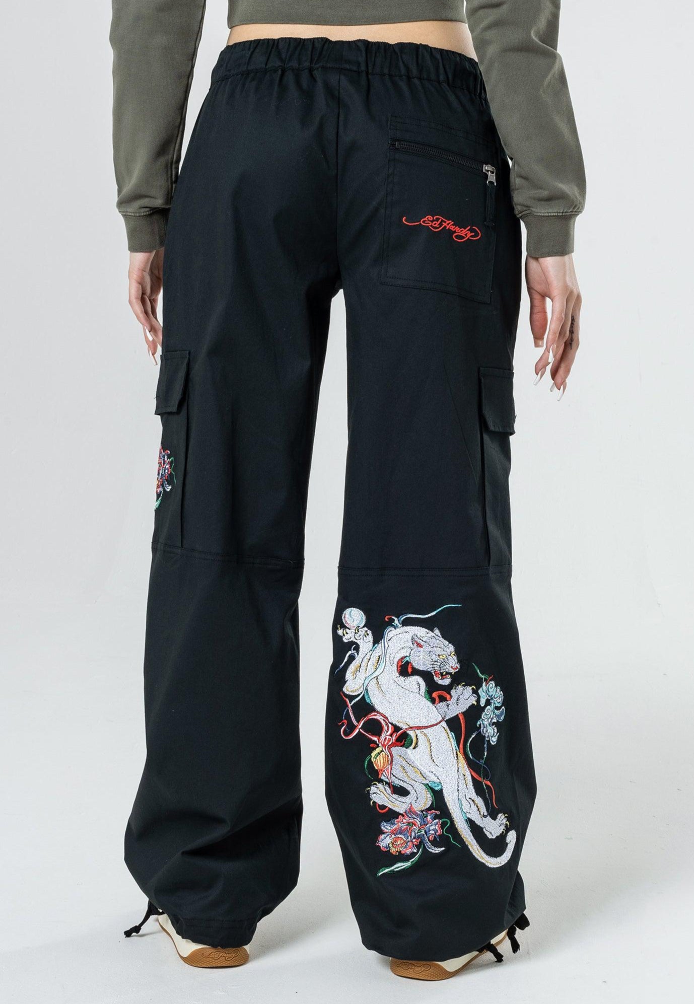 Mystic Panther Cargo Pant-Washed Black features the infamous Eds archive of high-definition embroidered Panther at the lower back right leg that come round to the front, as well as the embroidered Ed Hardy logo on the back zip pocket and floral embroidery on left pocket. These comfy cargos are perfect for chill, day and night vibes.