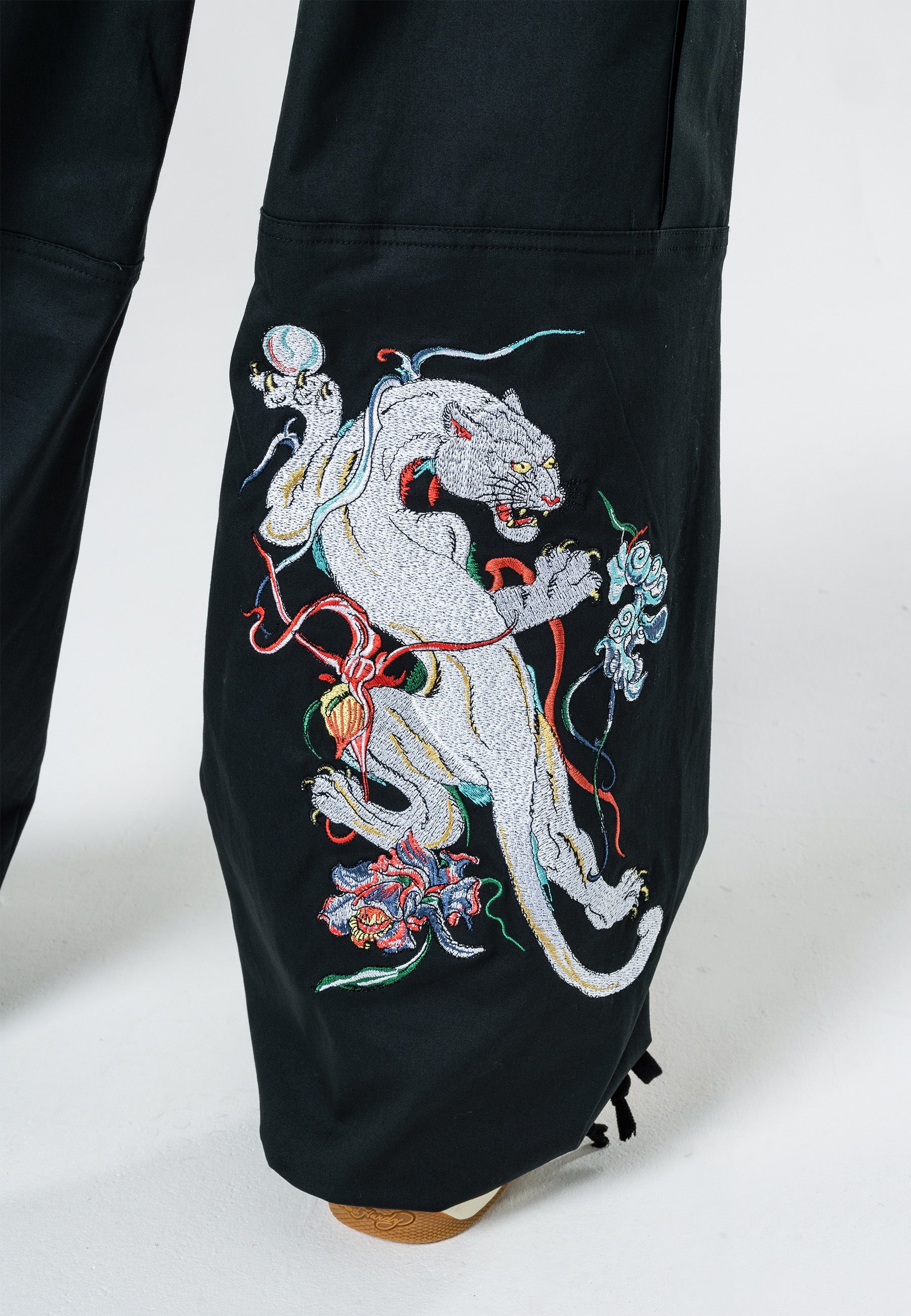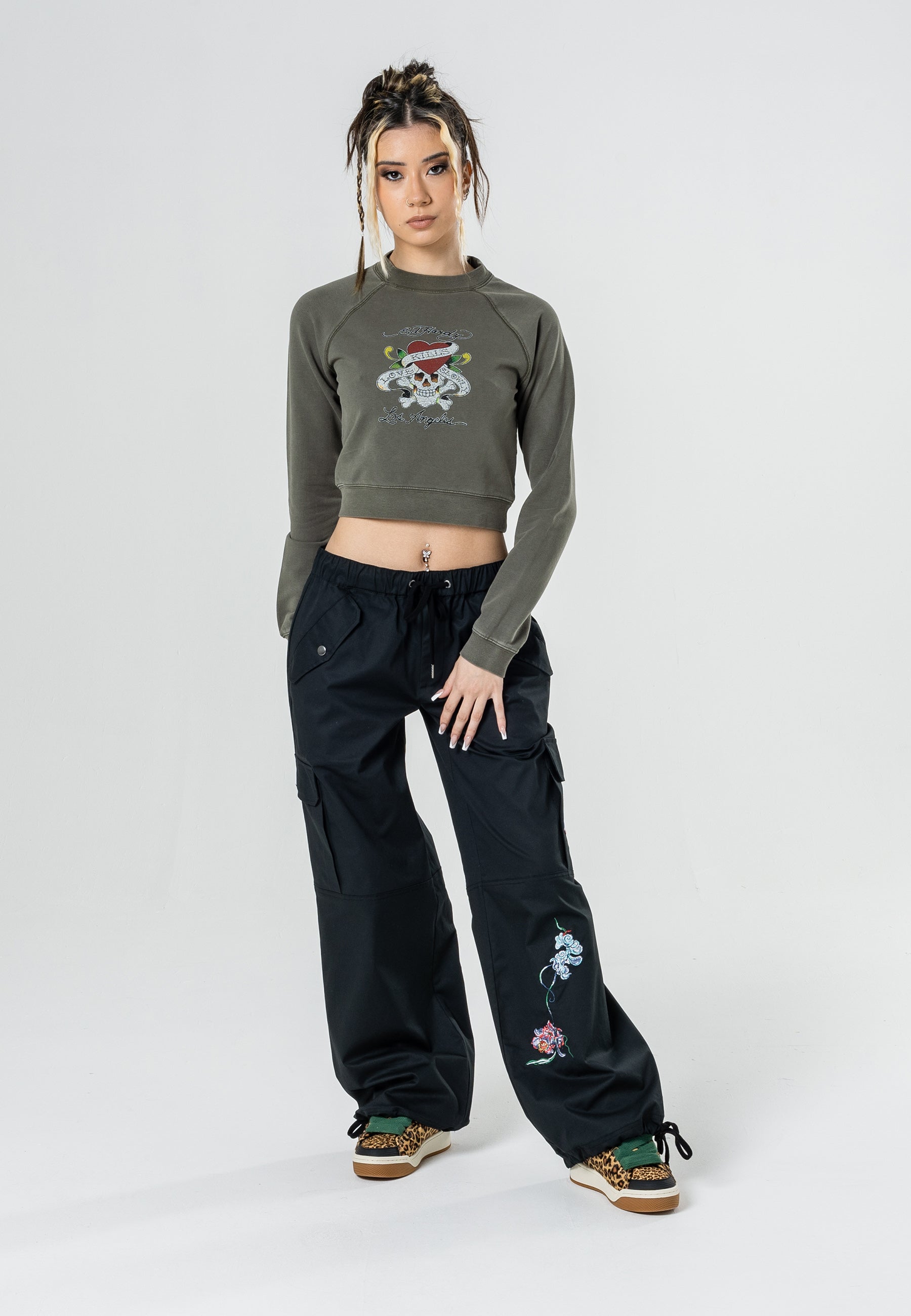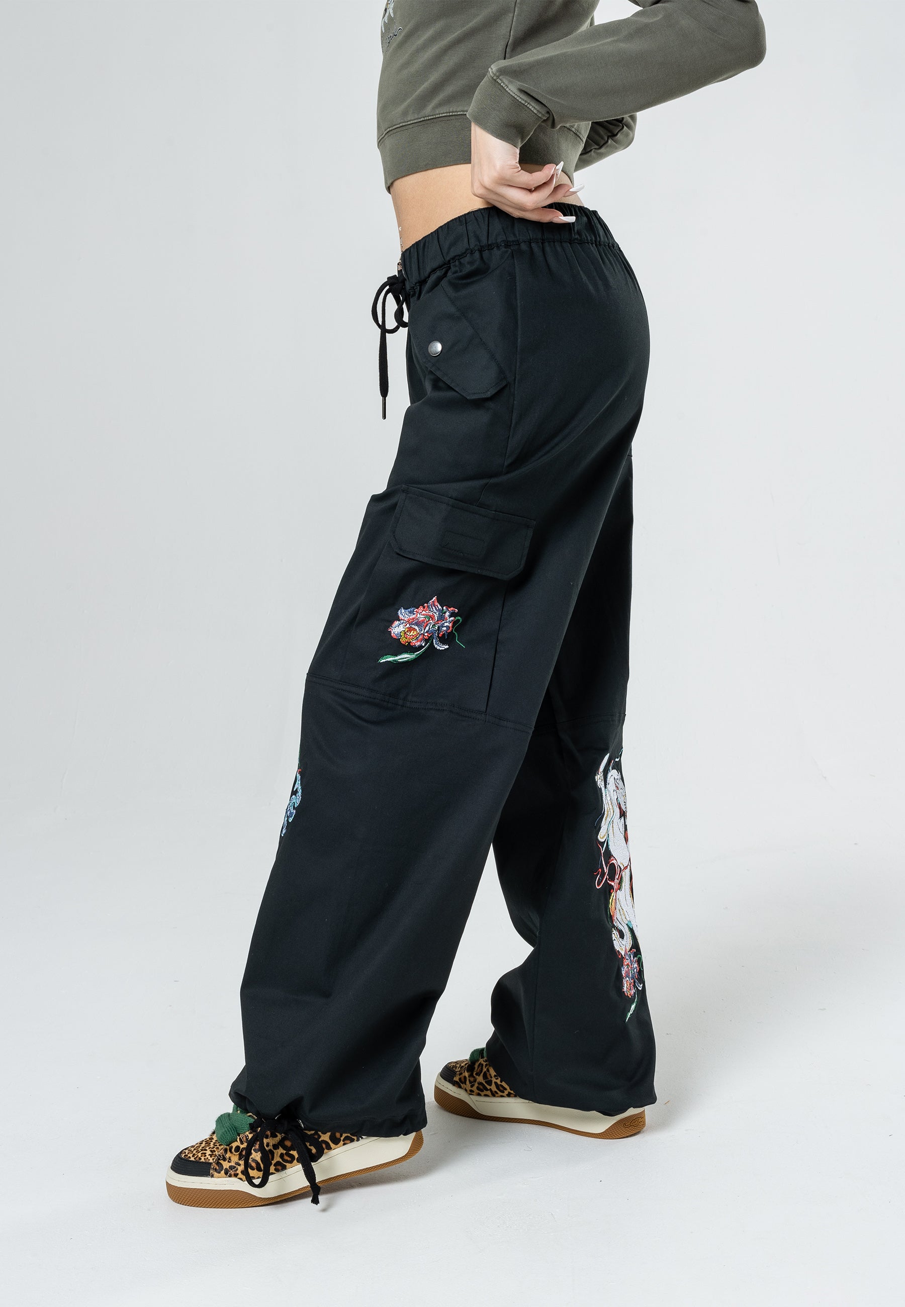 Mystic Panther Cargo Pant-Washed Black features the infamous Eds archive of high-definition embroidered Panther at the lower back right leg that come round to the front, as well as the embroidered Ed Hardy logo on the back zip pocket and floral embroidery on left pocket. These comfy cargos are perfect for chill, day and night vibes.