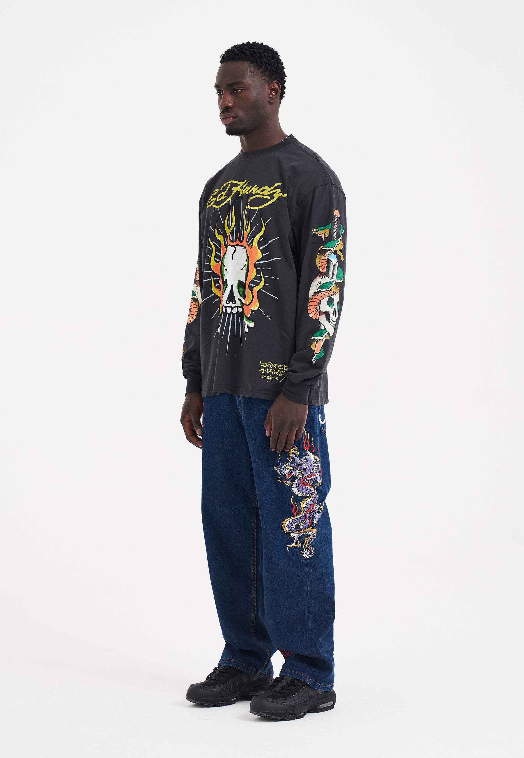 Mens Skull-Flame Long Sleeve T-Shirt - Charcoal