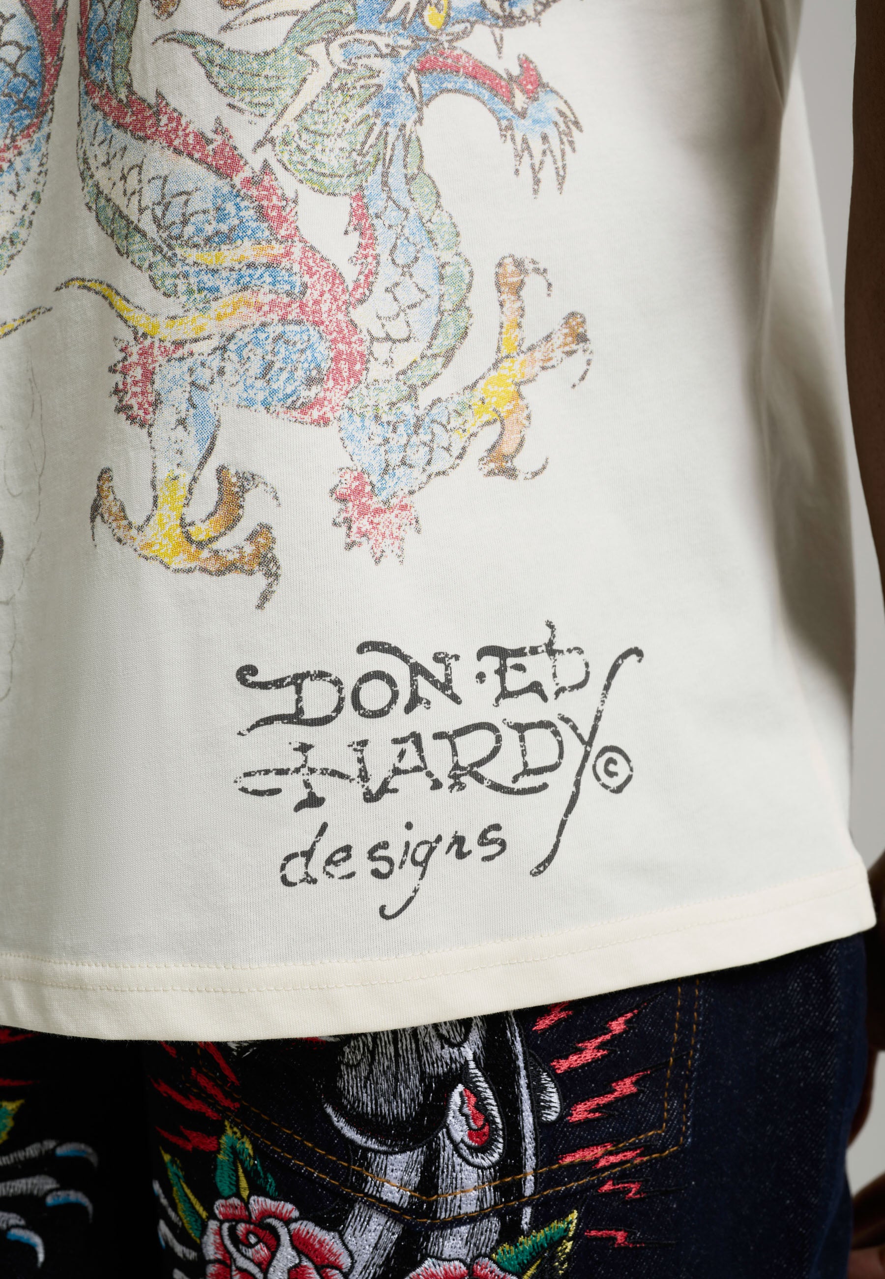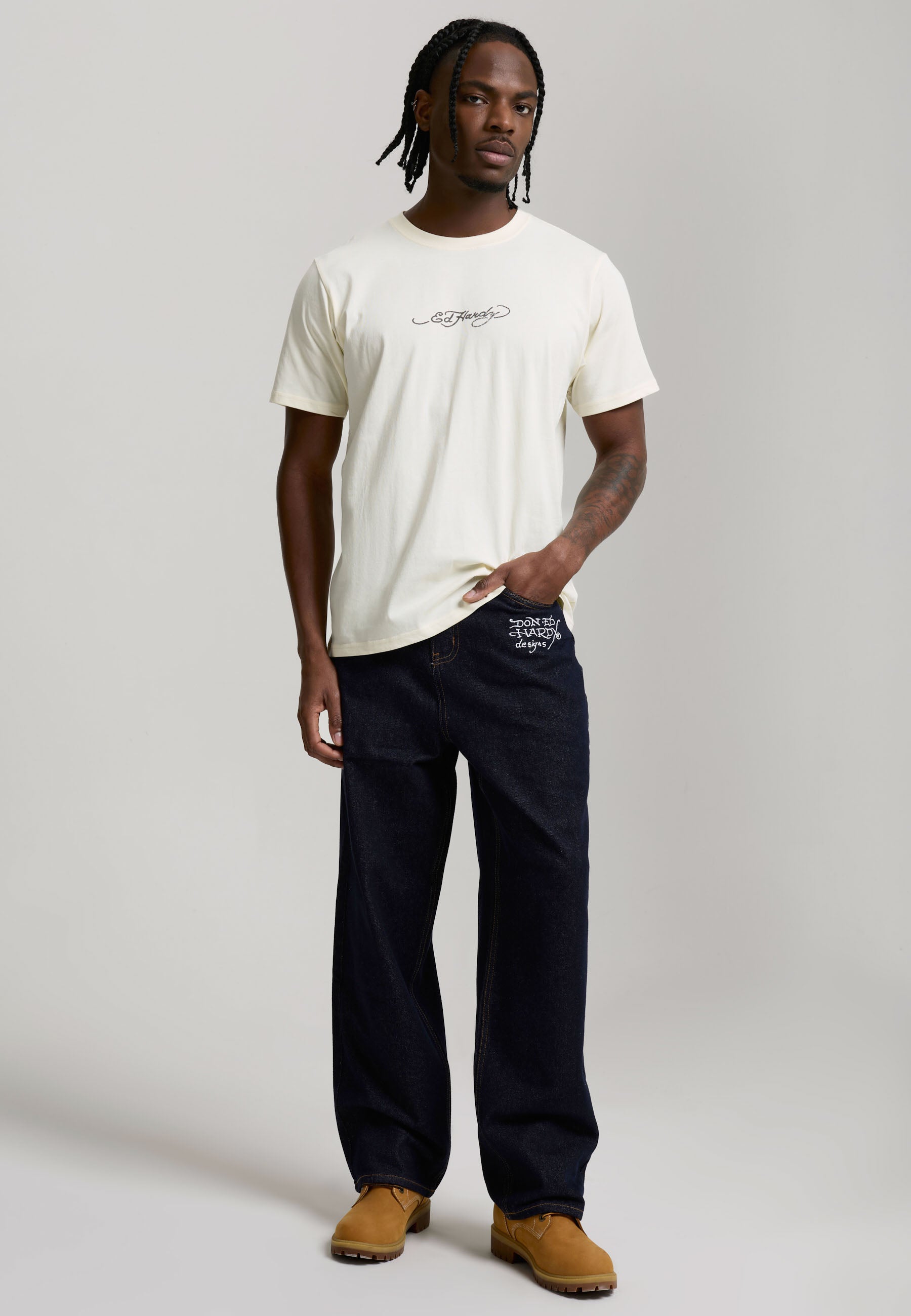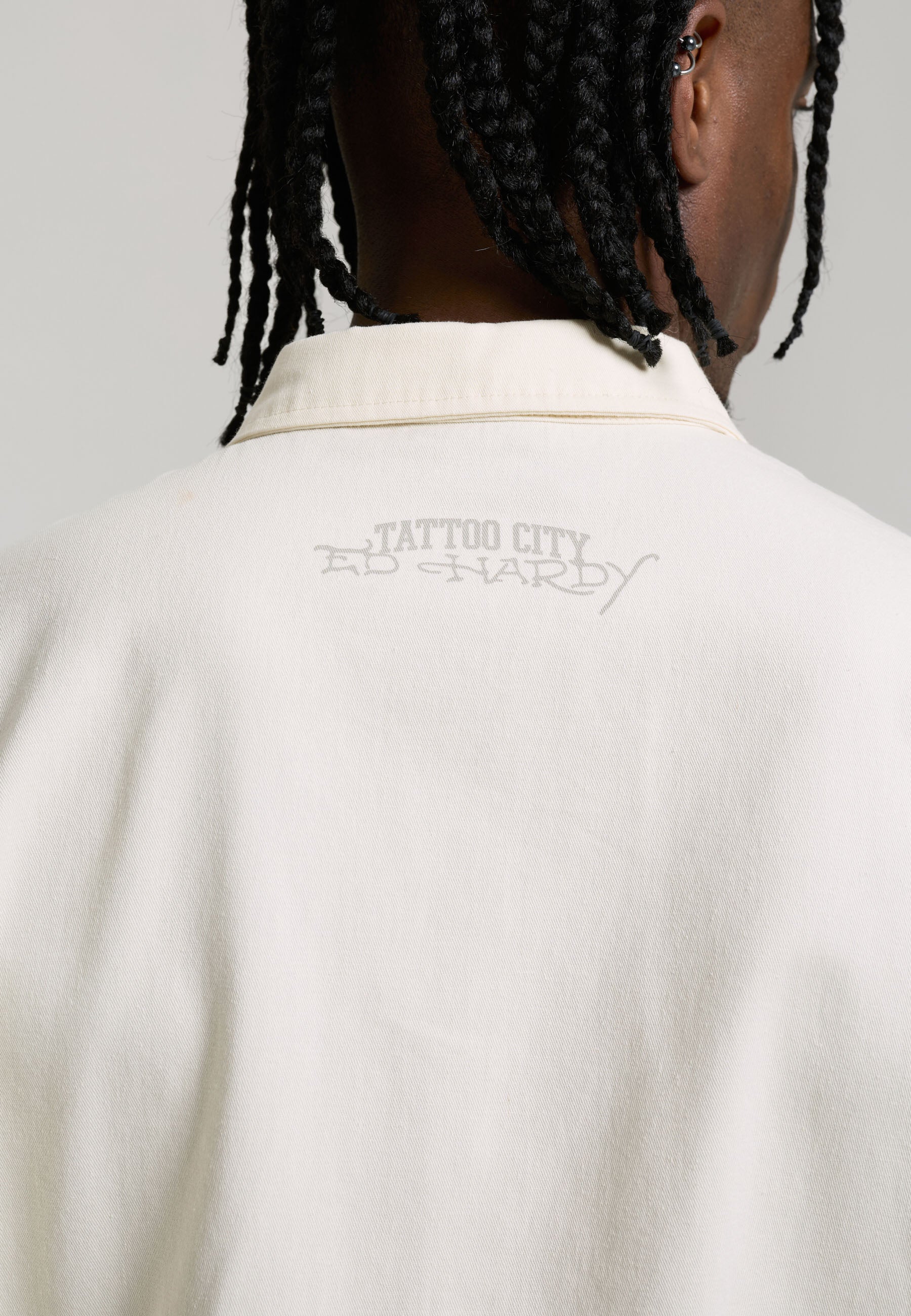 Mens Embroidered Gothic Ed Hardy Boxy Twill Shirt - Ecru