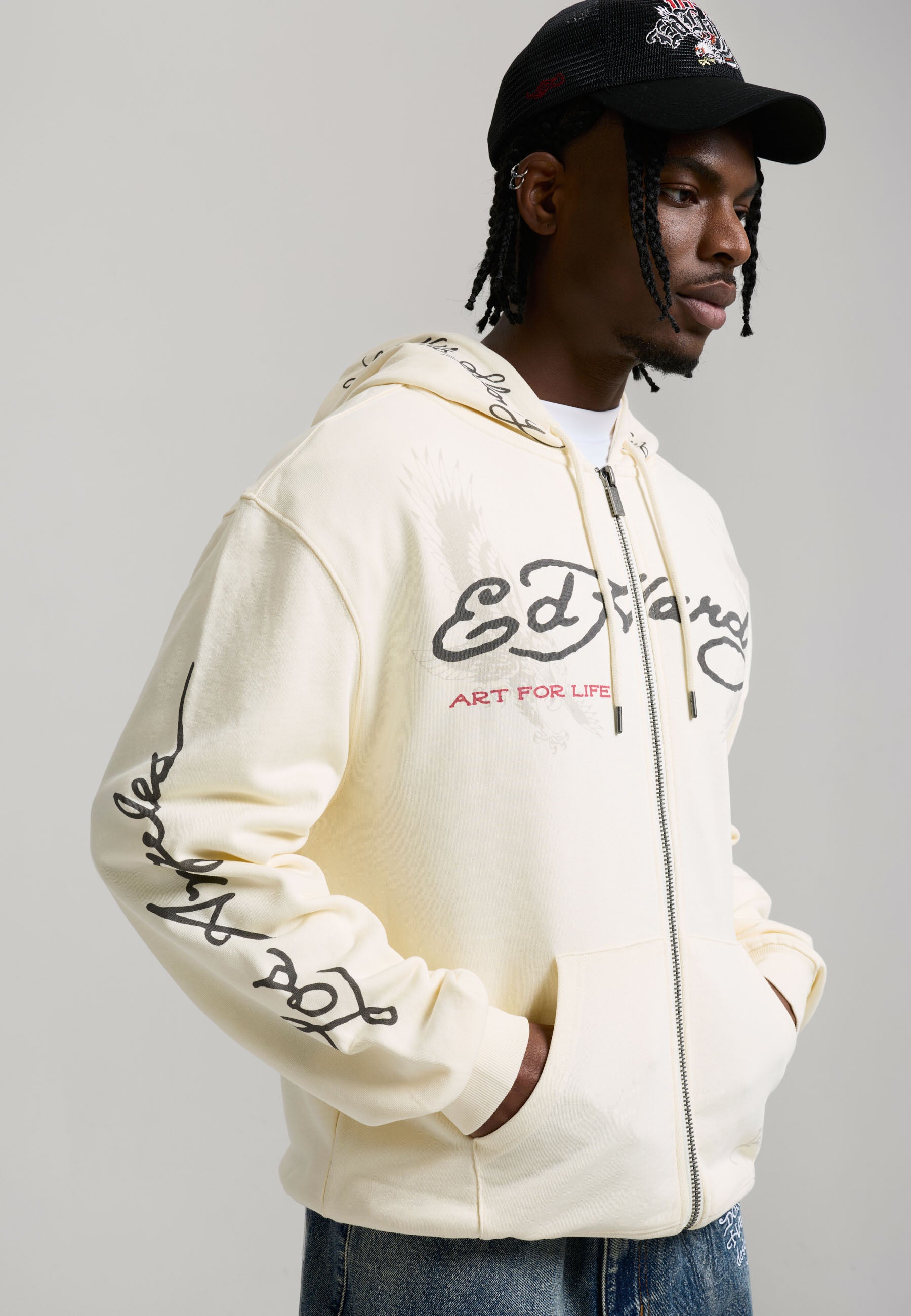 Mens Relaxed Art For Life Tattoo Zip Thru Hoodie - Ecru