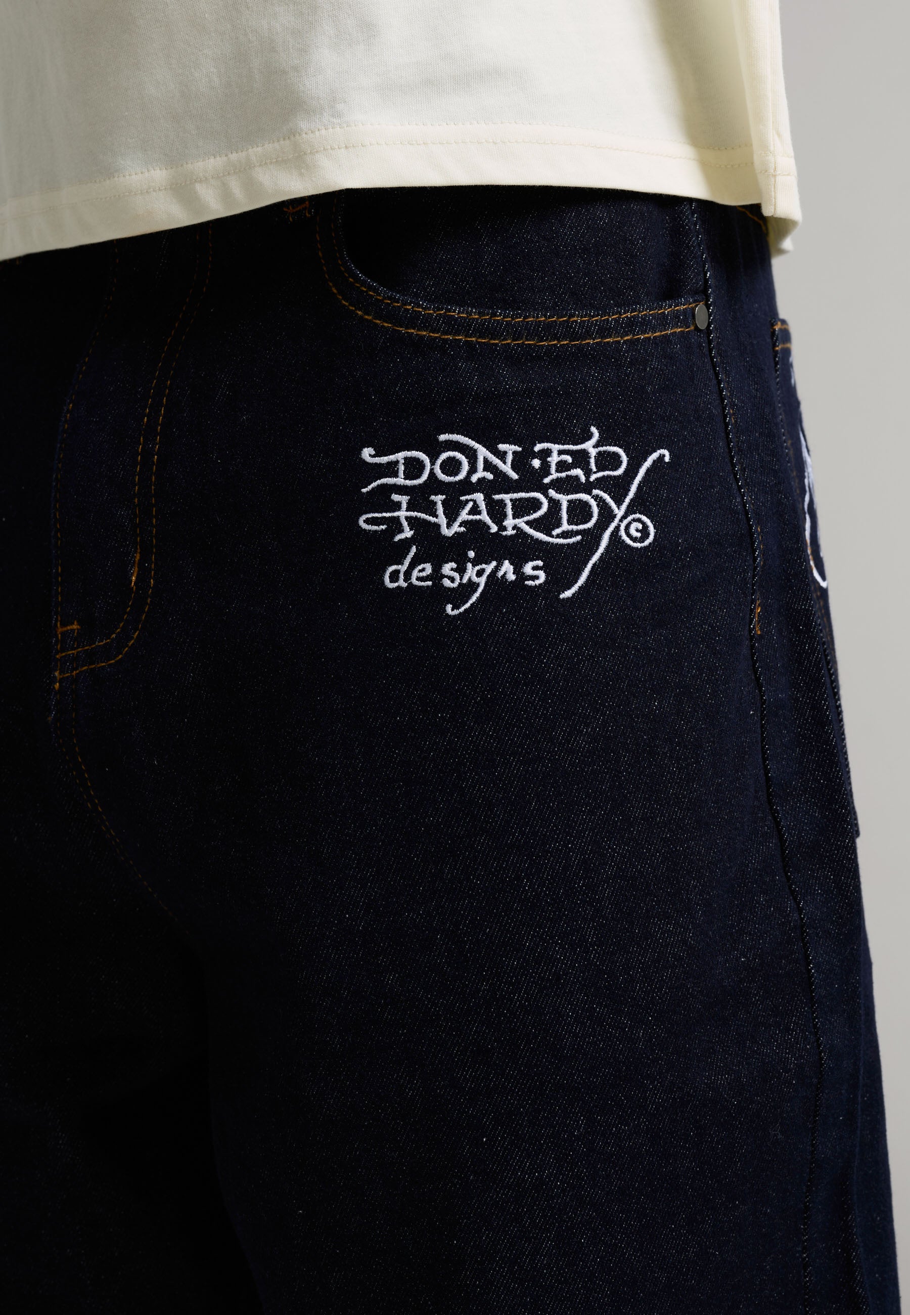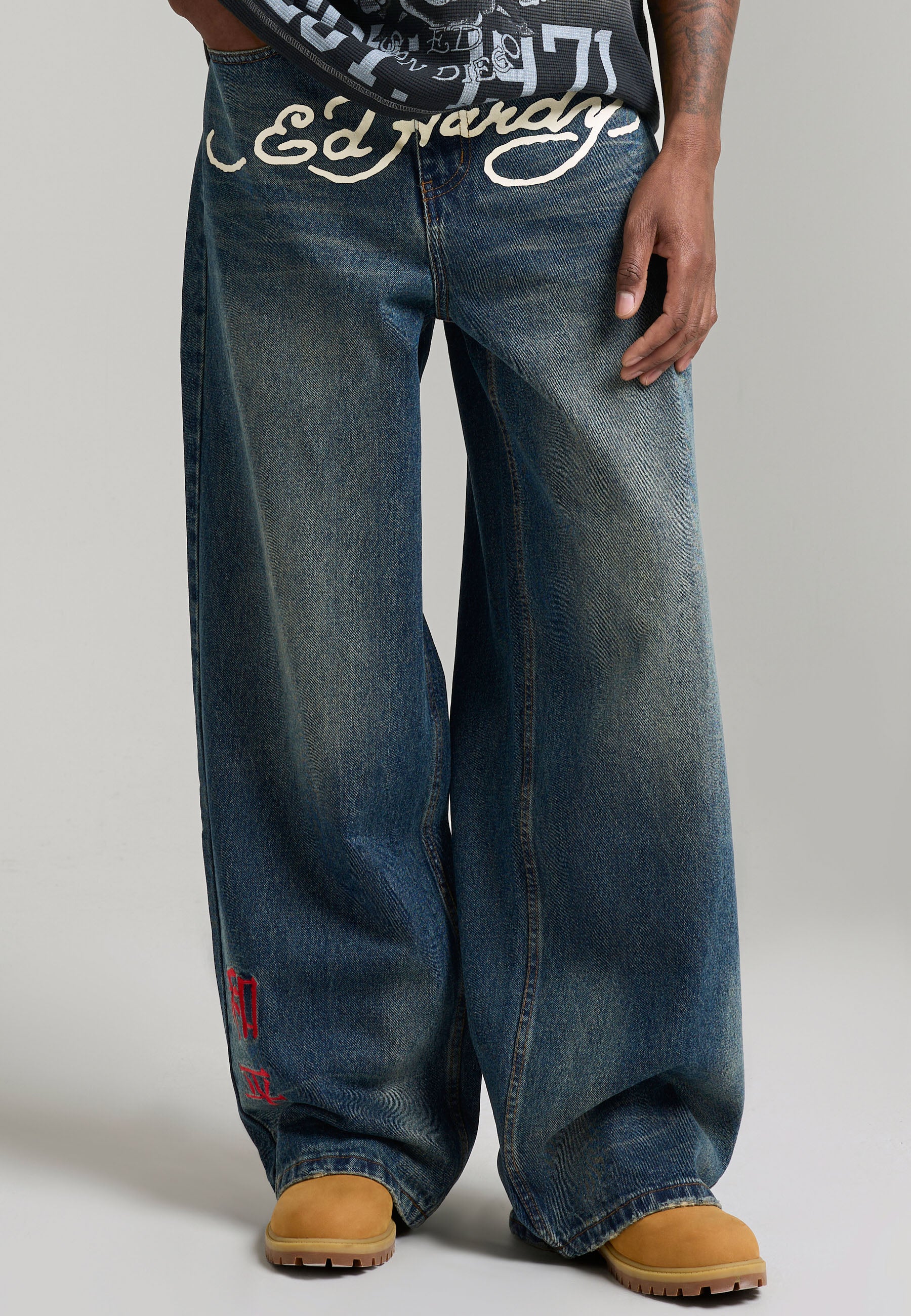 Mens Battle-Dragon Tattoo Denim Trousers Baggy Jeans - Indigo