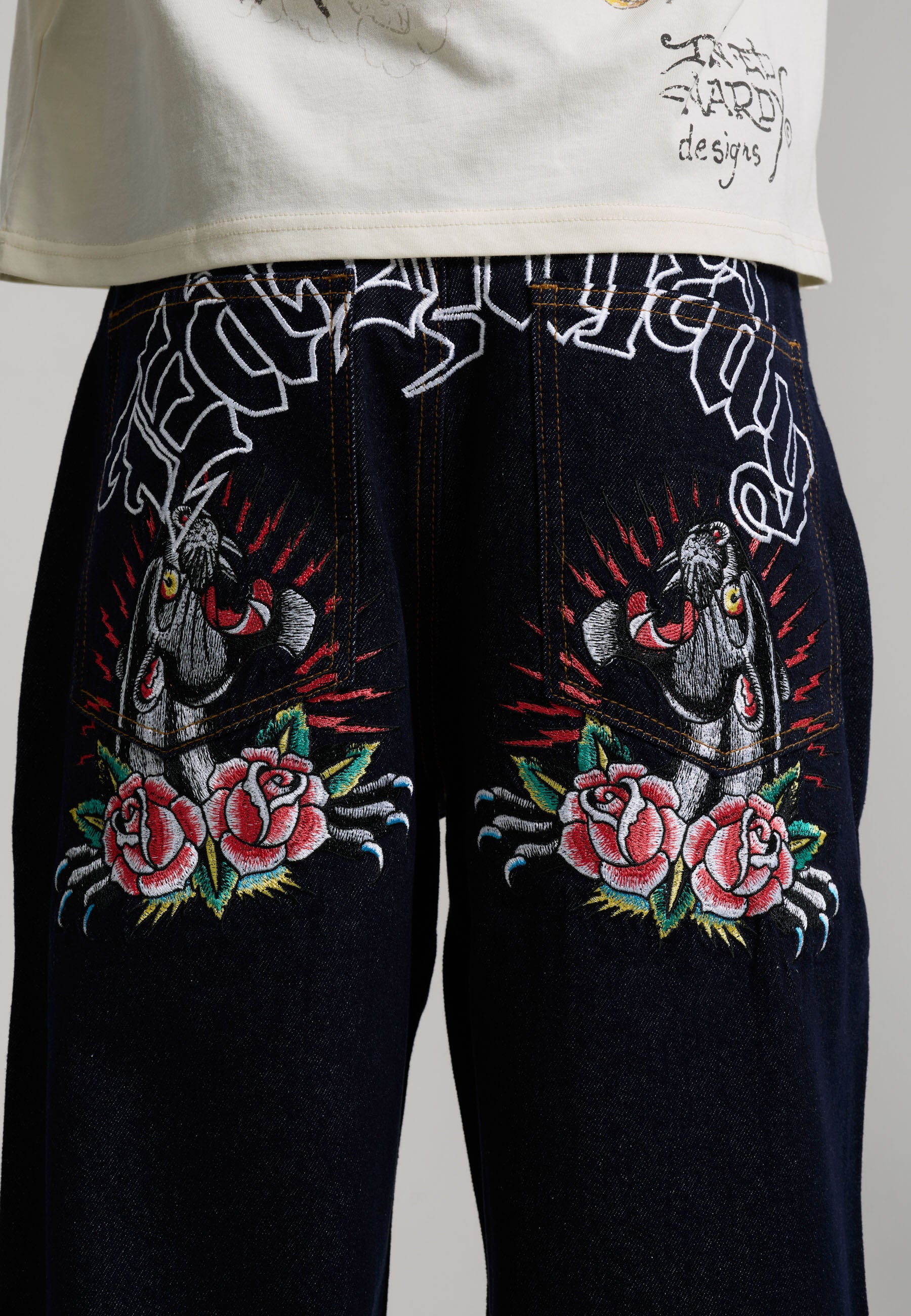 Mens Embroidered Panther Relaxed Jeans - Indigo