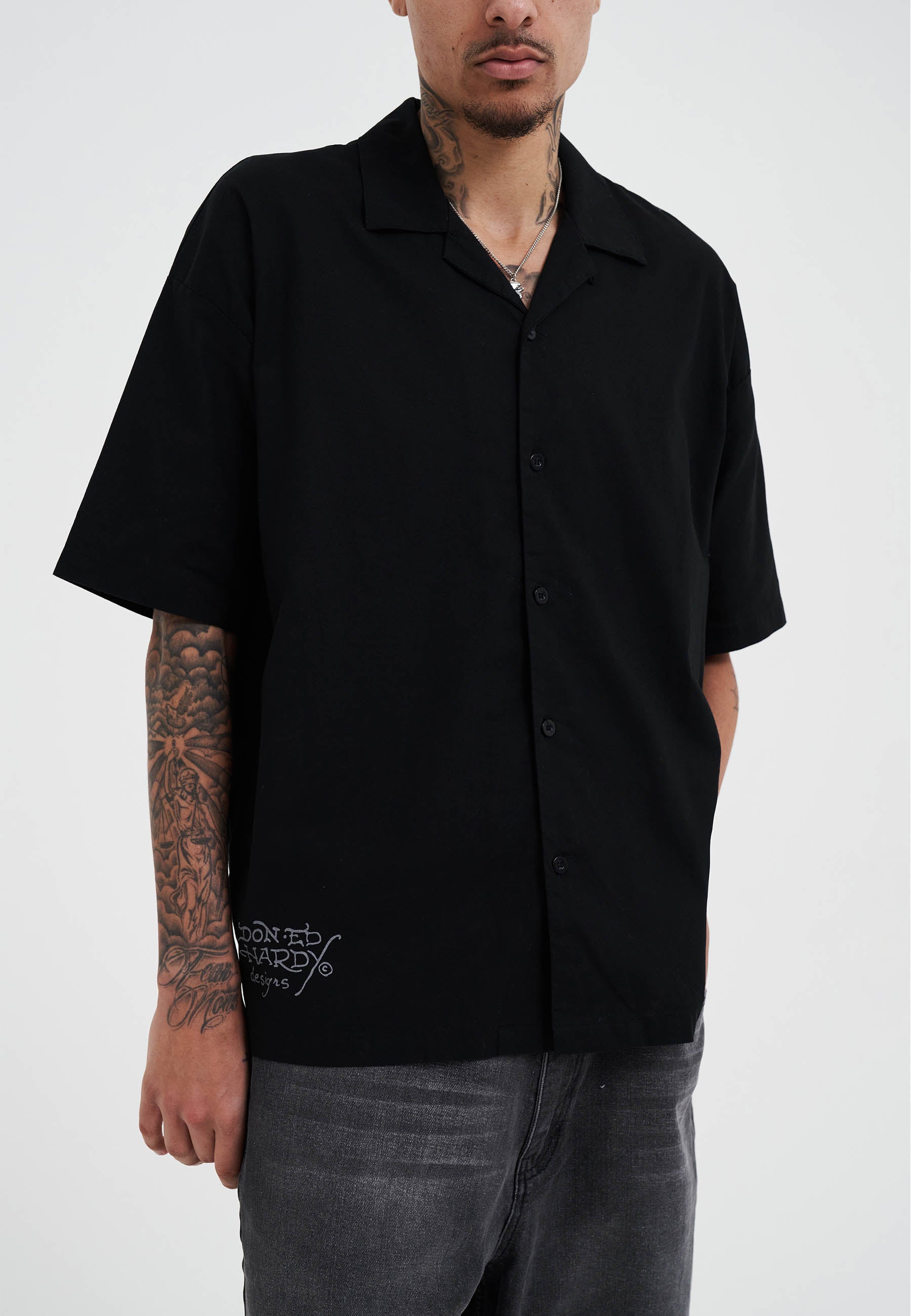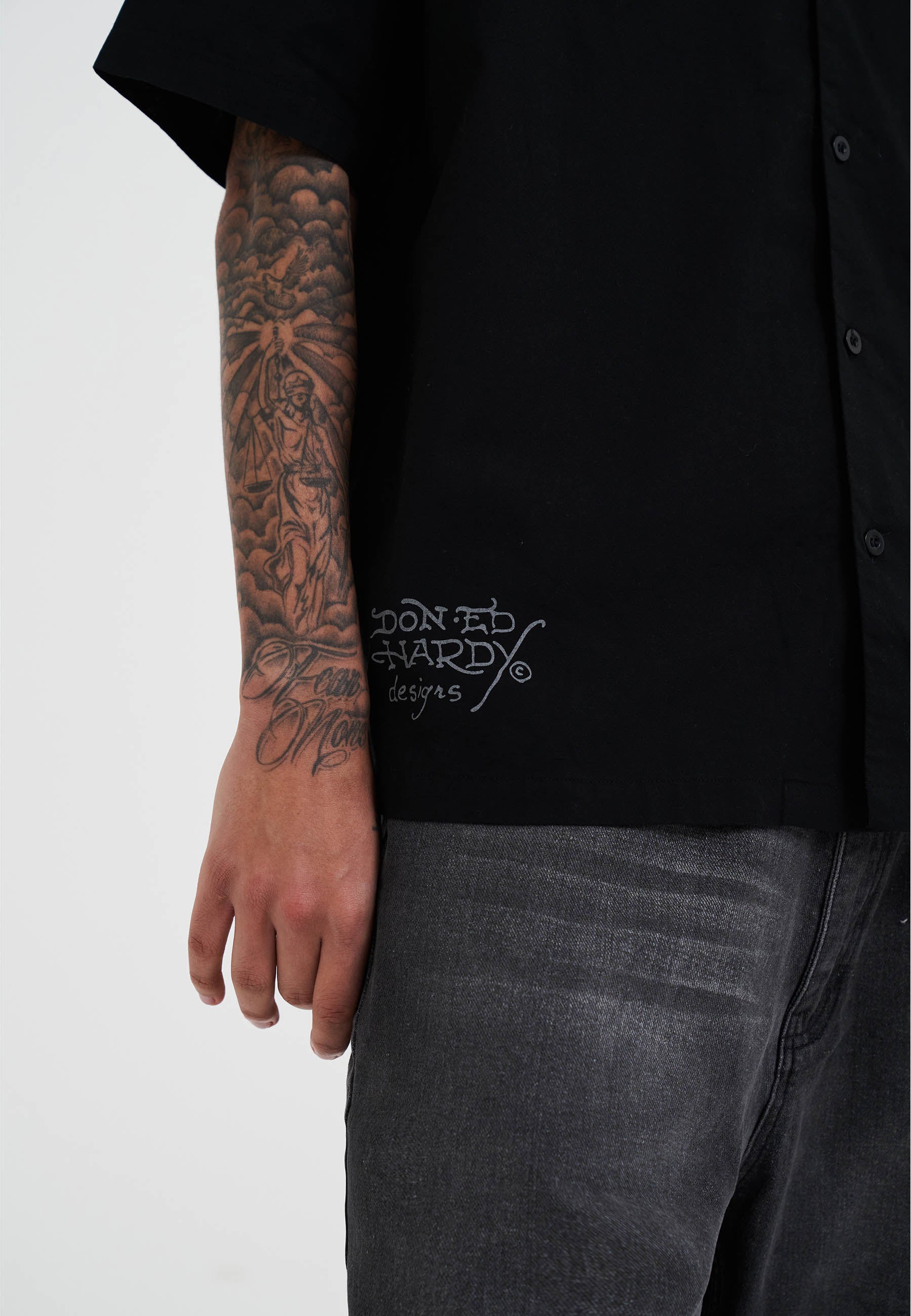 Mens Snakes And Skull Flames Printed Camp Shirt - Black