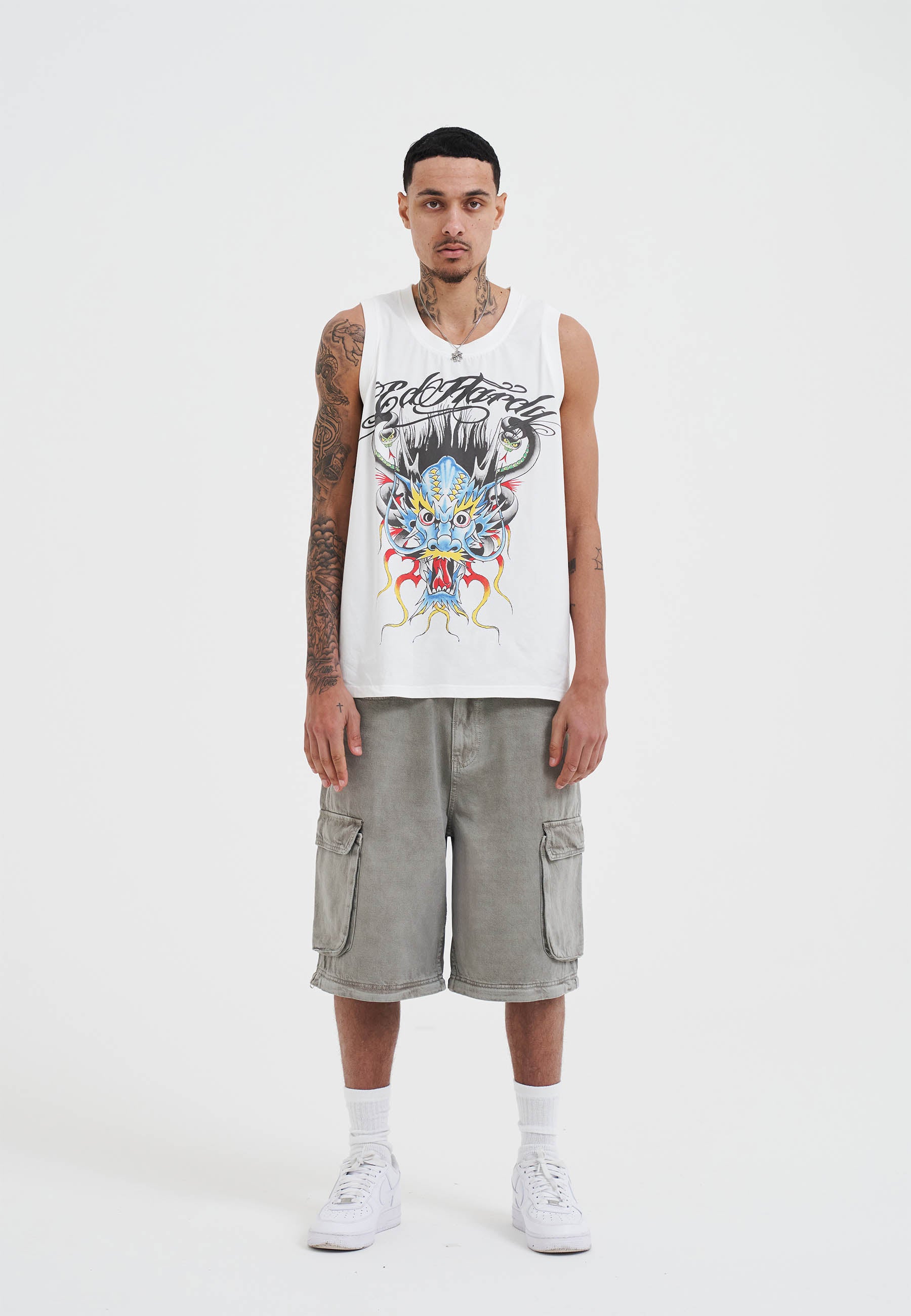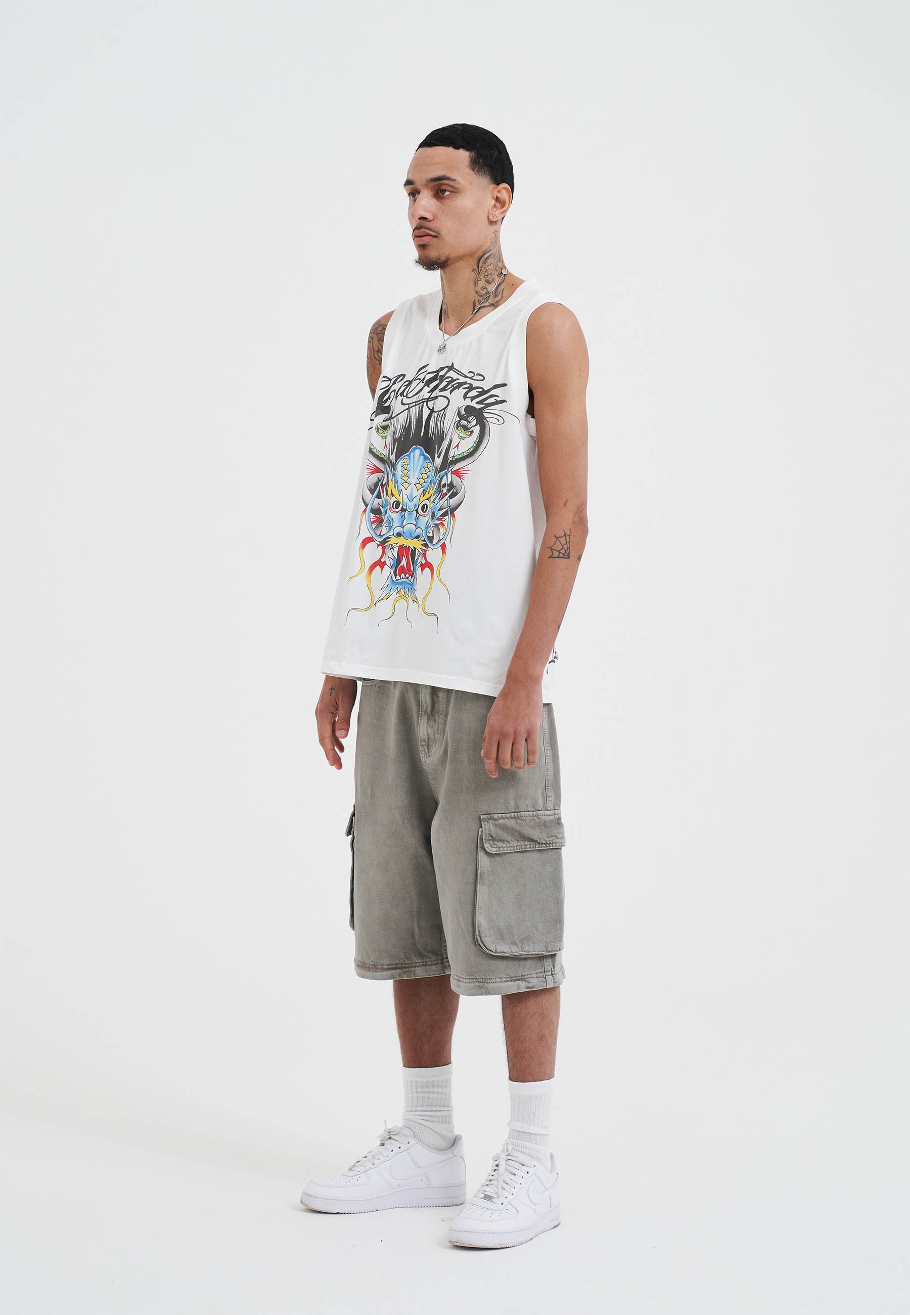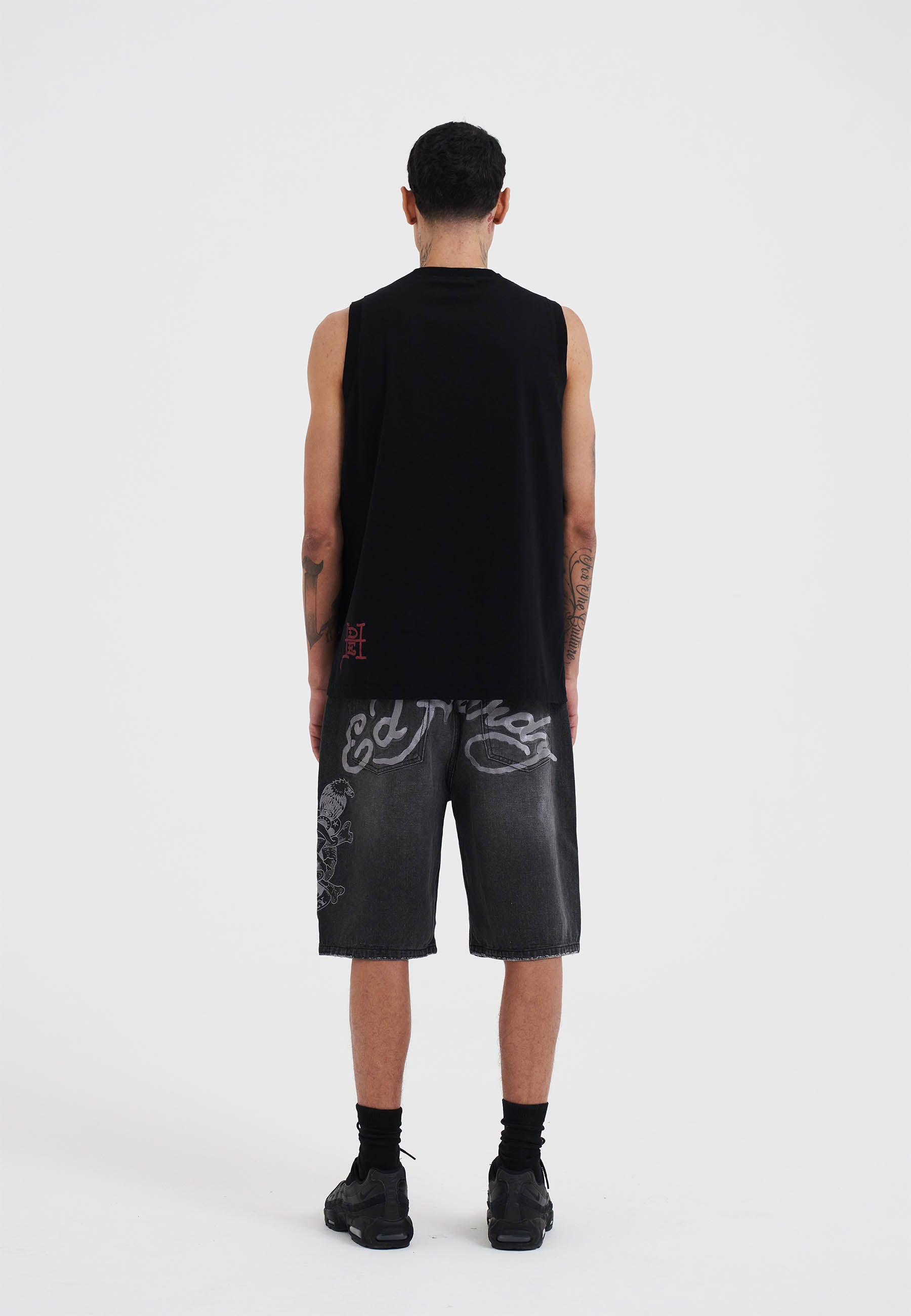 Mens Skull Dagger Thru Snake Relaxed Denim Cargo Jorts Shorts - Black
