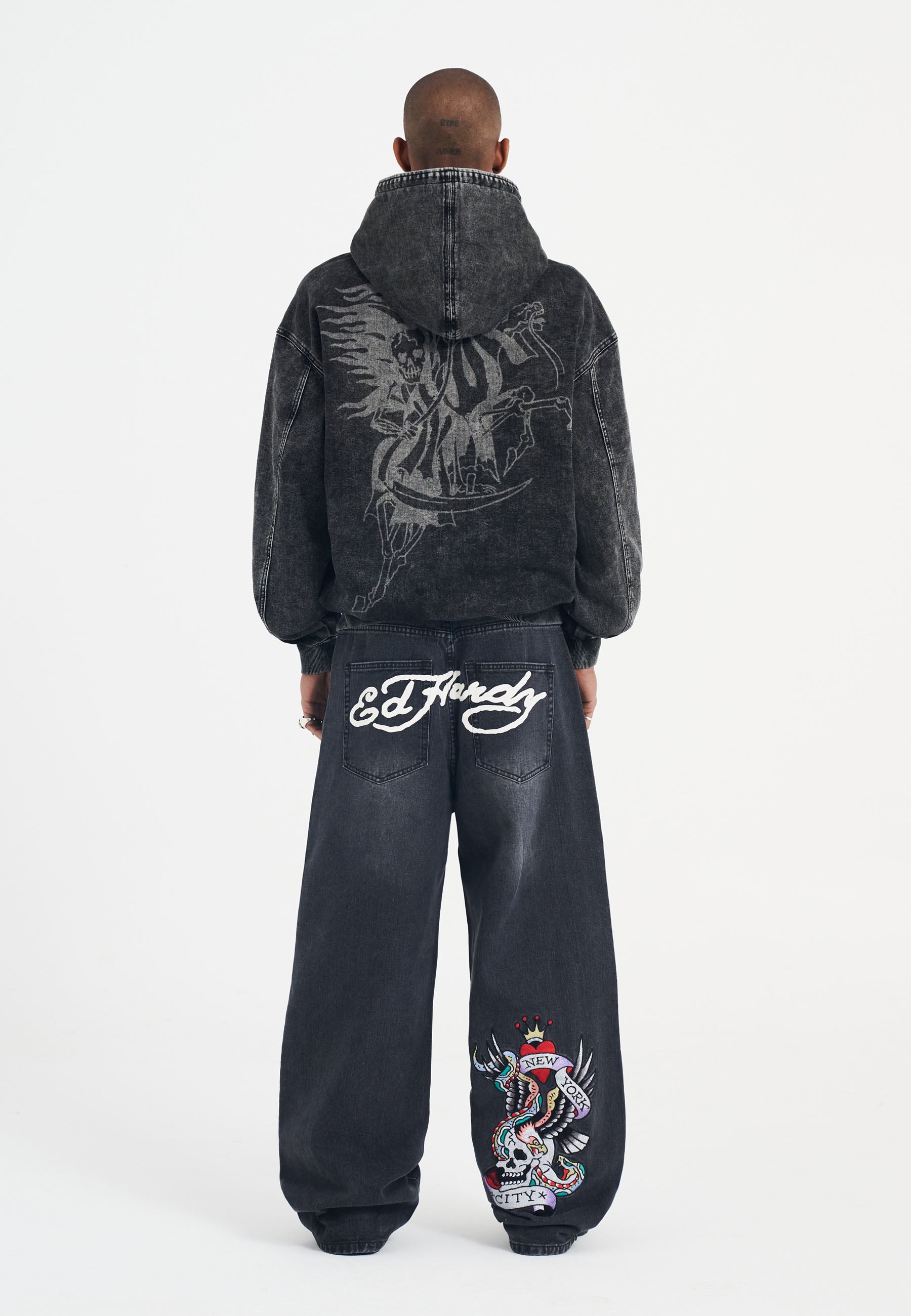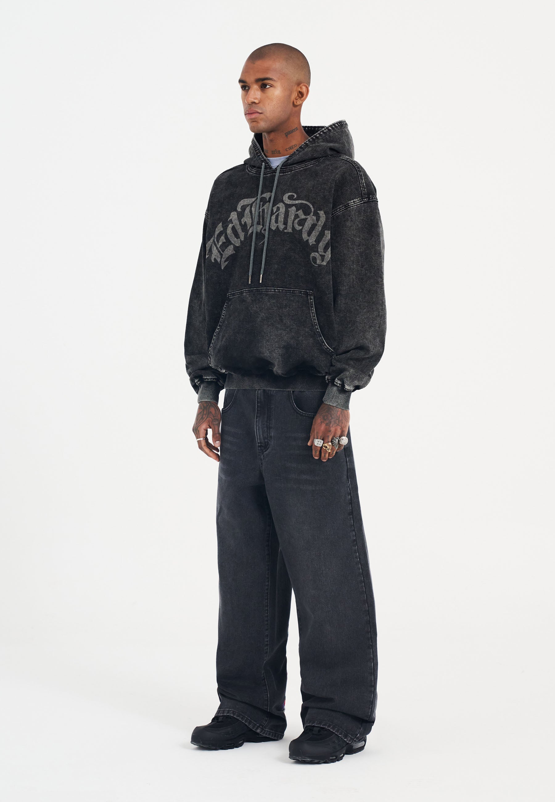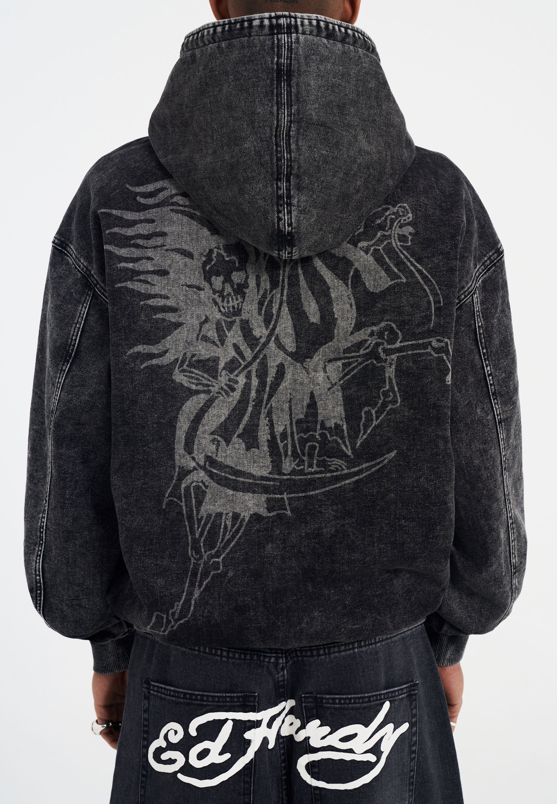 Introducing the Men's Death Rider Denim Pouch Hoodie, bold, oversized and heavily distressed for AW.
