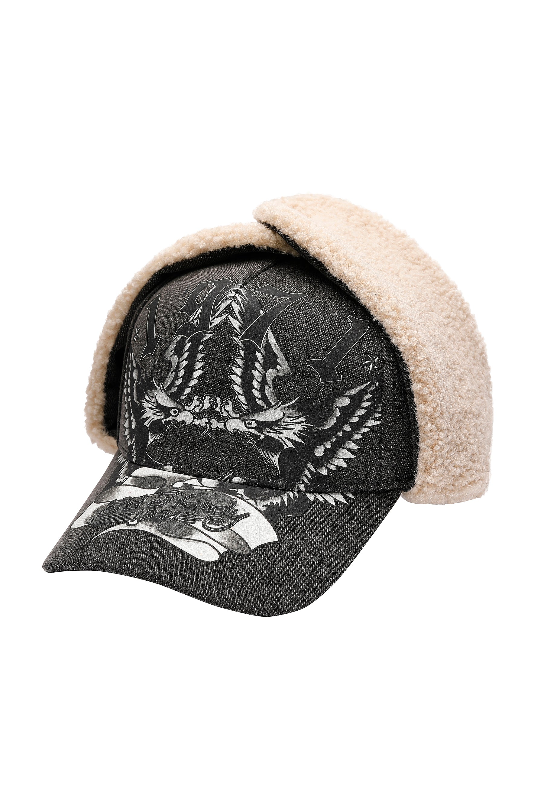 UNISEX 1971 EAGLE ACID WASH 5 PANEL TRAPPER CAP in Black