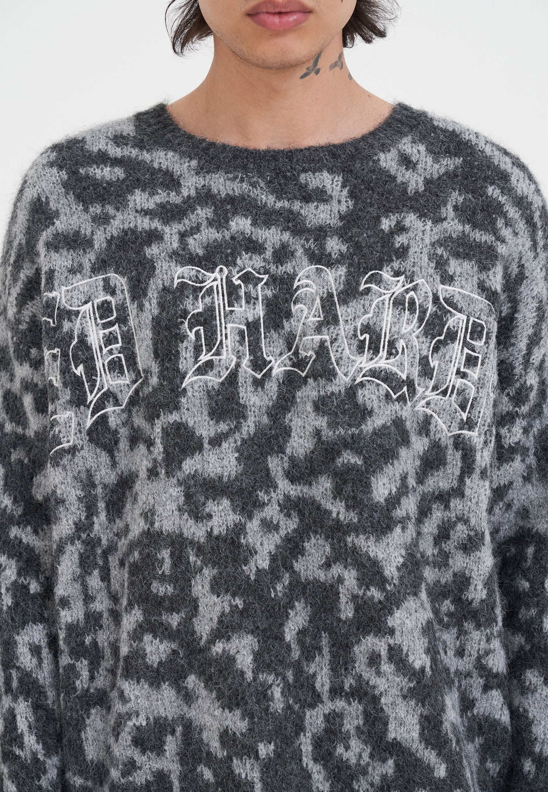 Mens Intarsia Leopard Knitted Crew Jumper - Grey