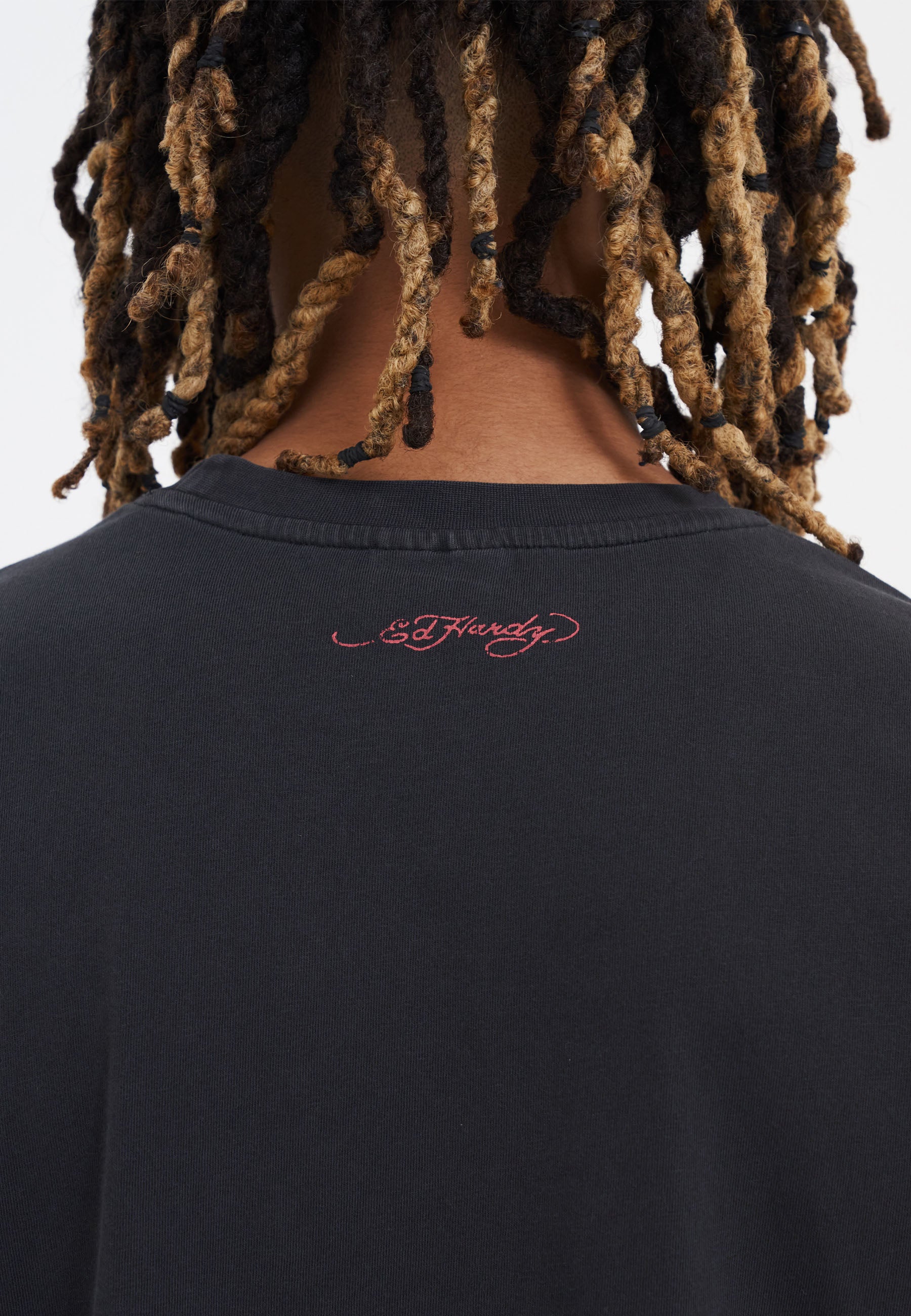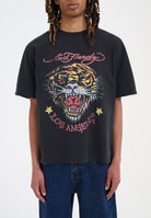 With a vivid, fierce LA tiger print centrally located on the front and a crimson variant of the iconic Ed Hardy logo above it, this washed-black T-shirt combines vintage tattoo design with modern style.