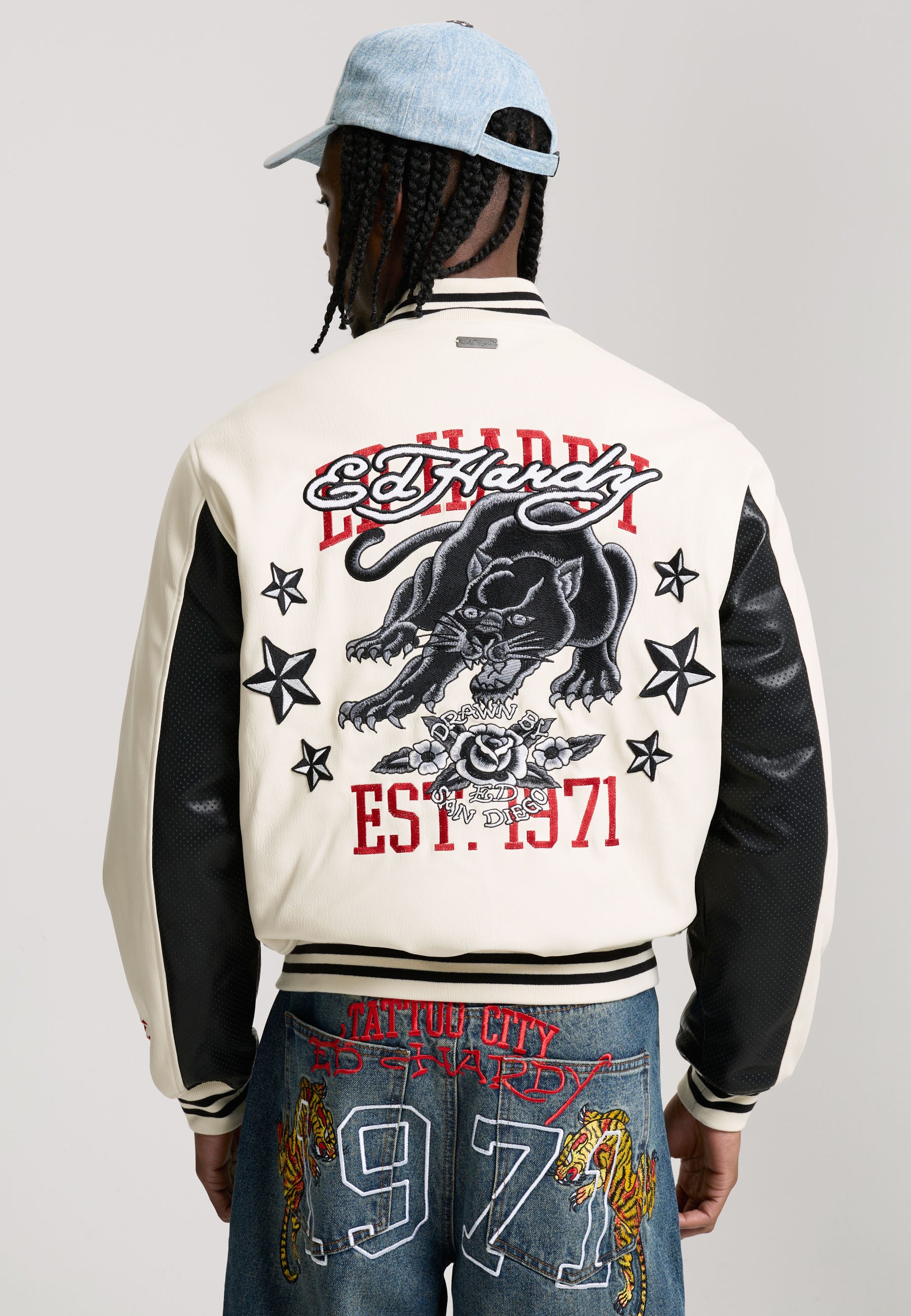 PU LEATHER 100% POLYESTER LINING CONTRAST PANELLING EMBROIDERED PANTHER GRAPHIC APPLIQUE ED HARDY GRAPHIC RELAXED BOMBER FIT INSEAM POCKETS ZIP POCKET AT CHEST BRANDED ZIP DETAIL