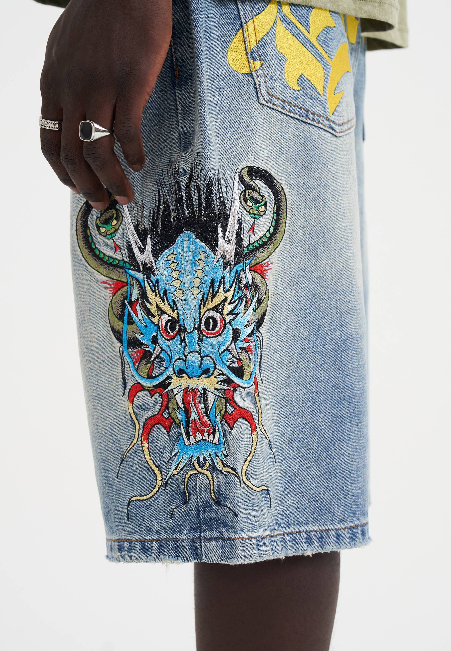 - Large graphic embroidery to side of leg