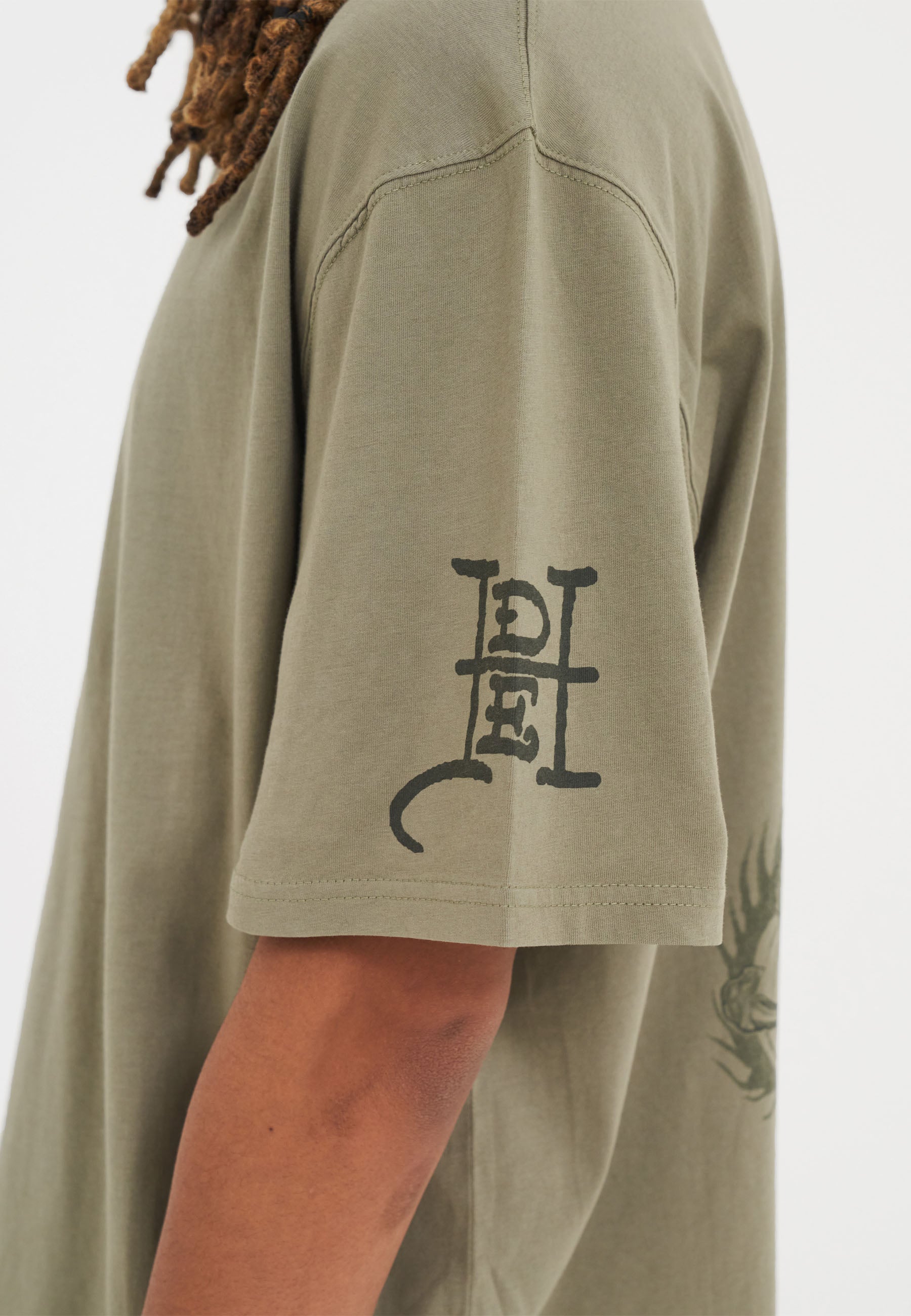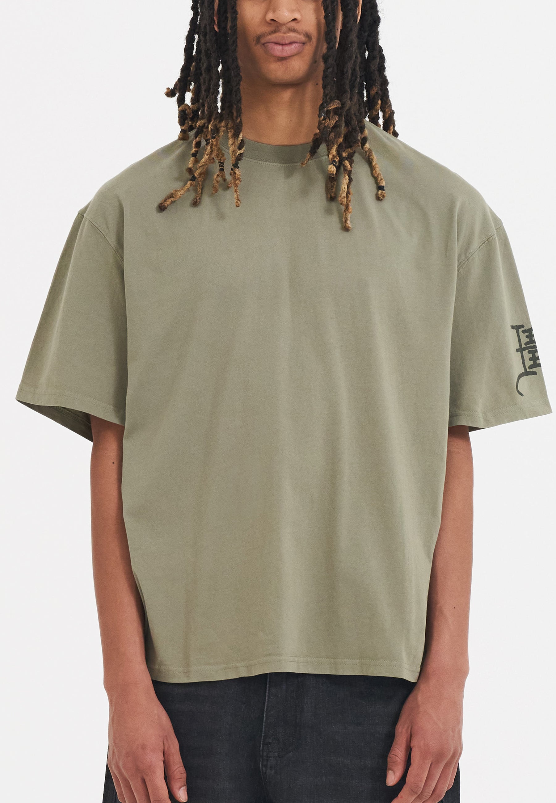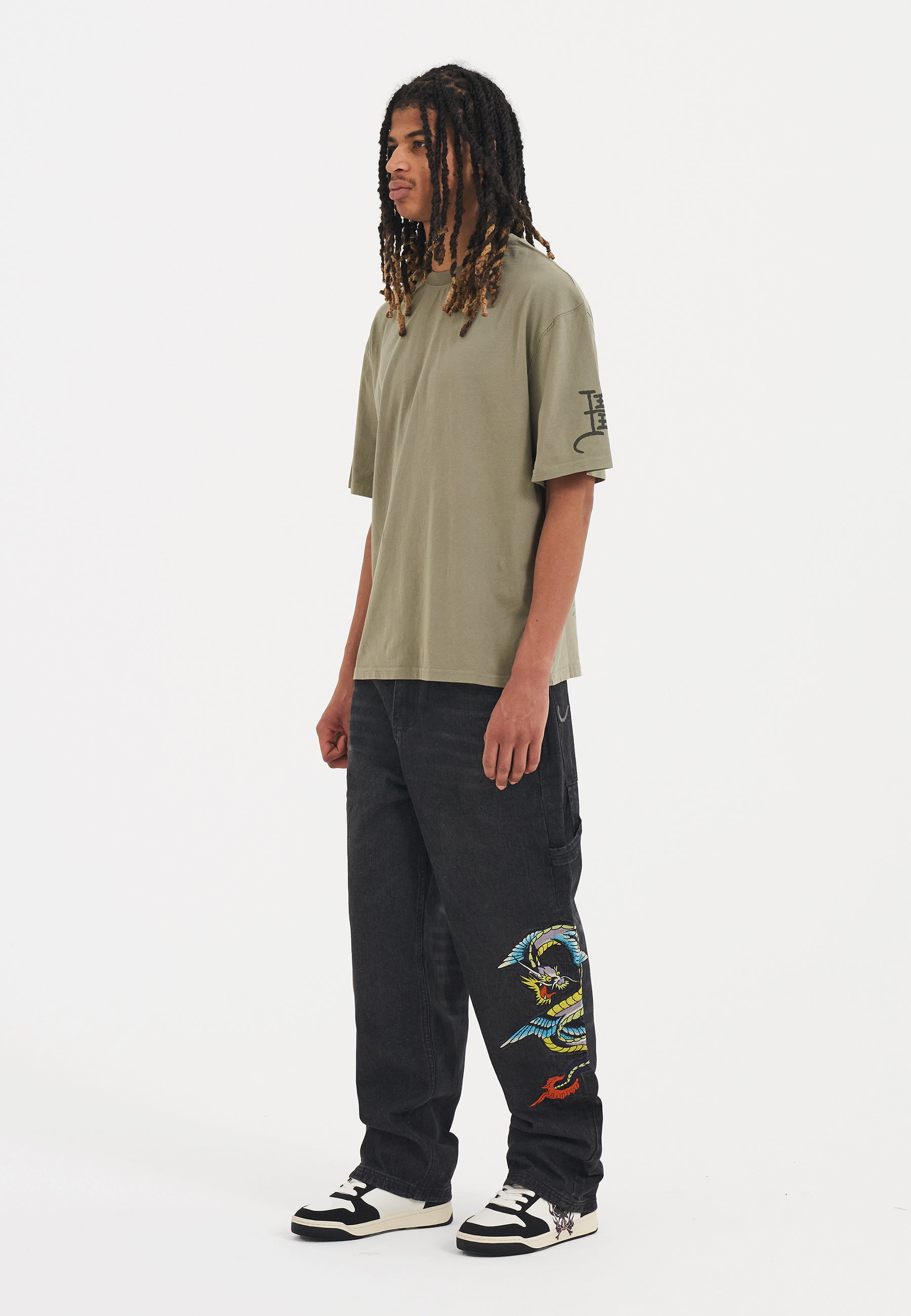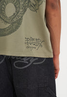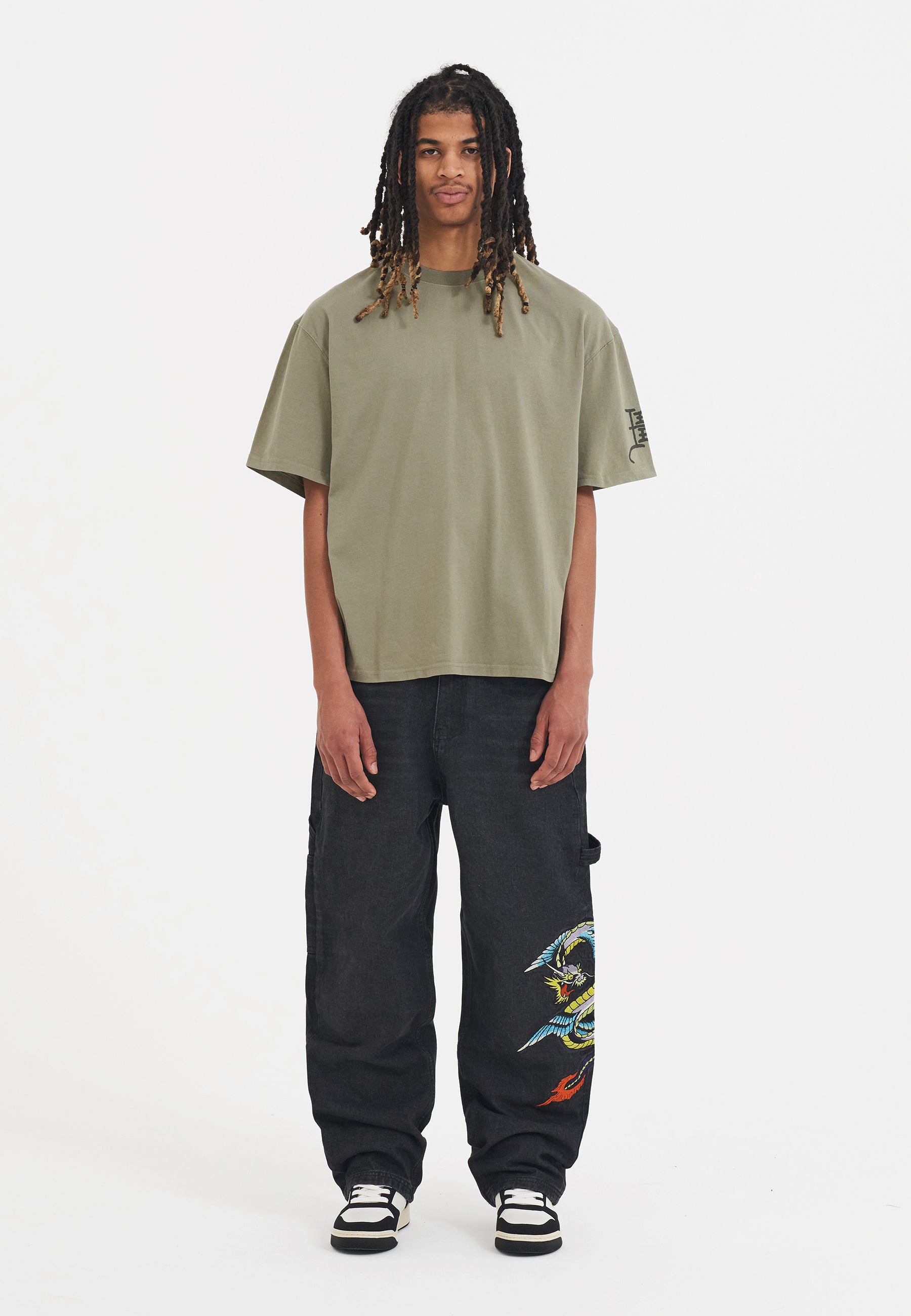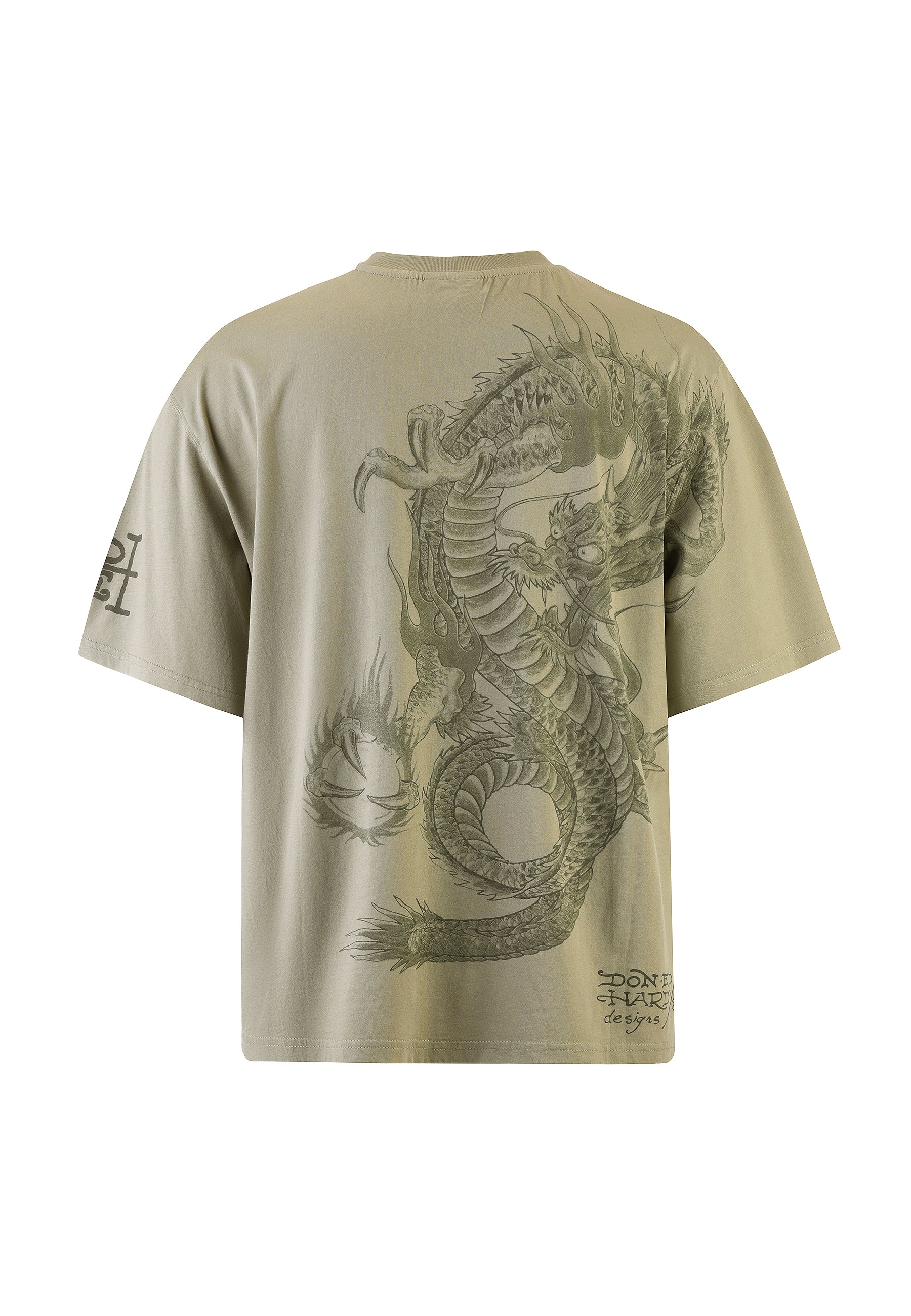Ignite your style with the Fireball Dragon T-Shirt, a relaxed-fit Tee in a subtle green hue featuring a striking monochromatic fireball dragon graphic print.