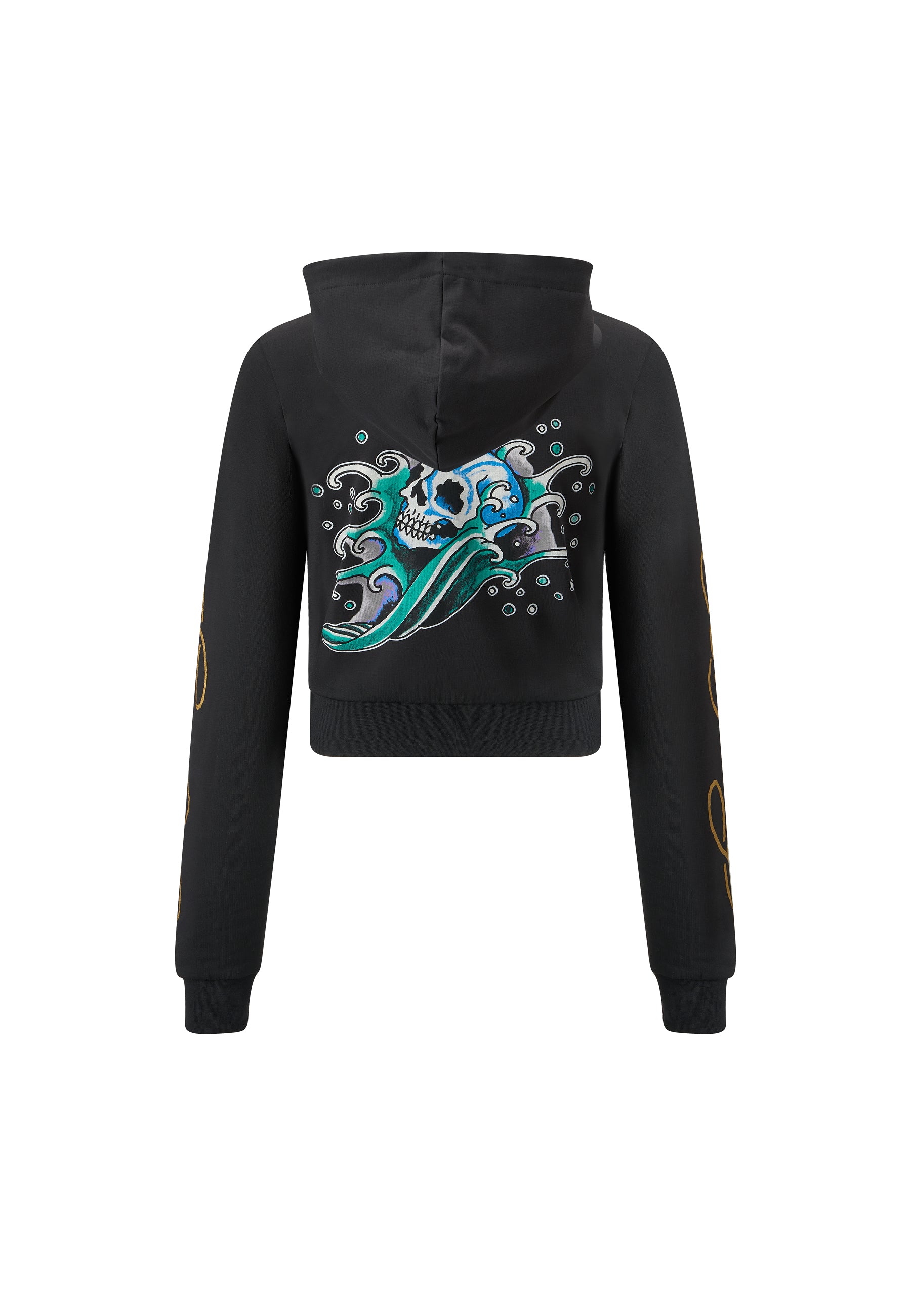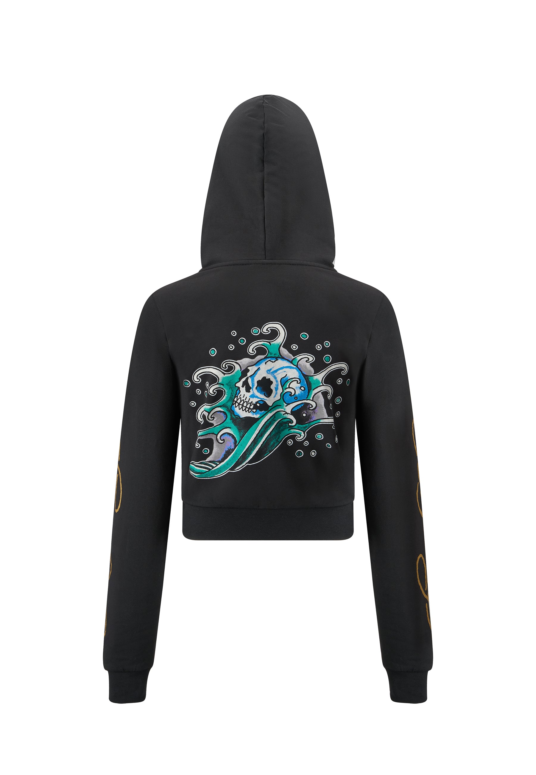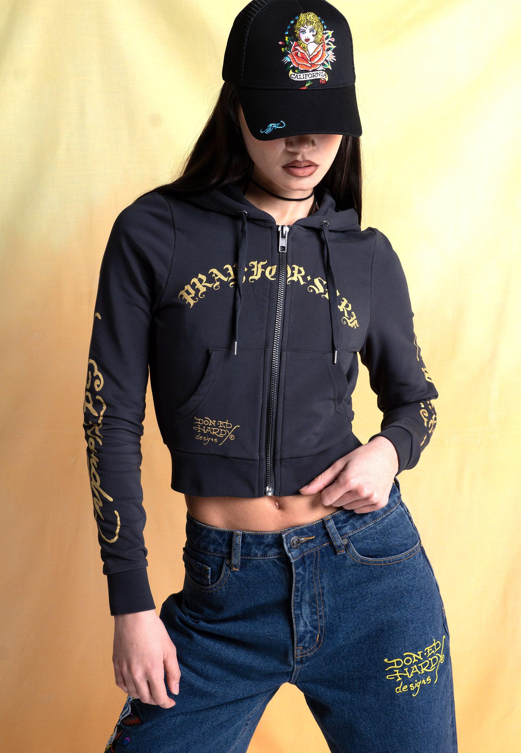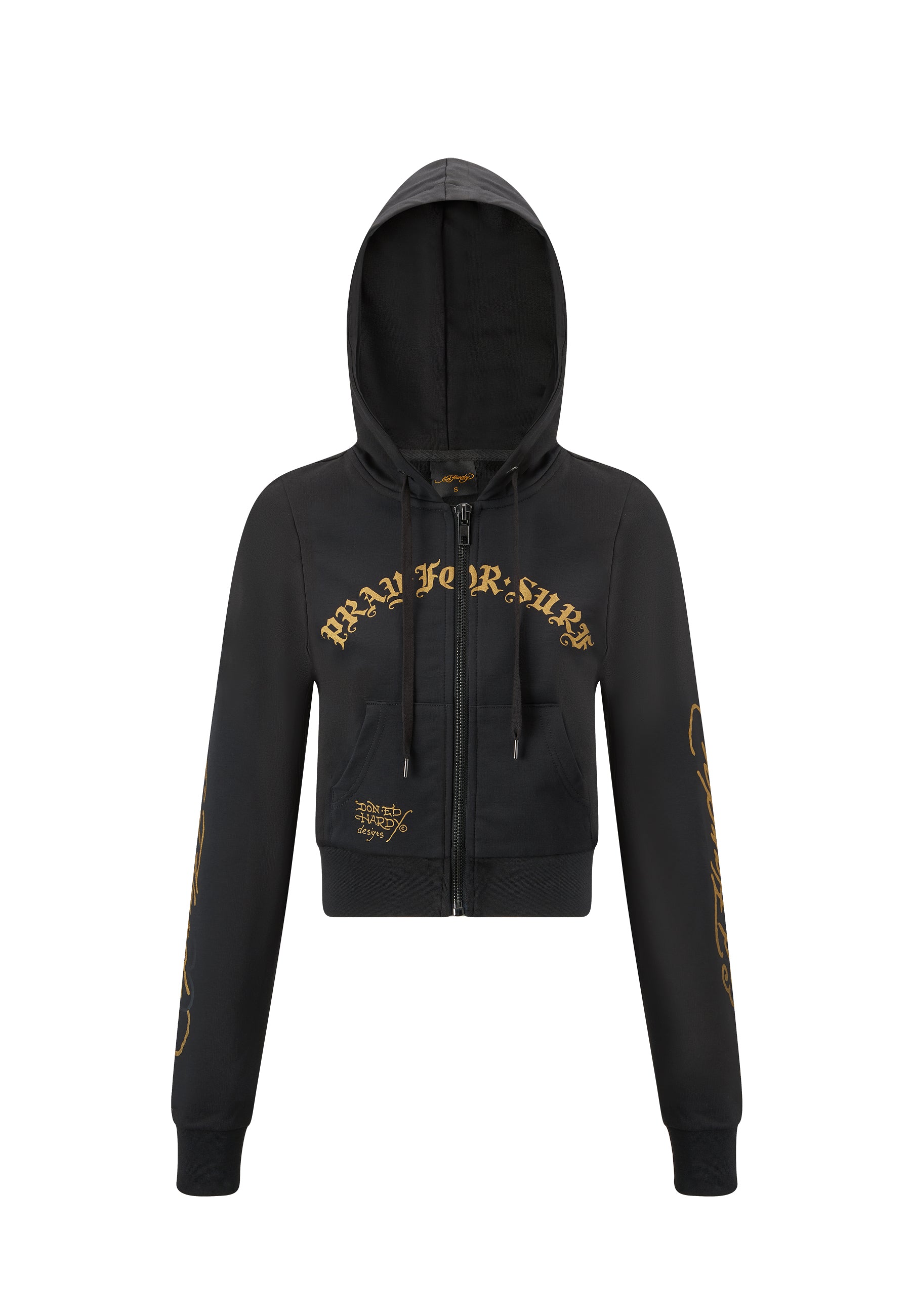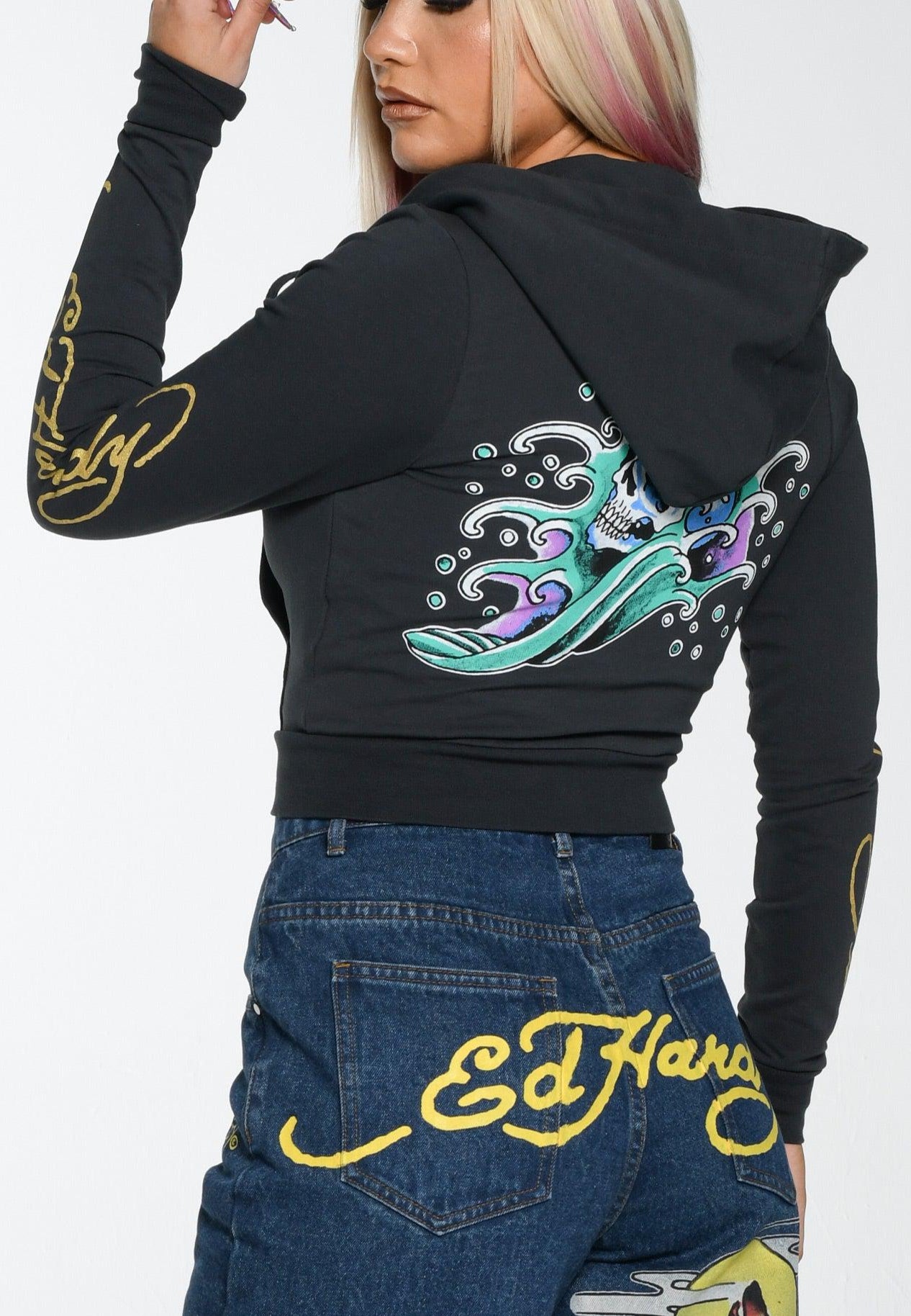 Womens Pray-For-Surf Cropped Graphic Zip Through Hoodie - Charcoal
