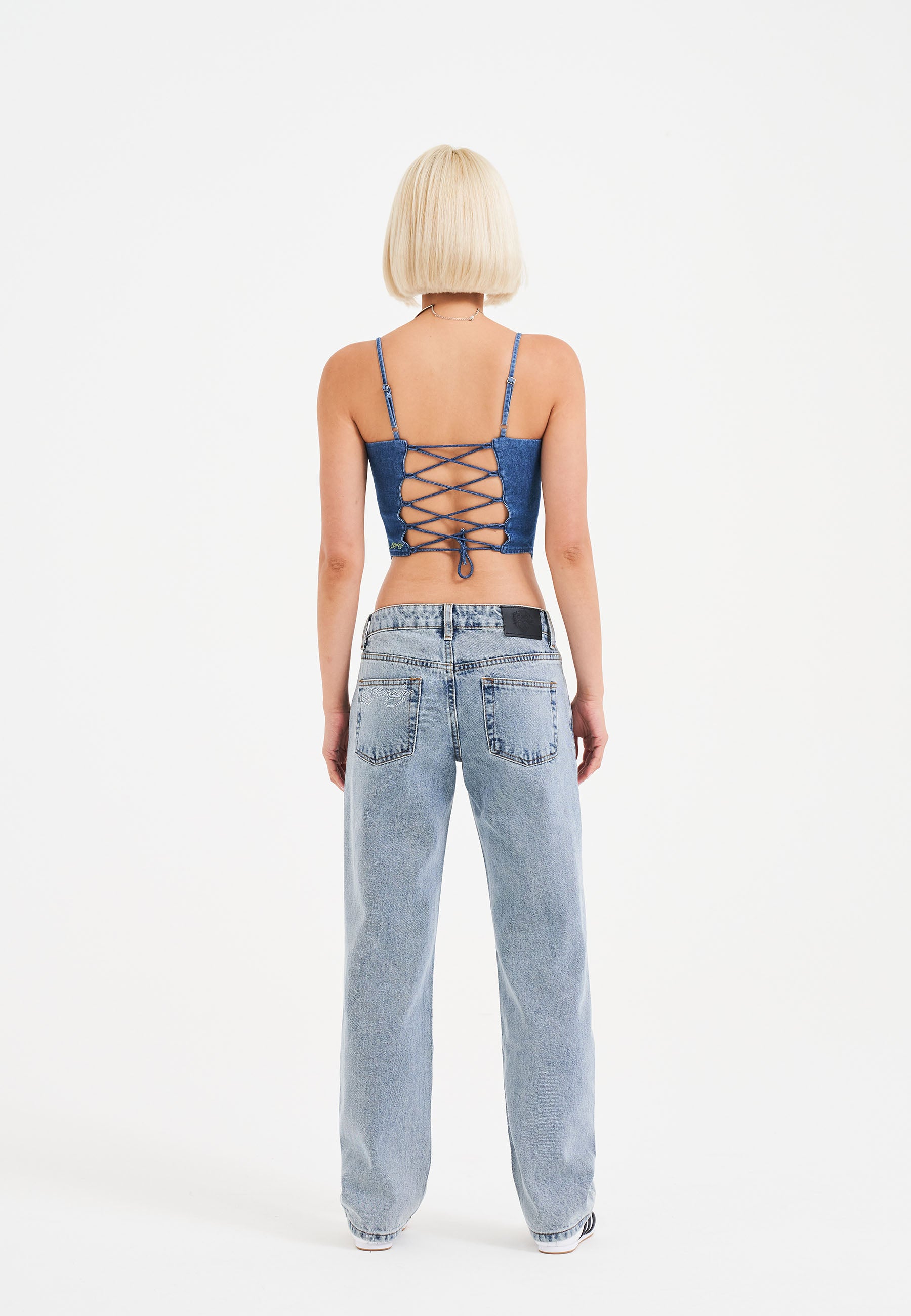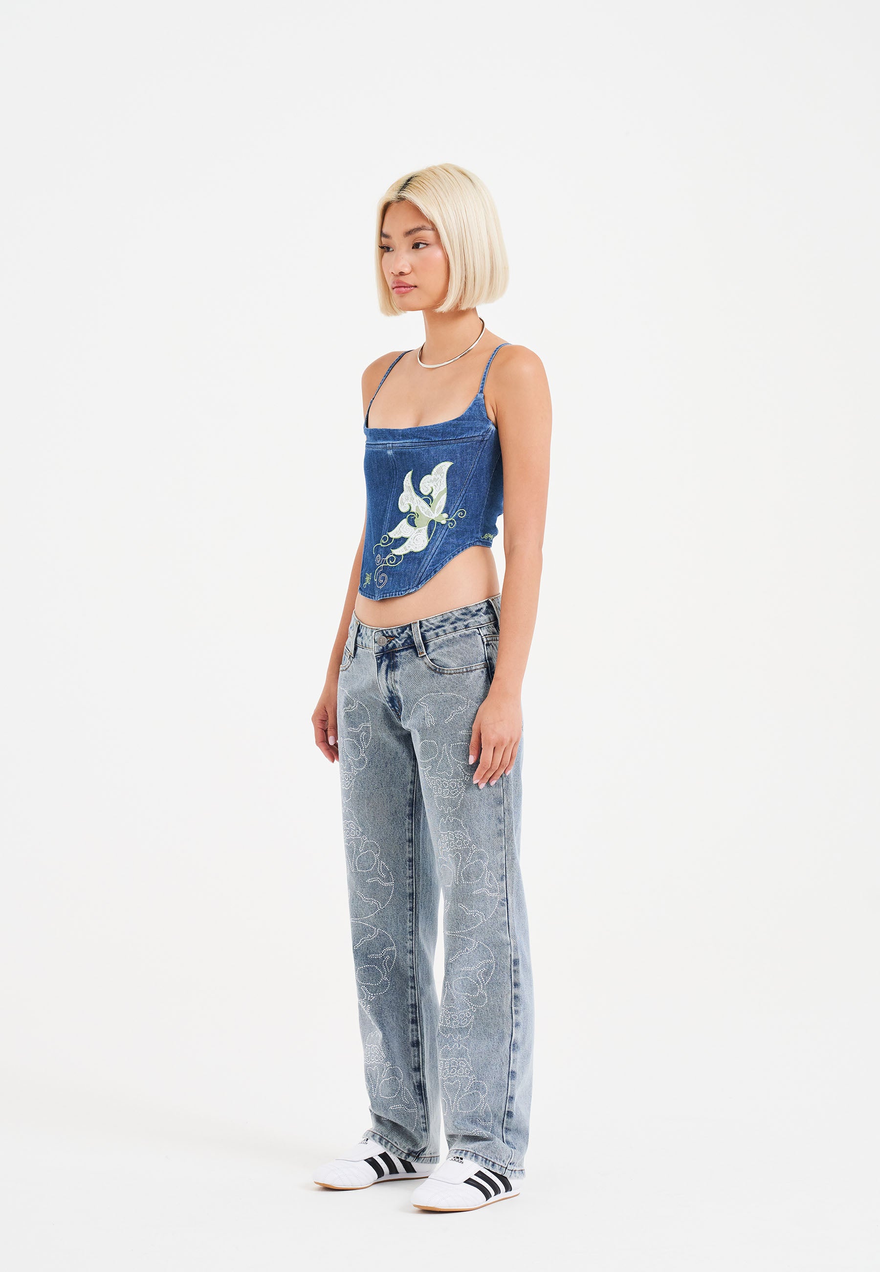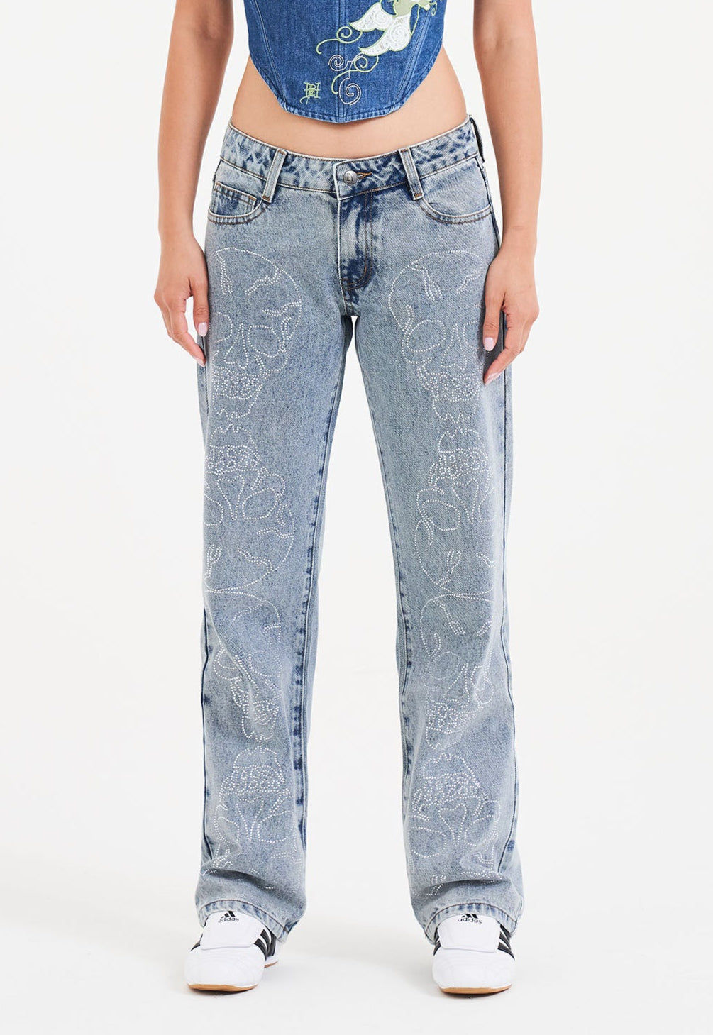 Womens Crystal Skull Straight Leg Denim Trousers Jeans - Blue
