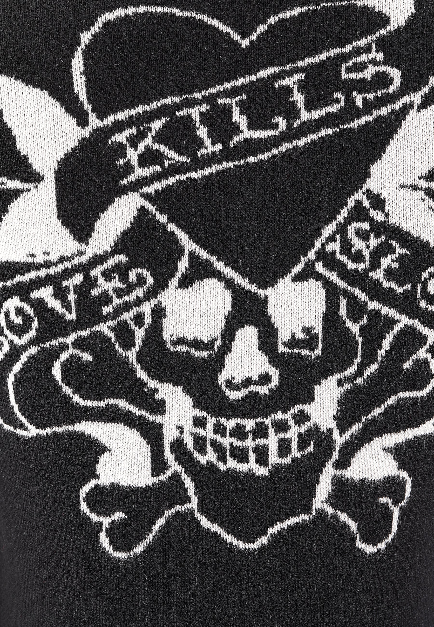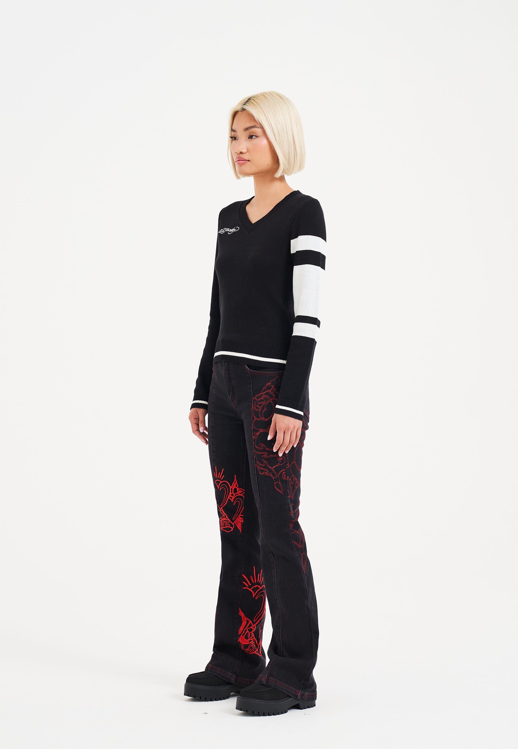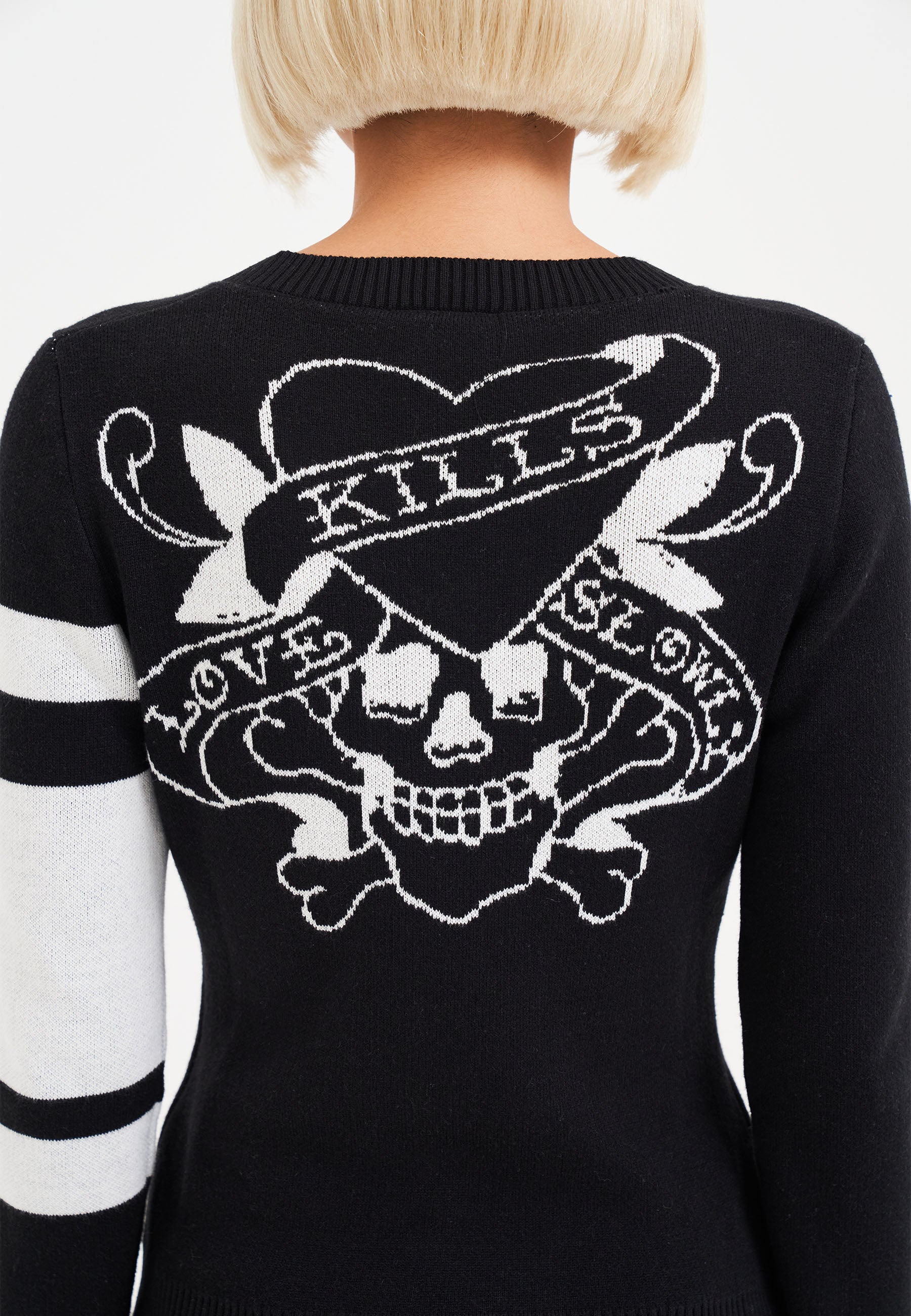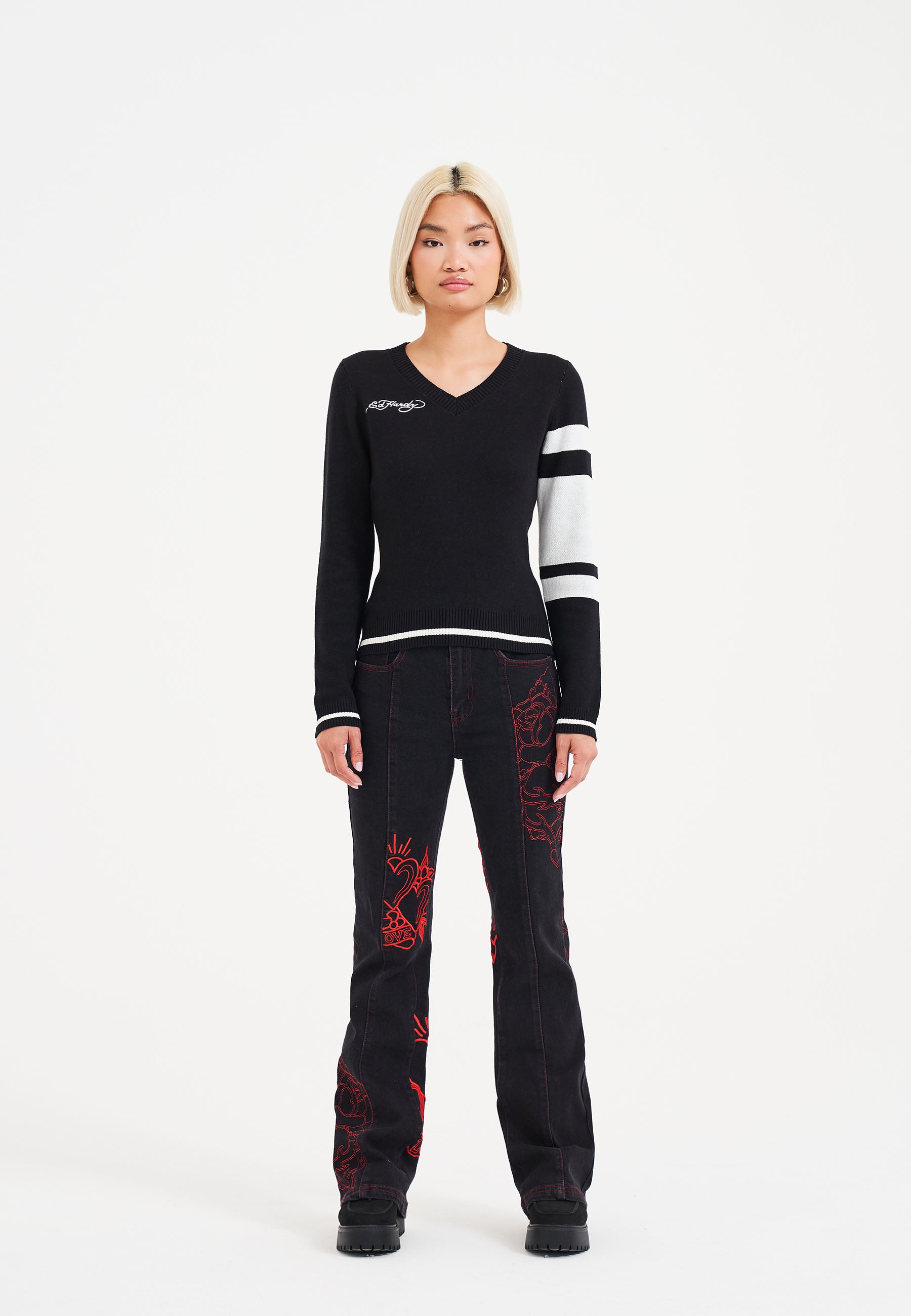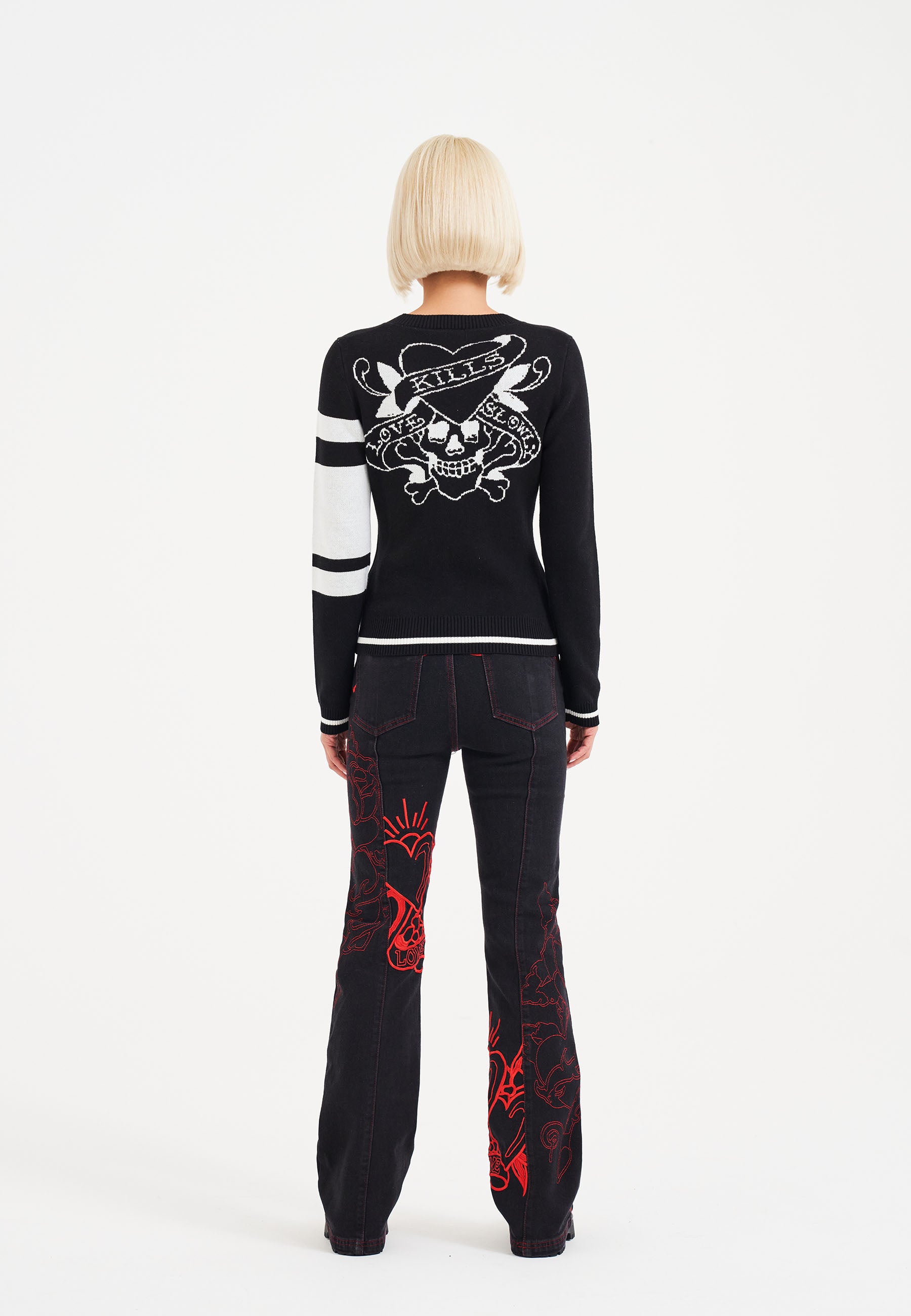 The AW V-Neck Love Kills Jumper showcases the legendary emblem, in a tight-fit silhouette, contrasting arm detail and subtle knit detailing along the hem and cuffs.