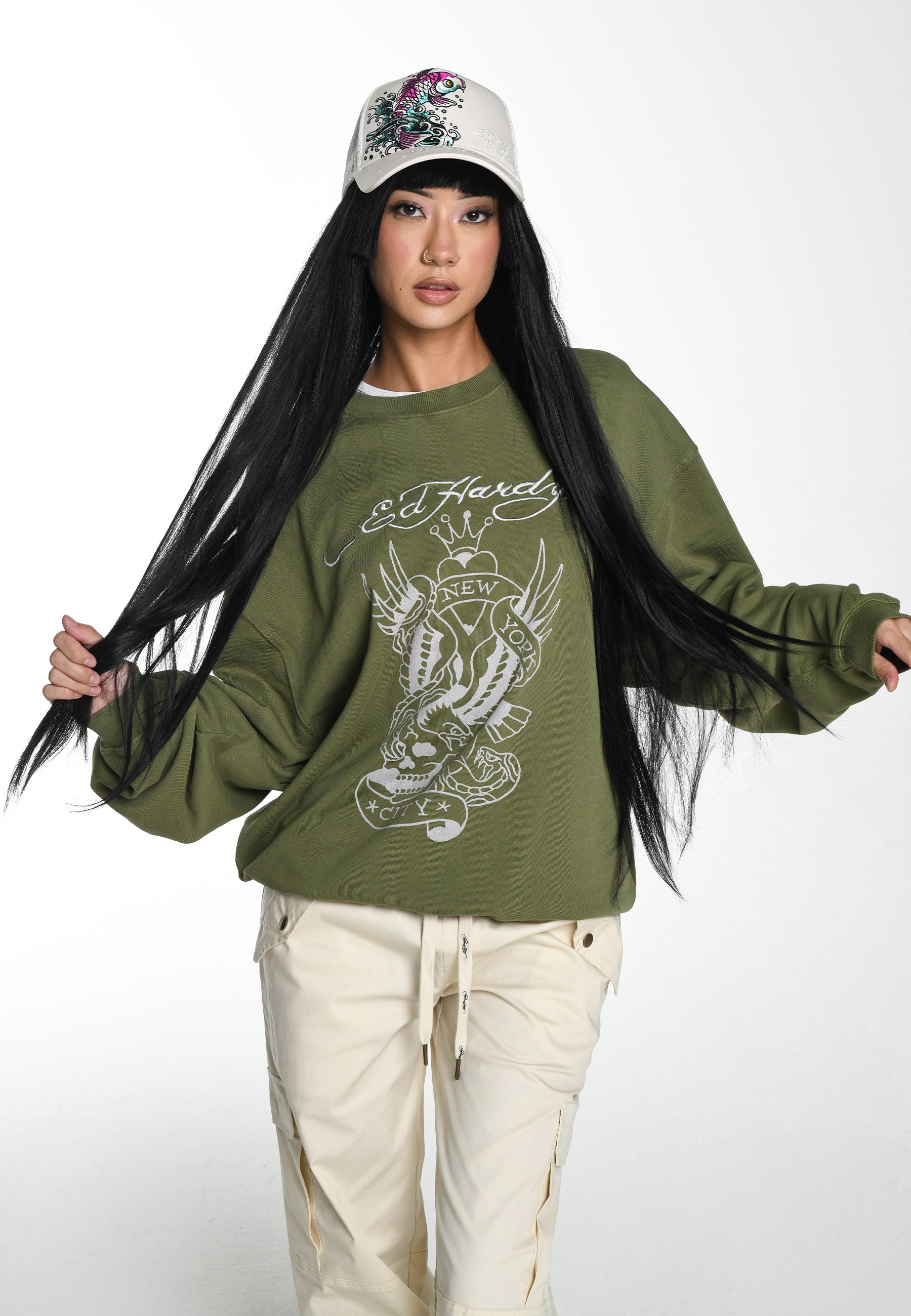 Introducing the NYC Crew Neck Jumper, a new gem in Ed's collection. Crafted from super-soft Olive Cotton Terry, it's destined to be your go-to fit this season. With a tonal monochrome front-print, this piece effortlessly embodies the evolution of Ed Hardy designs. Elevate your style.