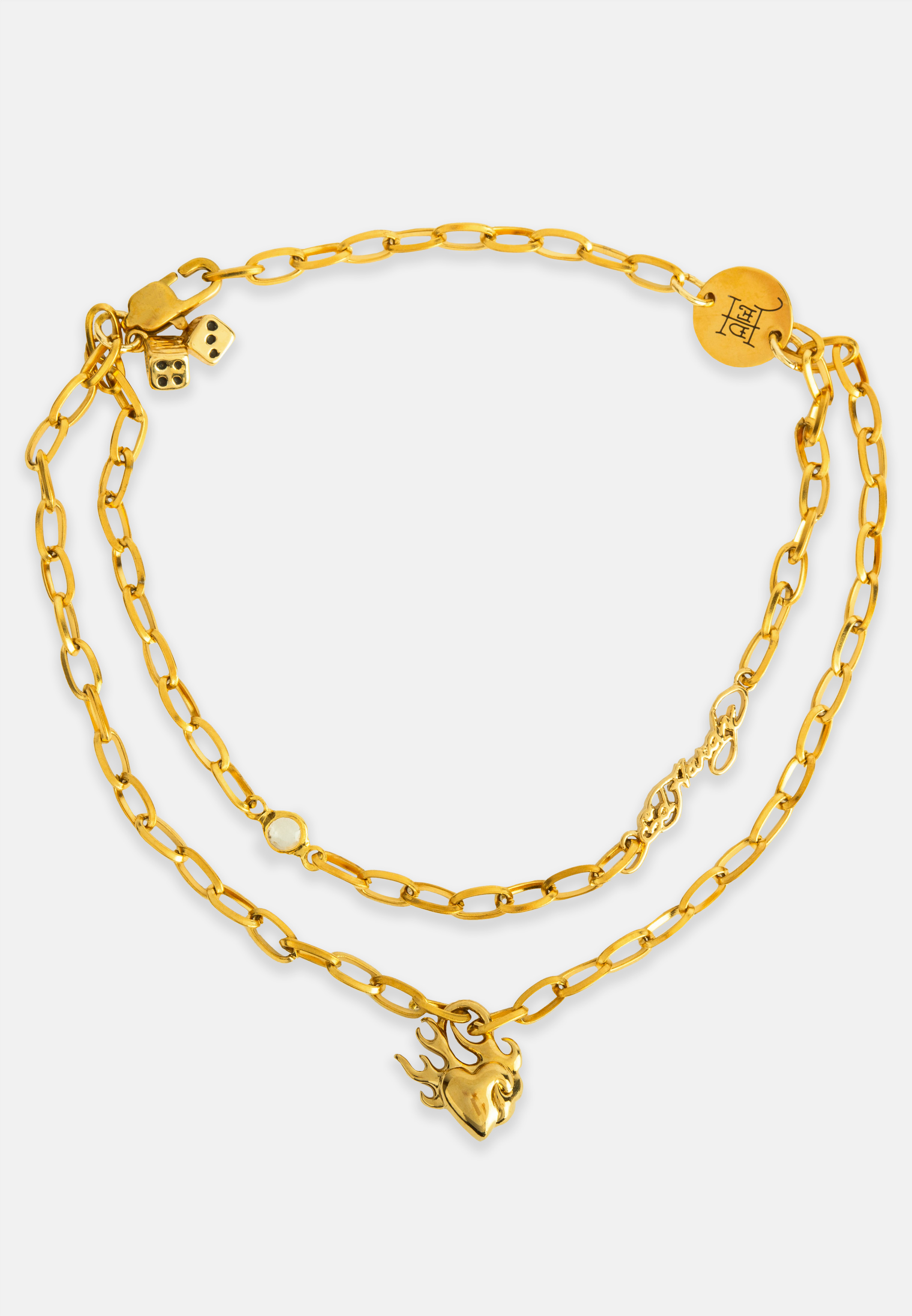 Double row oval link bracelet with custom cast Ed Hardy logo, Dice charm and Flaming Heart Charms hand finished in an antique gold finish.