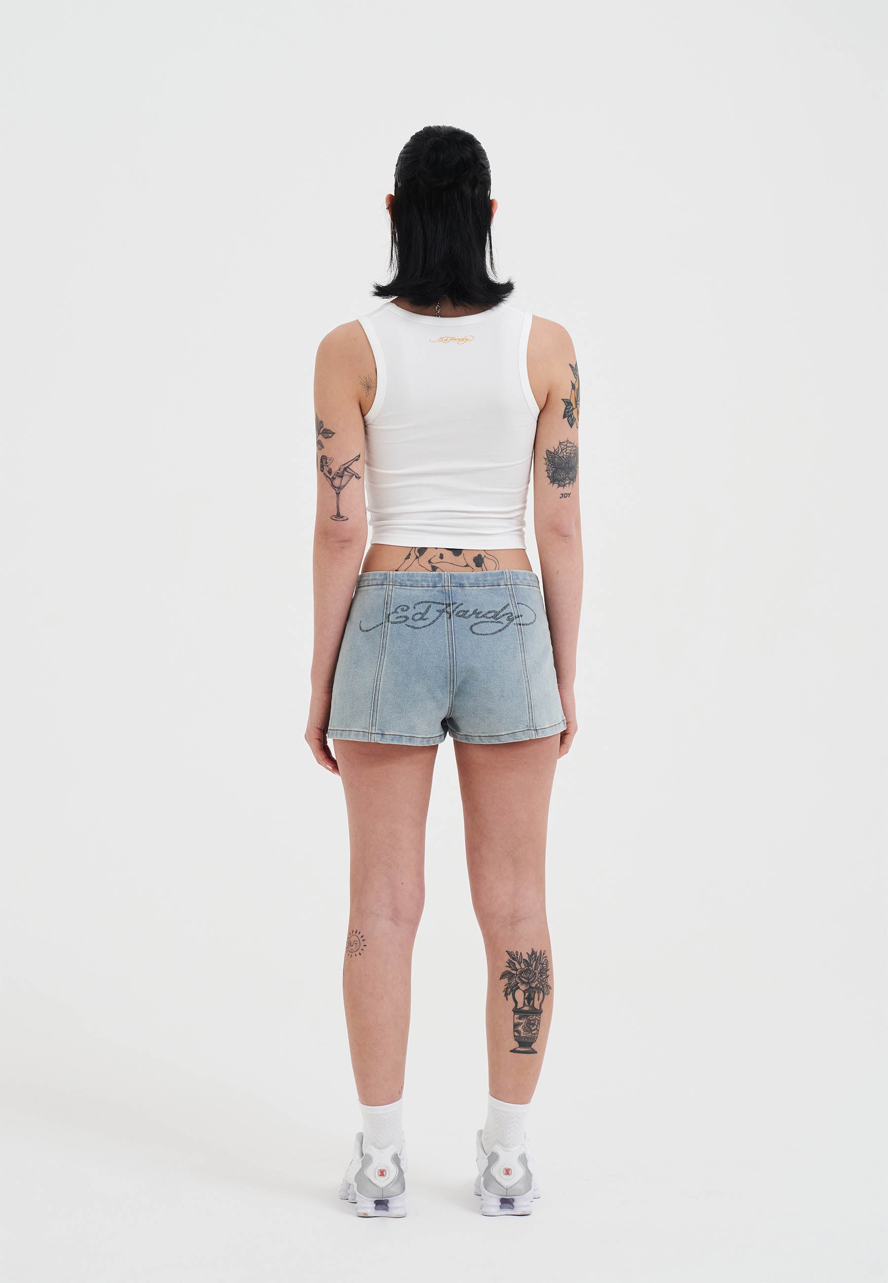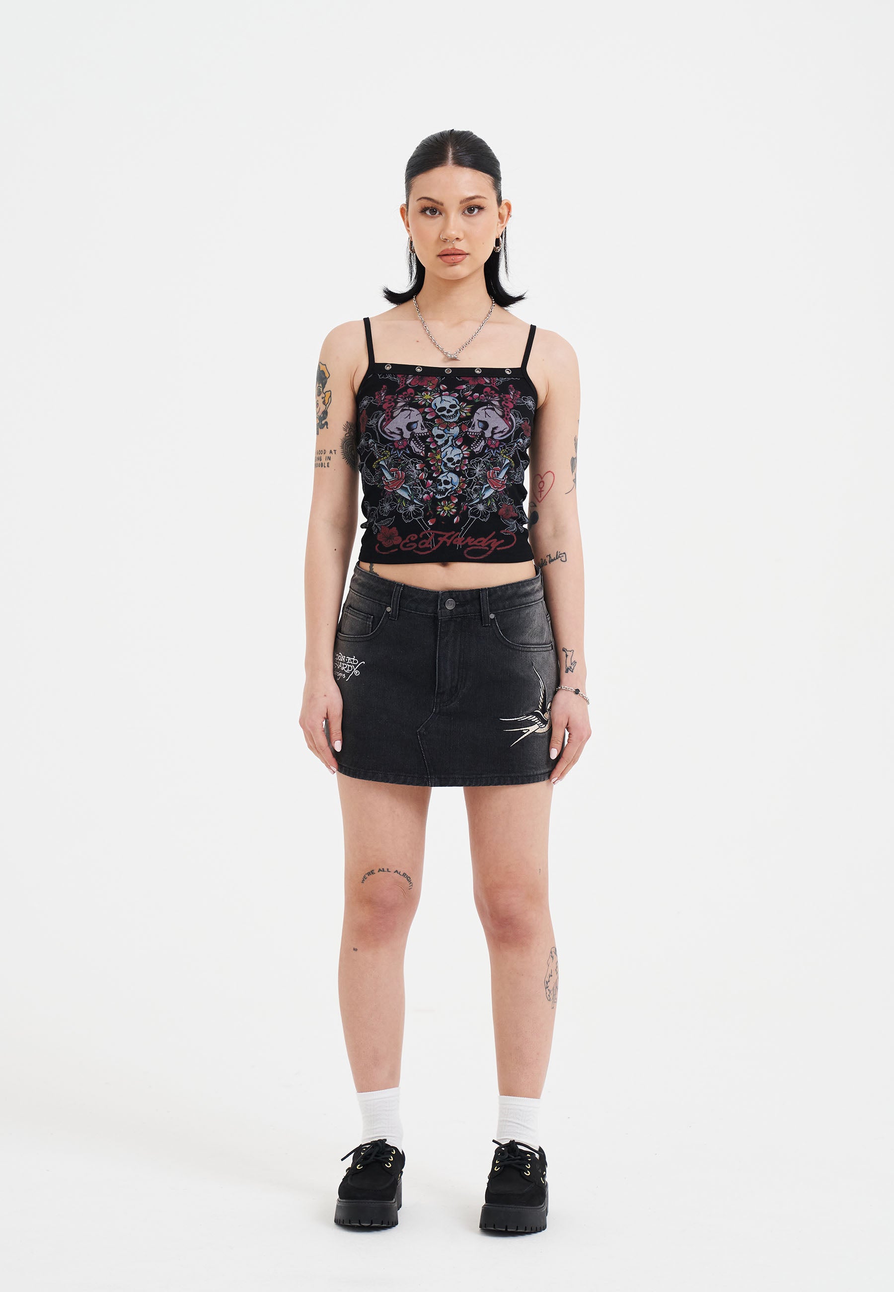 Womens Crawling Dragon Denim Mini Skirt - Blue