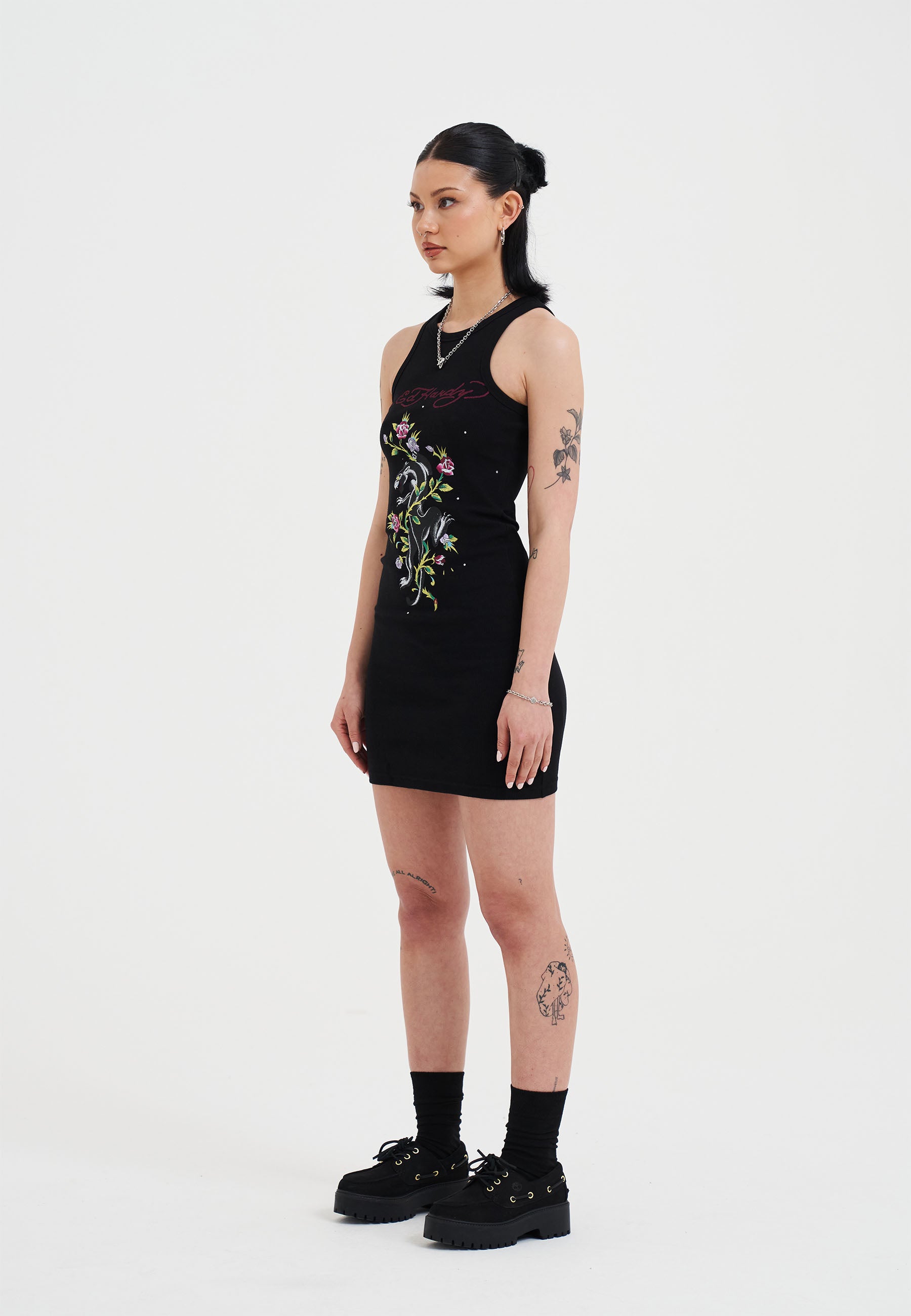 Womens Panther And Flowers Diamante Tank Dress - Black