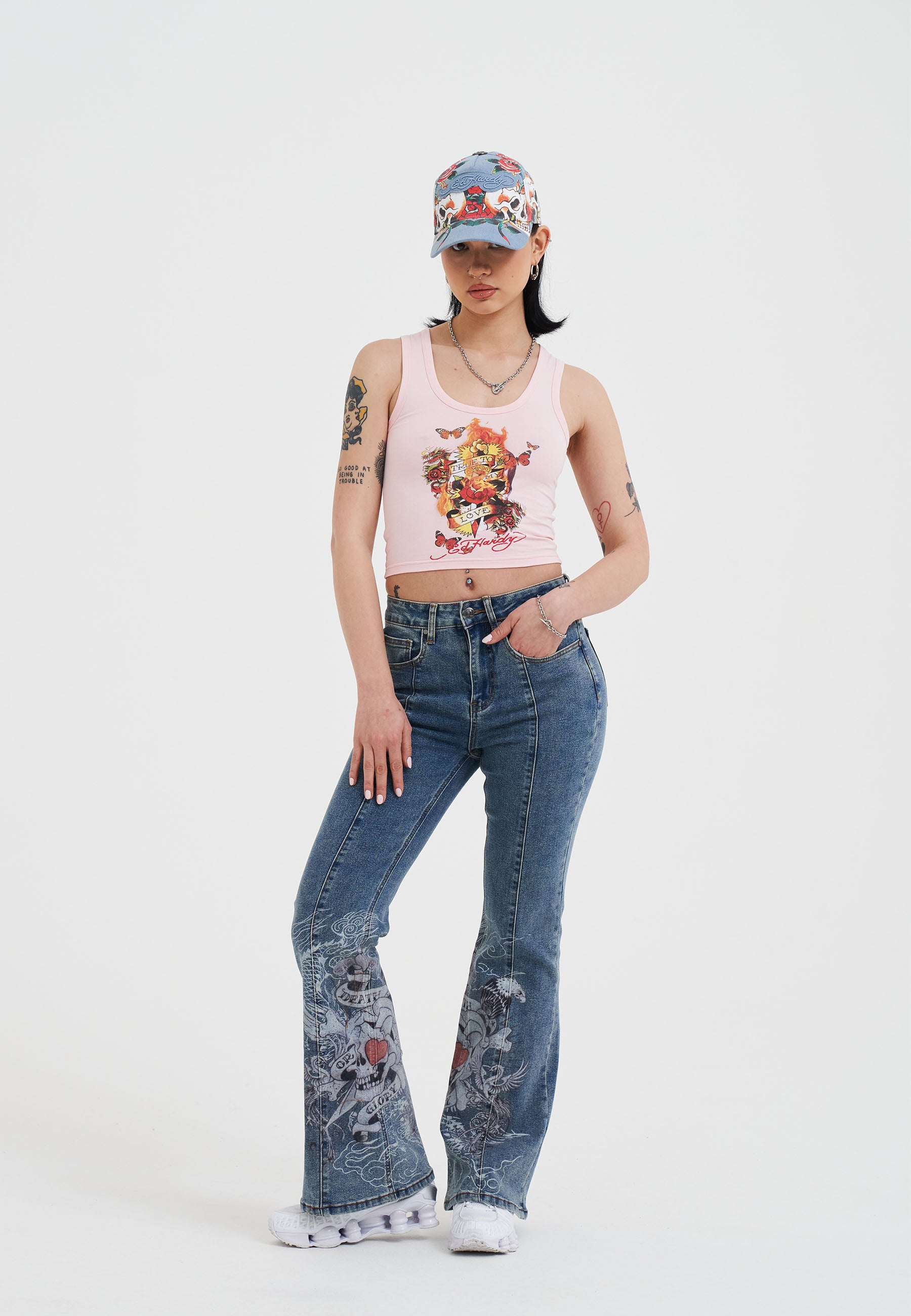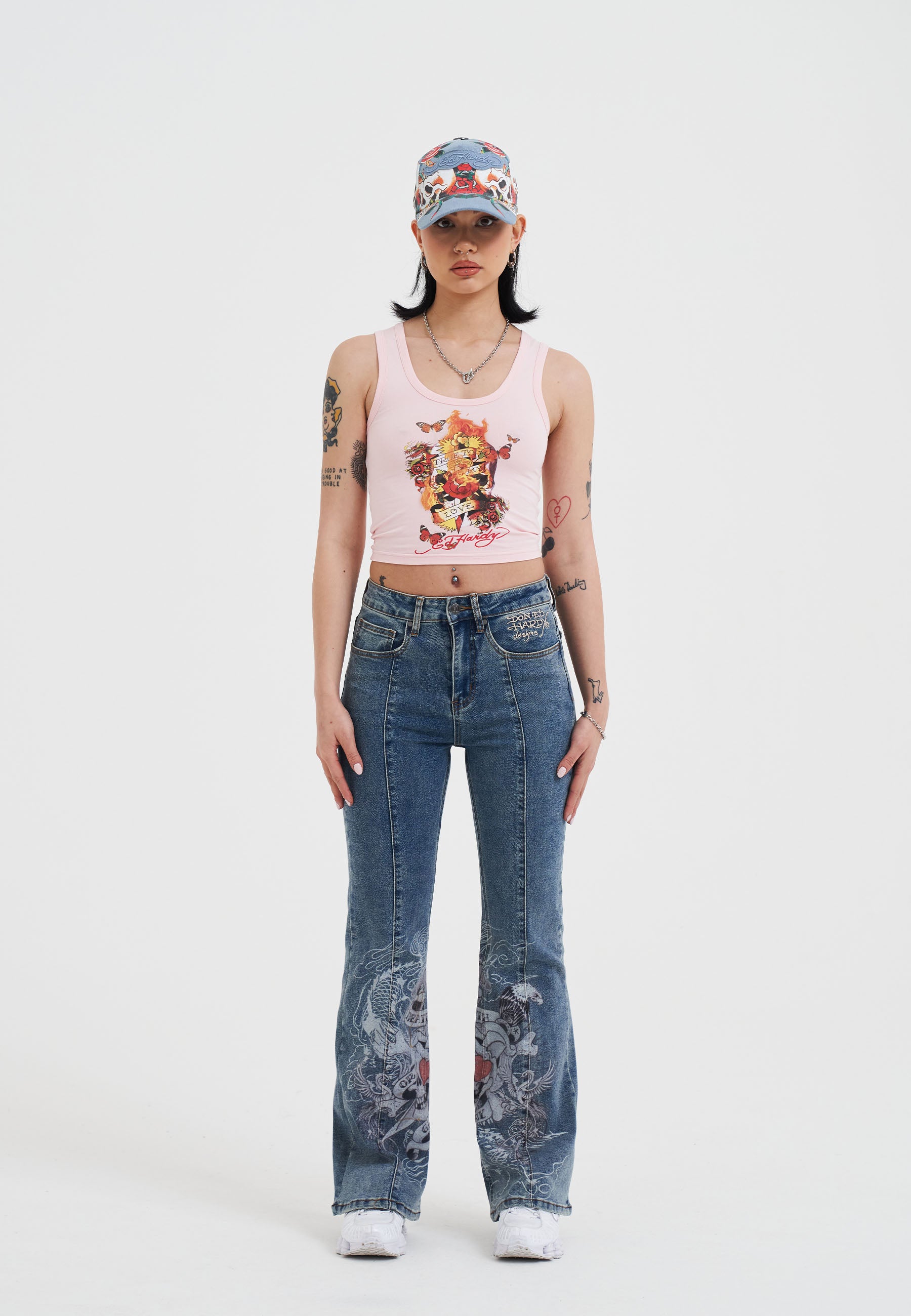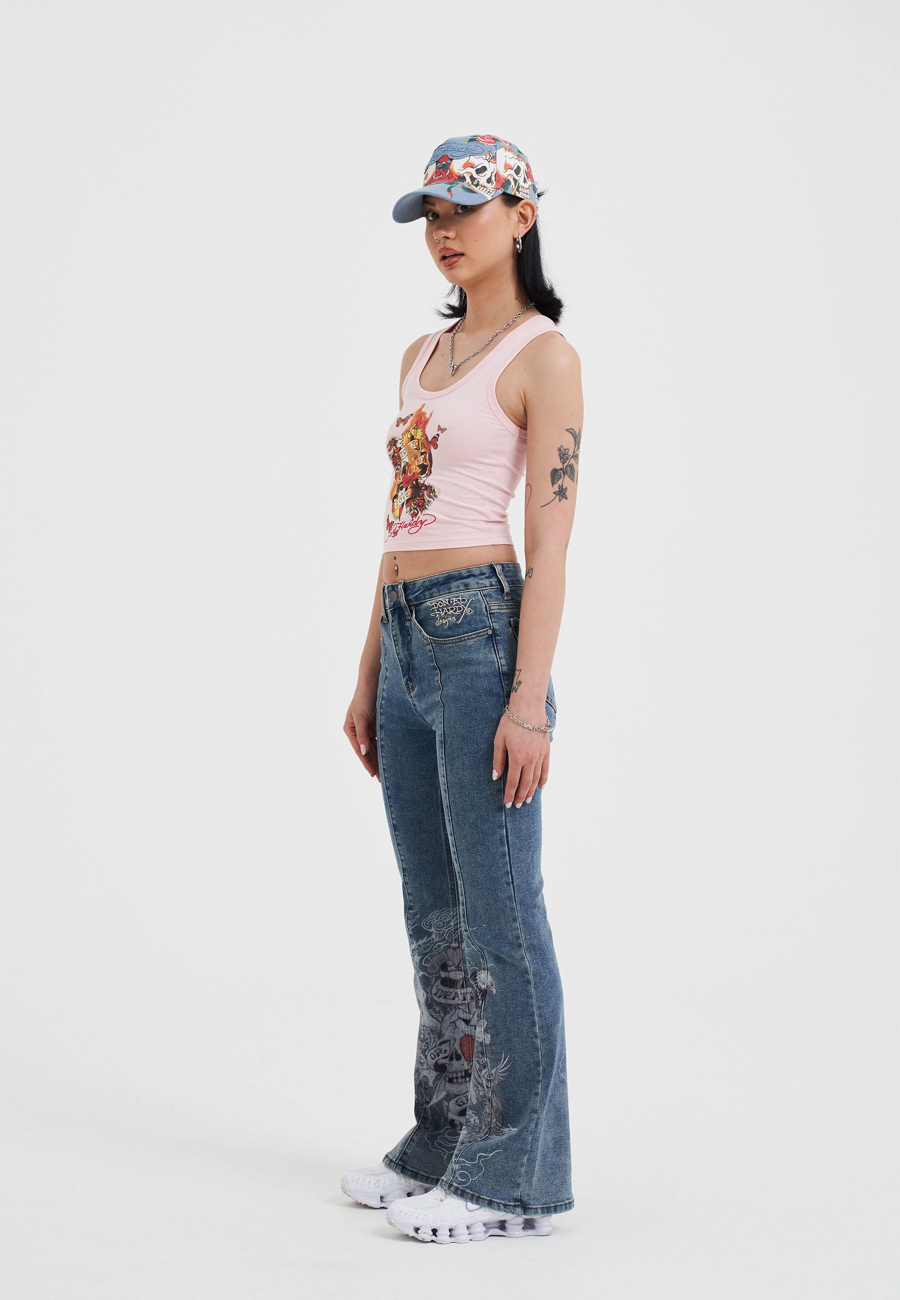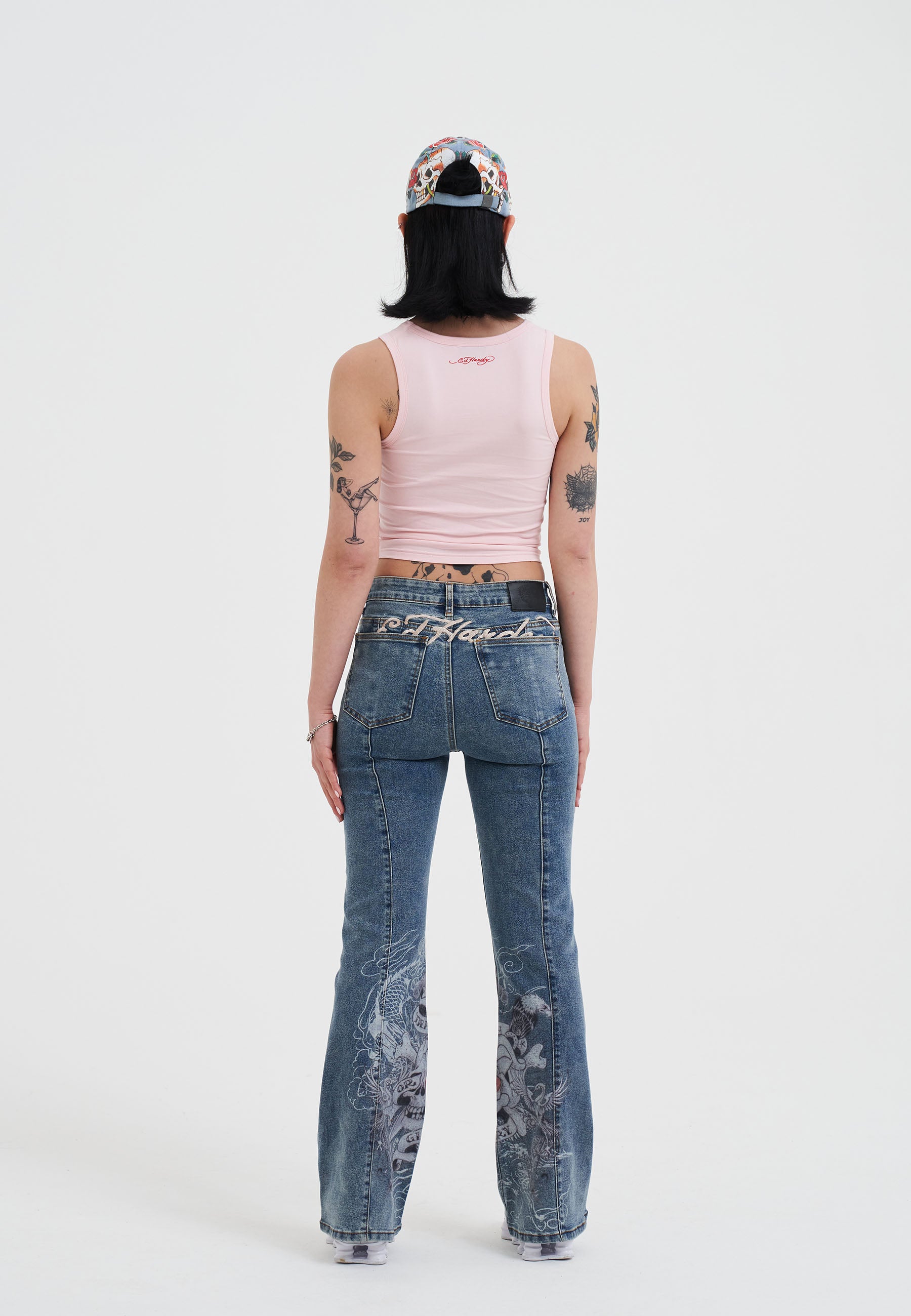 Womens Crystal Crawler Diamante Relaxed Denim Trousers Jeans - Indigo
