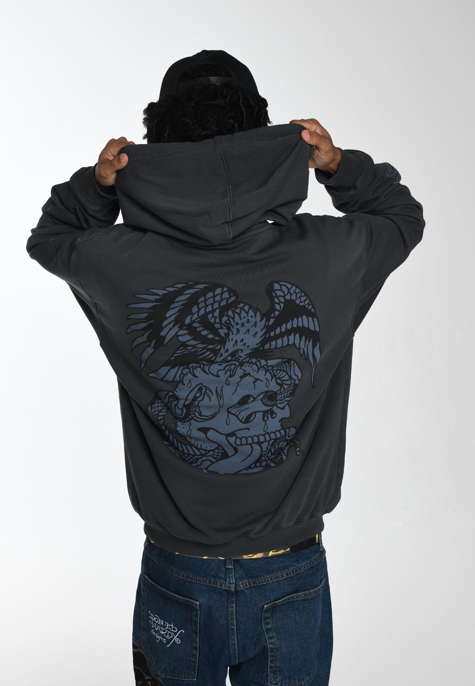 The Eye Ball Hoodie has been crafted with 100% cotton for supreme comfort. Featuring a large faded-blue skull graphic across the full-back and a small Ed Hardy monogram on the front of the chest; this piece has been designed for generations of wear.