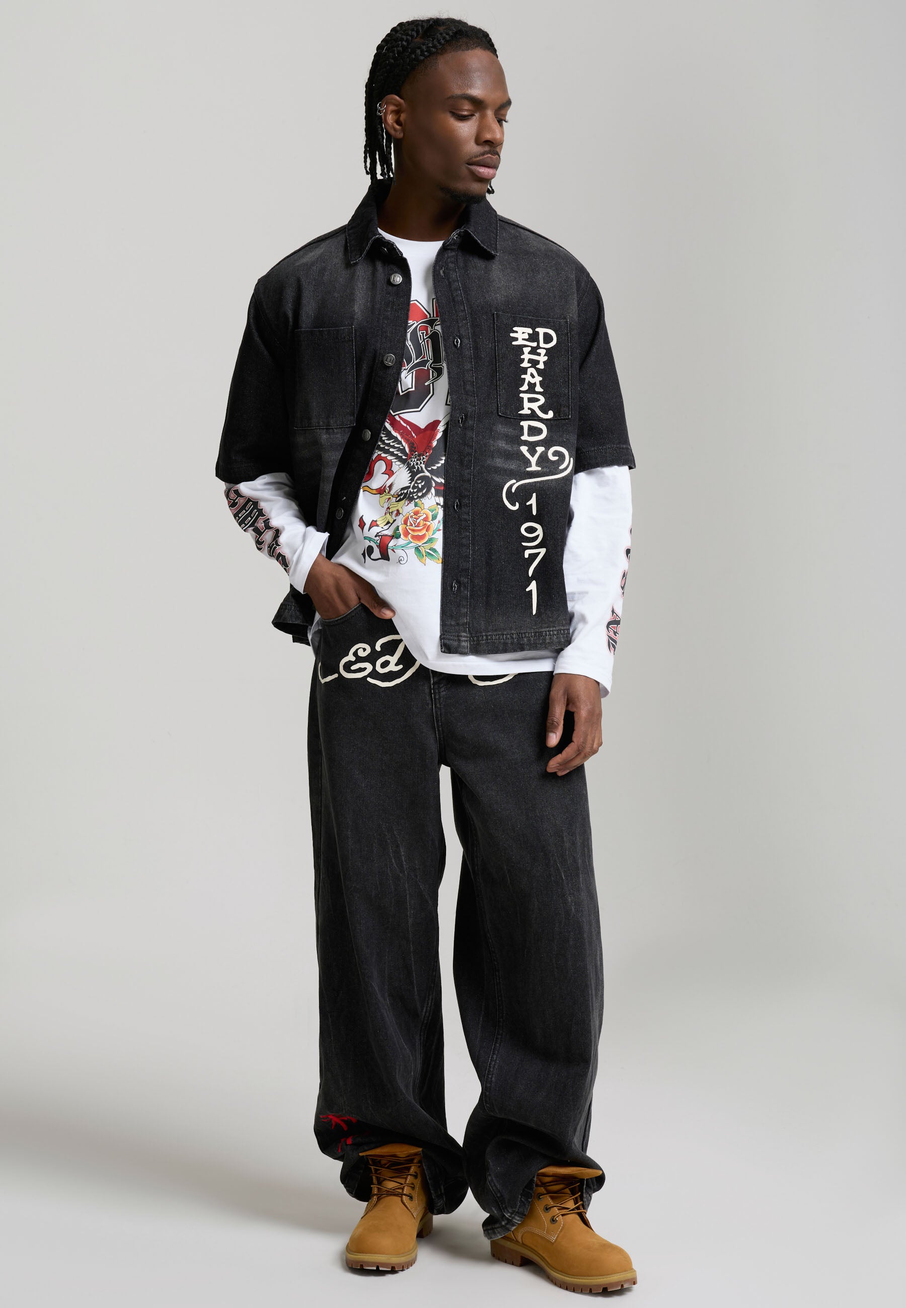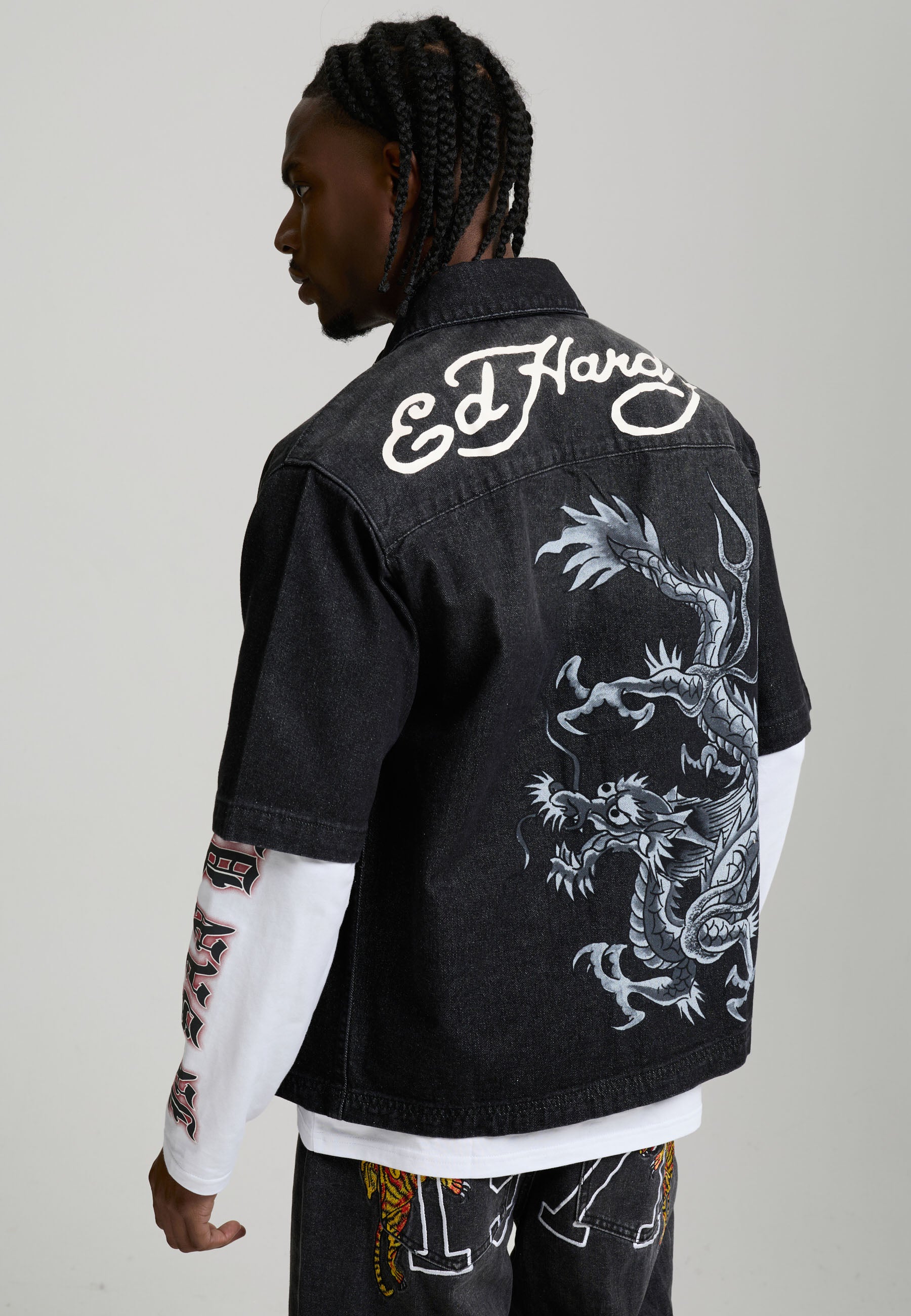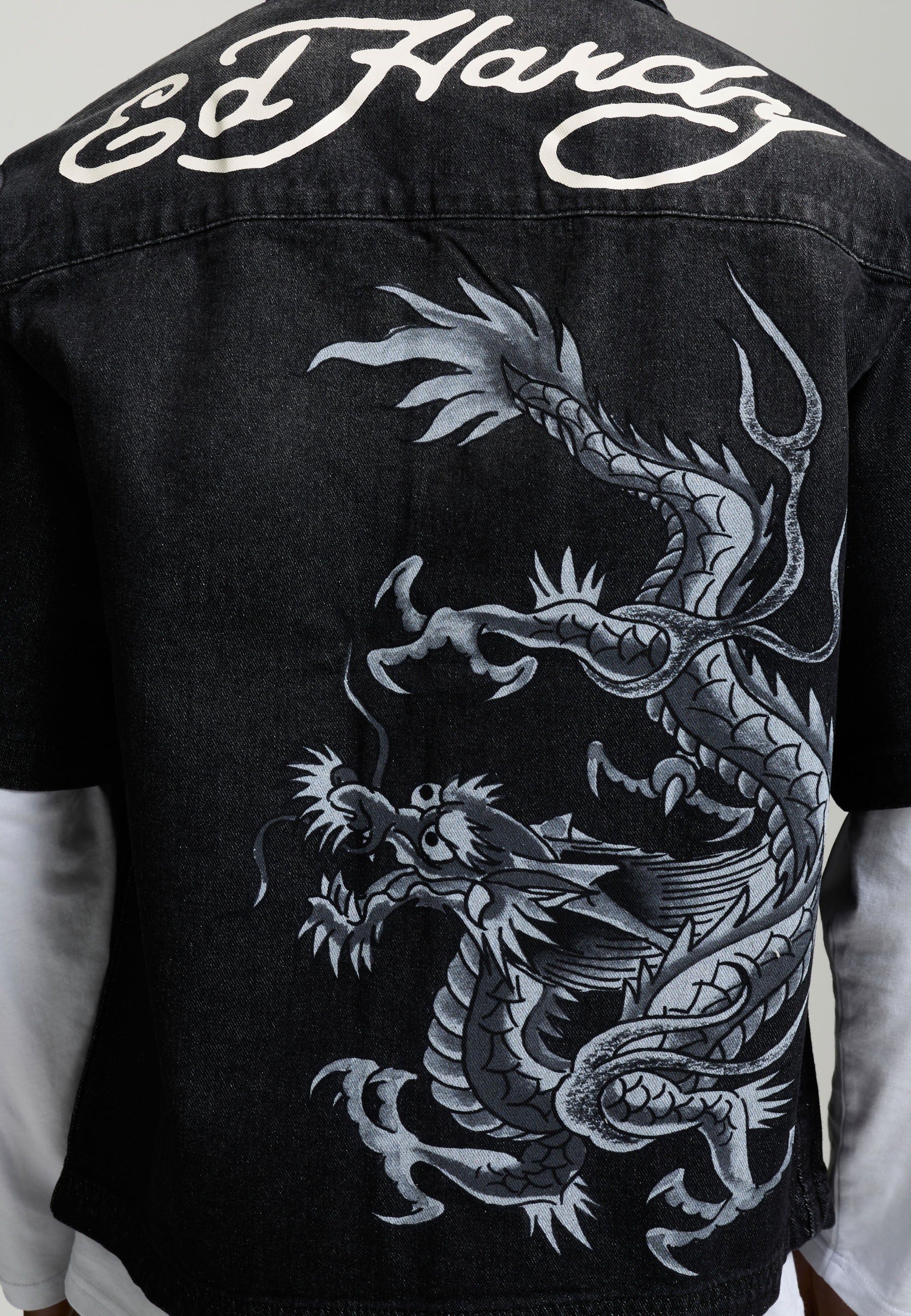 Mens Tonal Dragon Utility Denim Shirt - Black