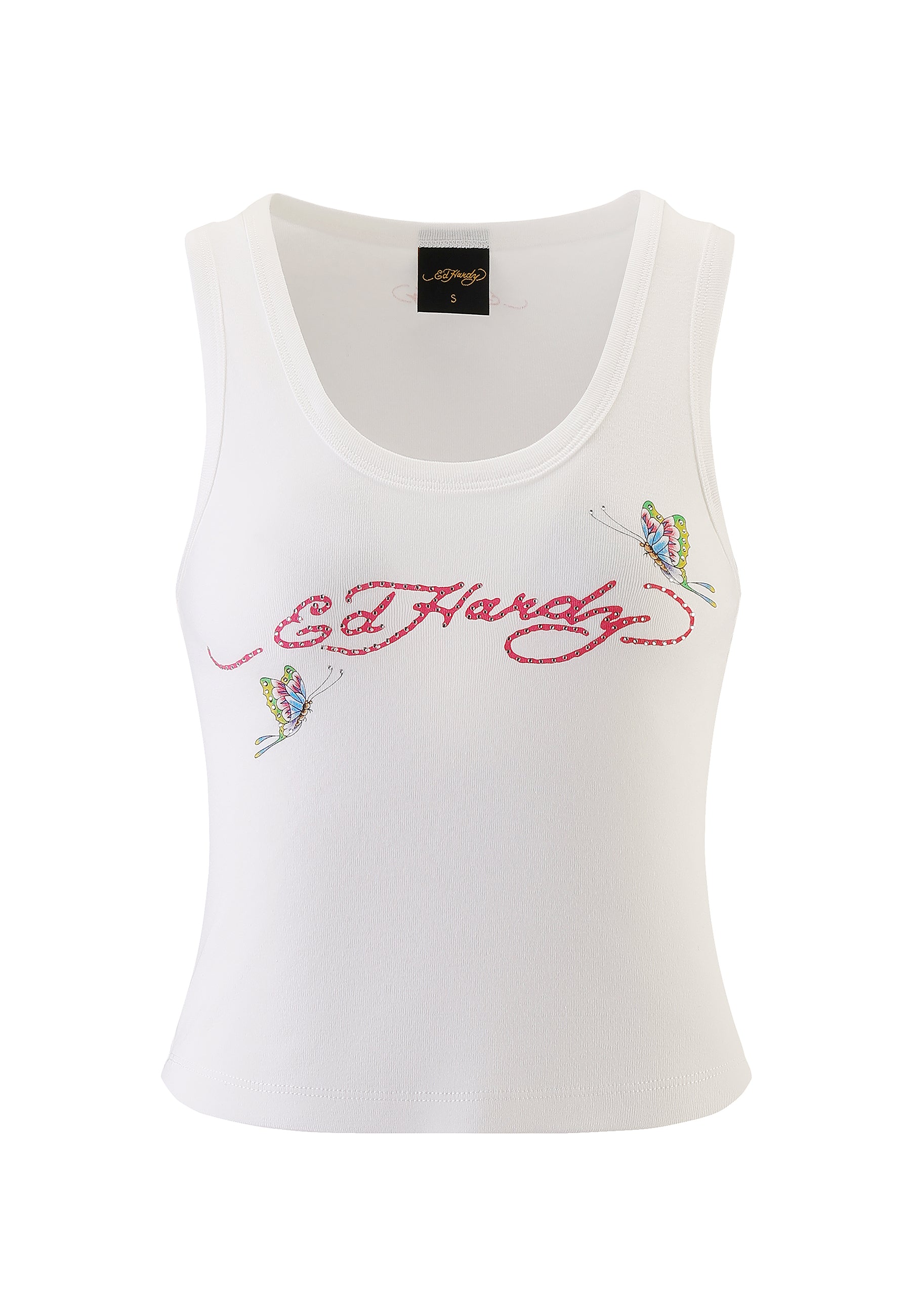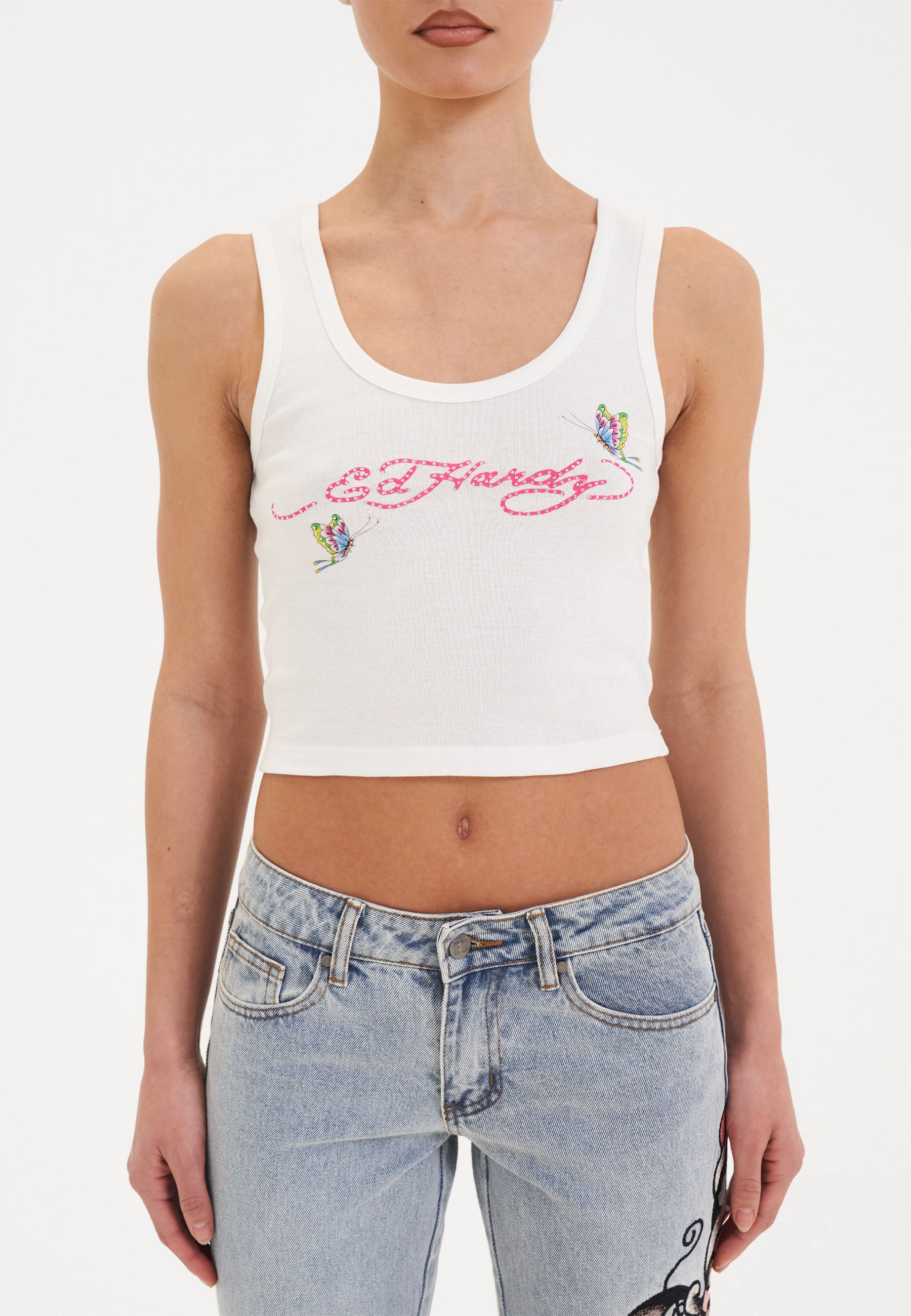 Womens Butterfly Party Rhinestone Cropped Vest Top - White