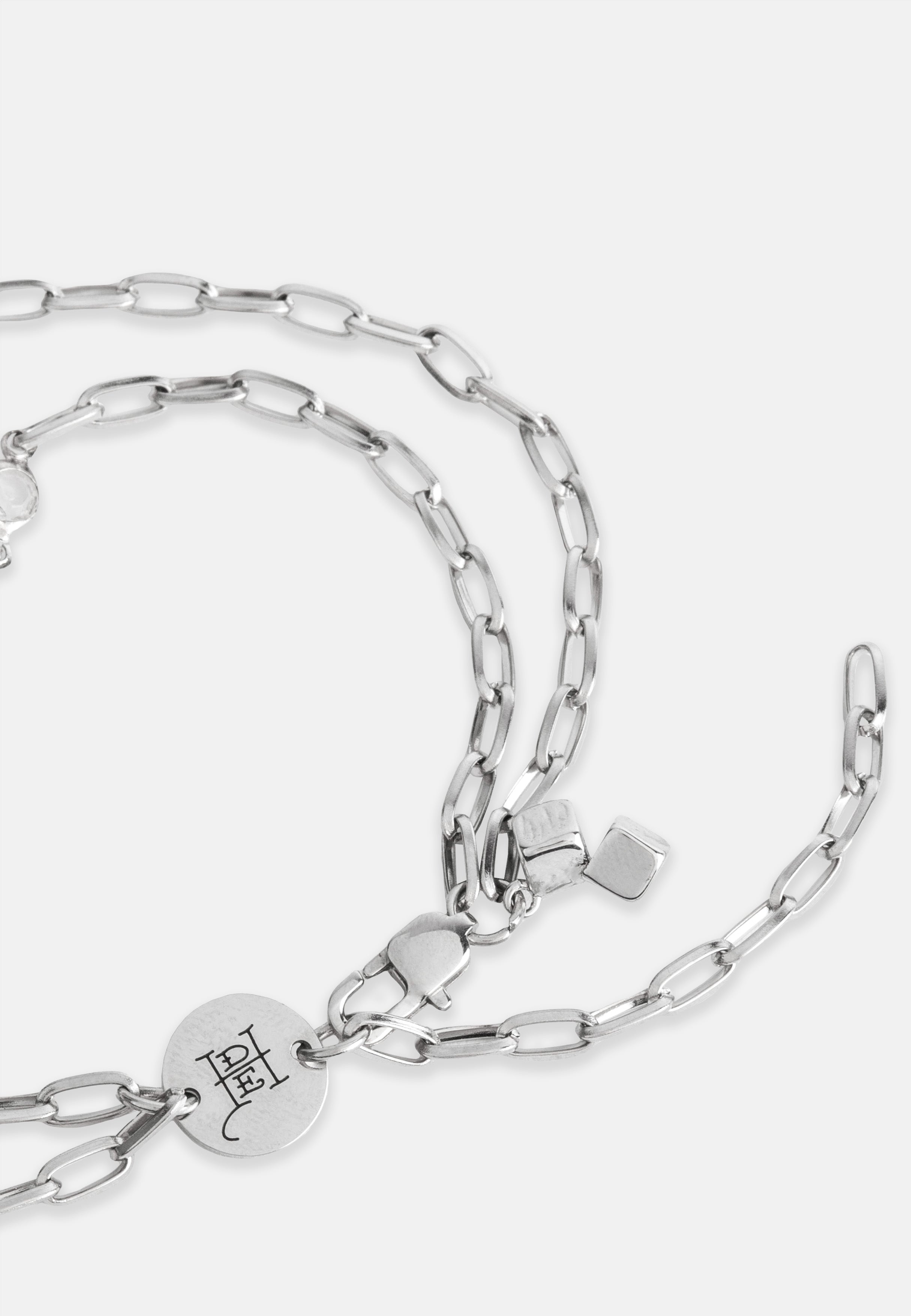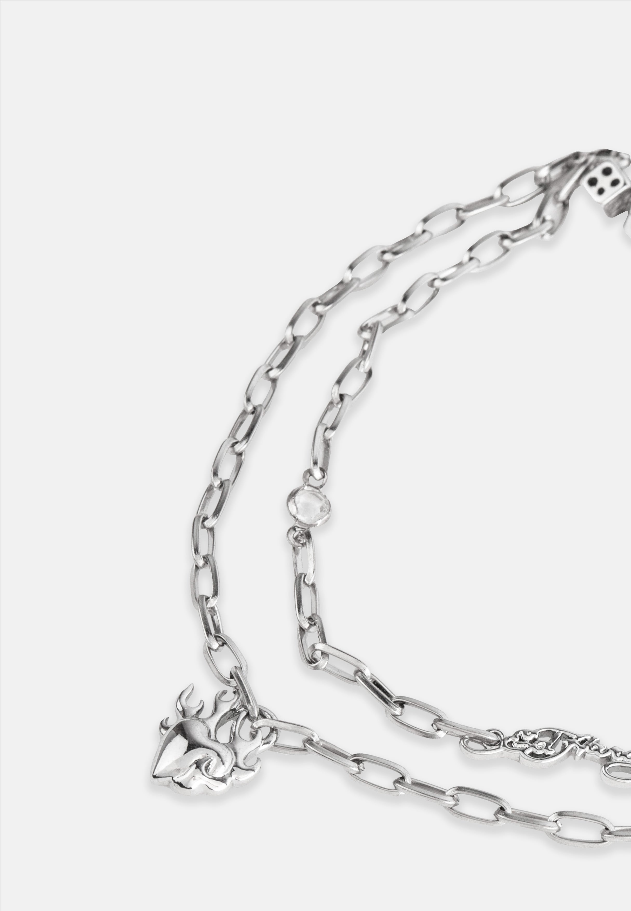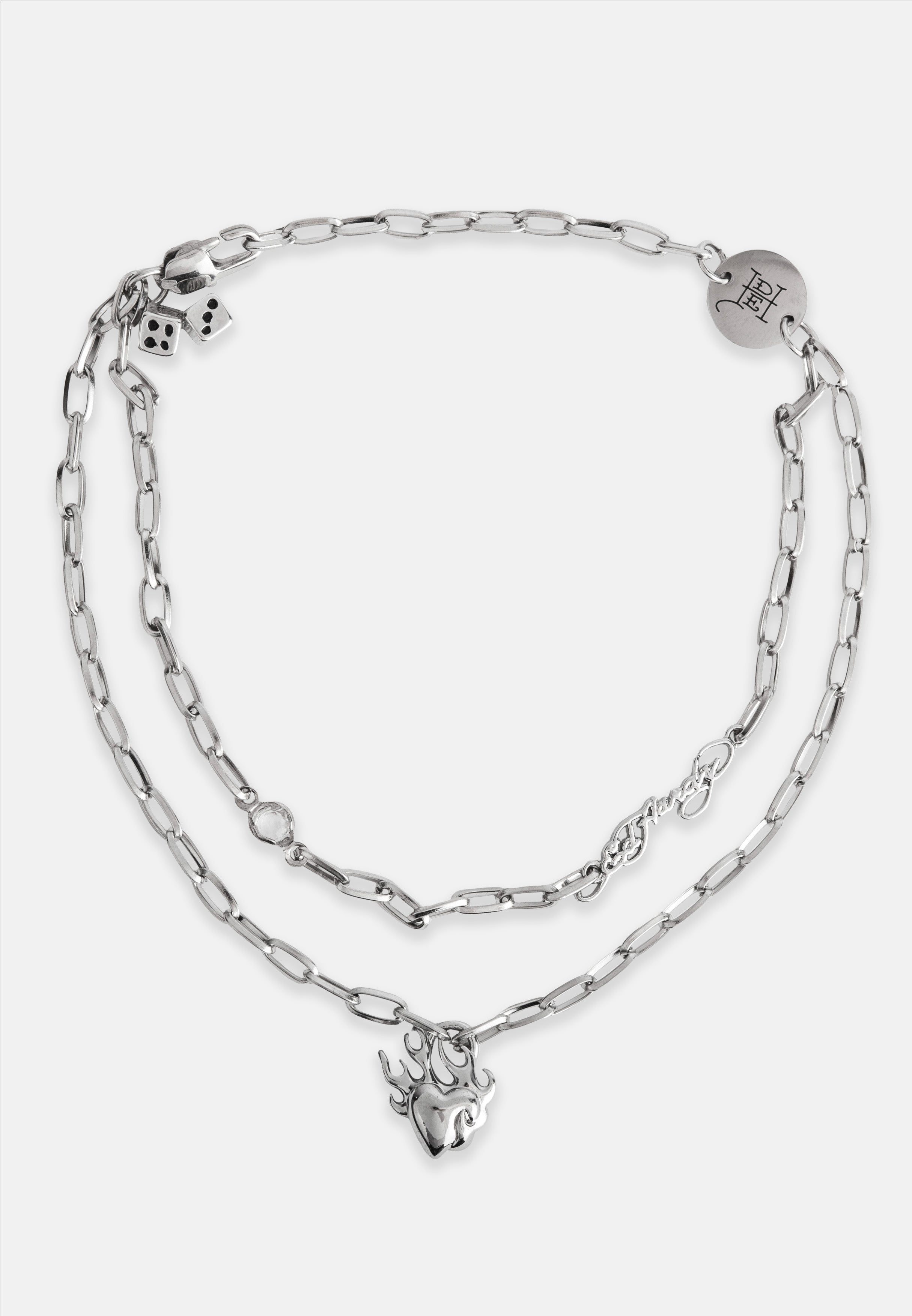 Double row oval link bracelet with custom cast Ed Hardy logo, Dice charm and Flaming Heart Charms hand finished in an antique silver finish.