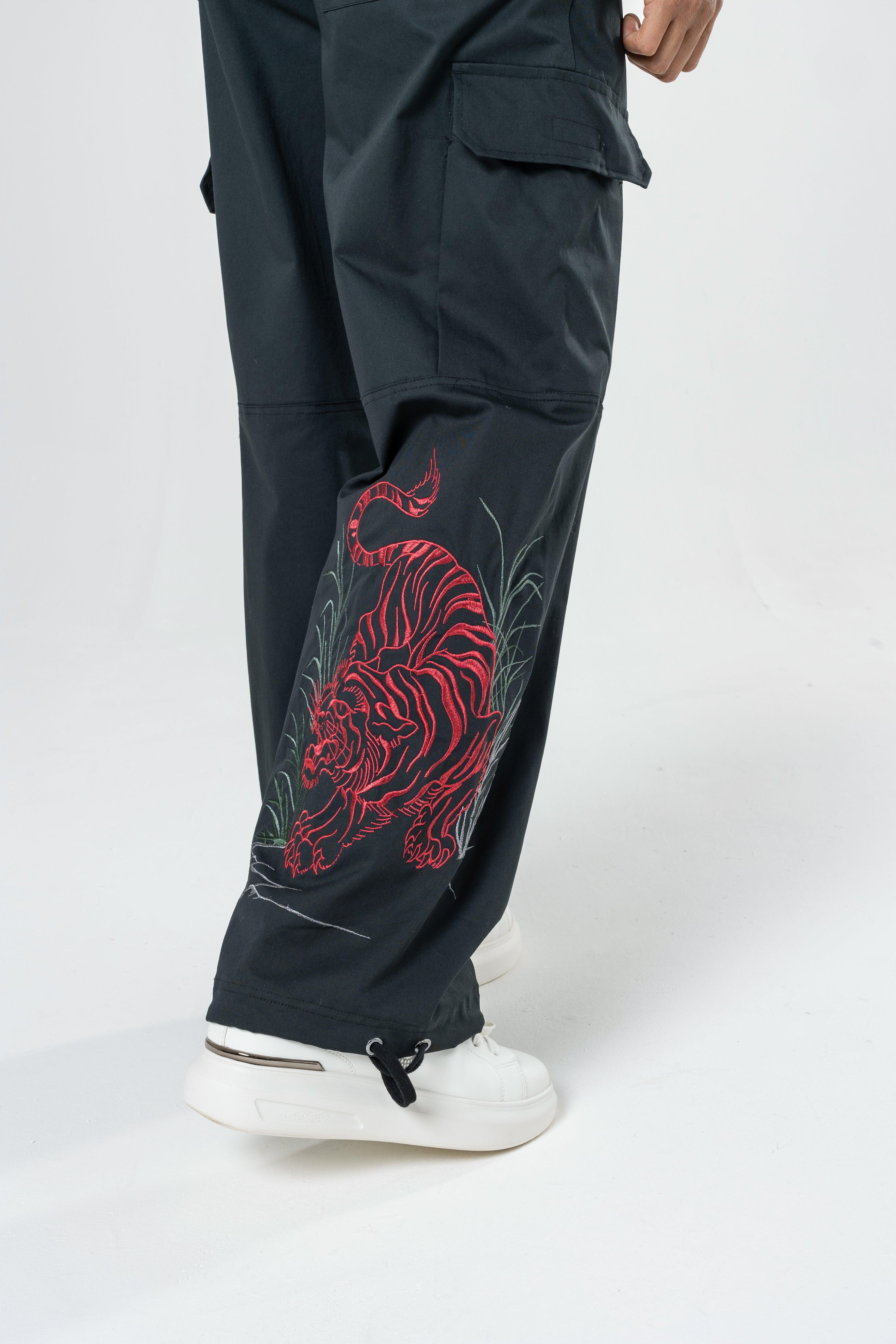 Mens Jungle Tiger Cargo Pants Trousers - Black