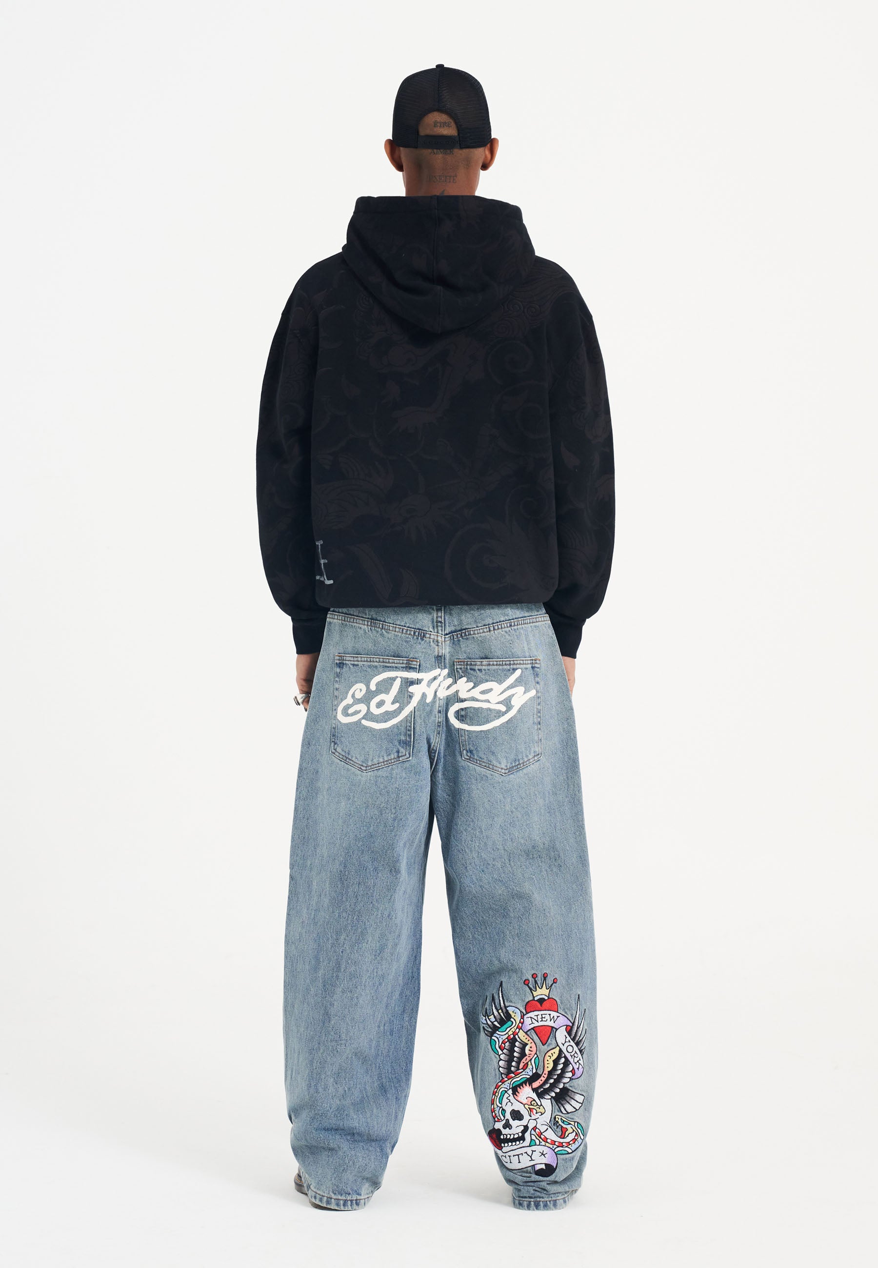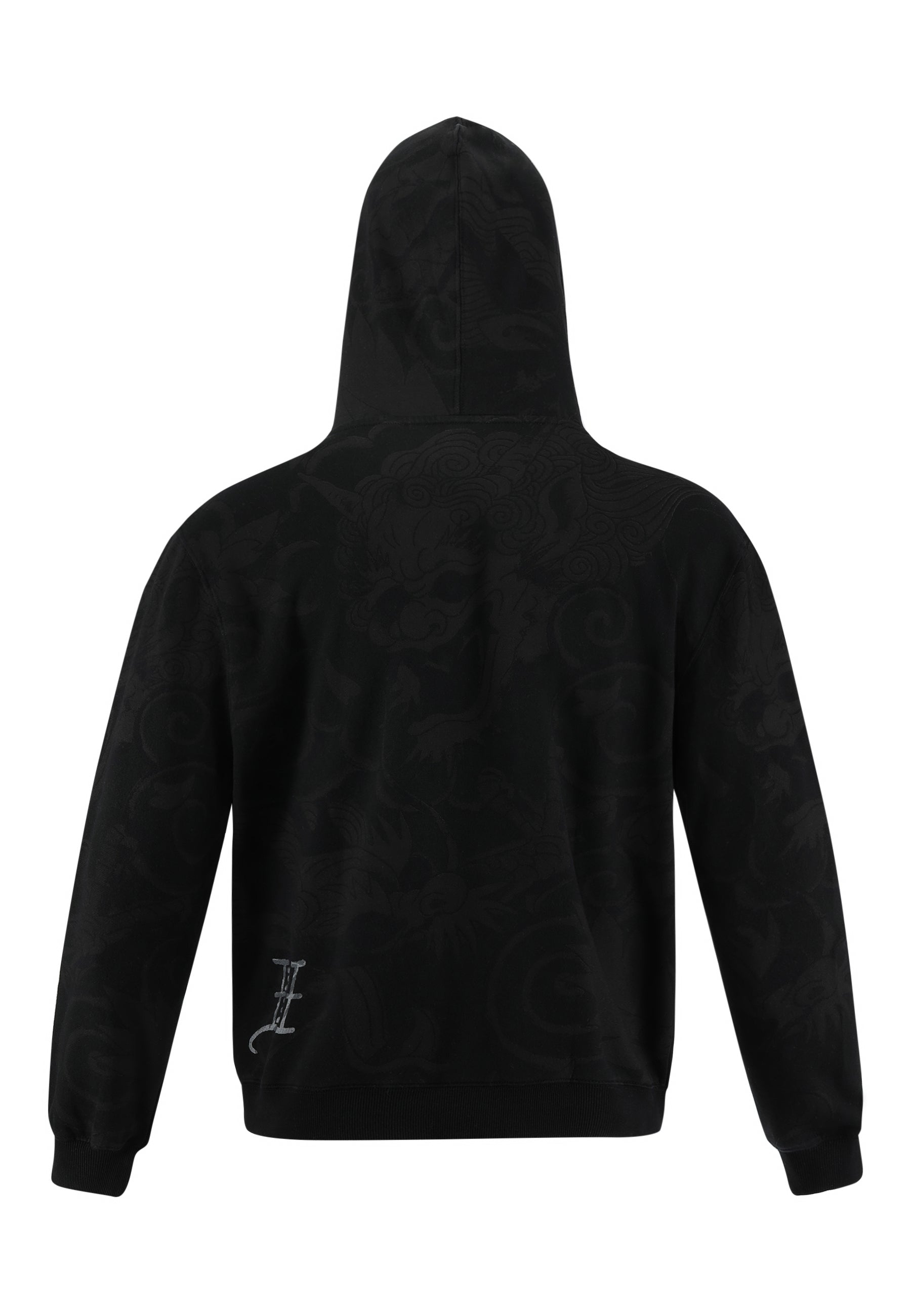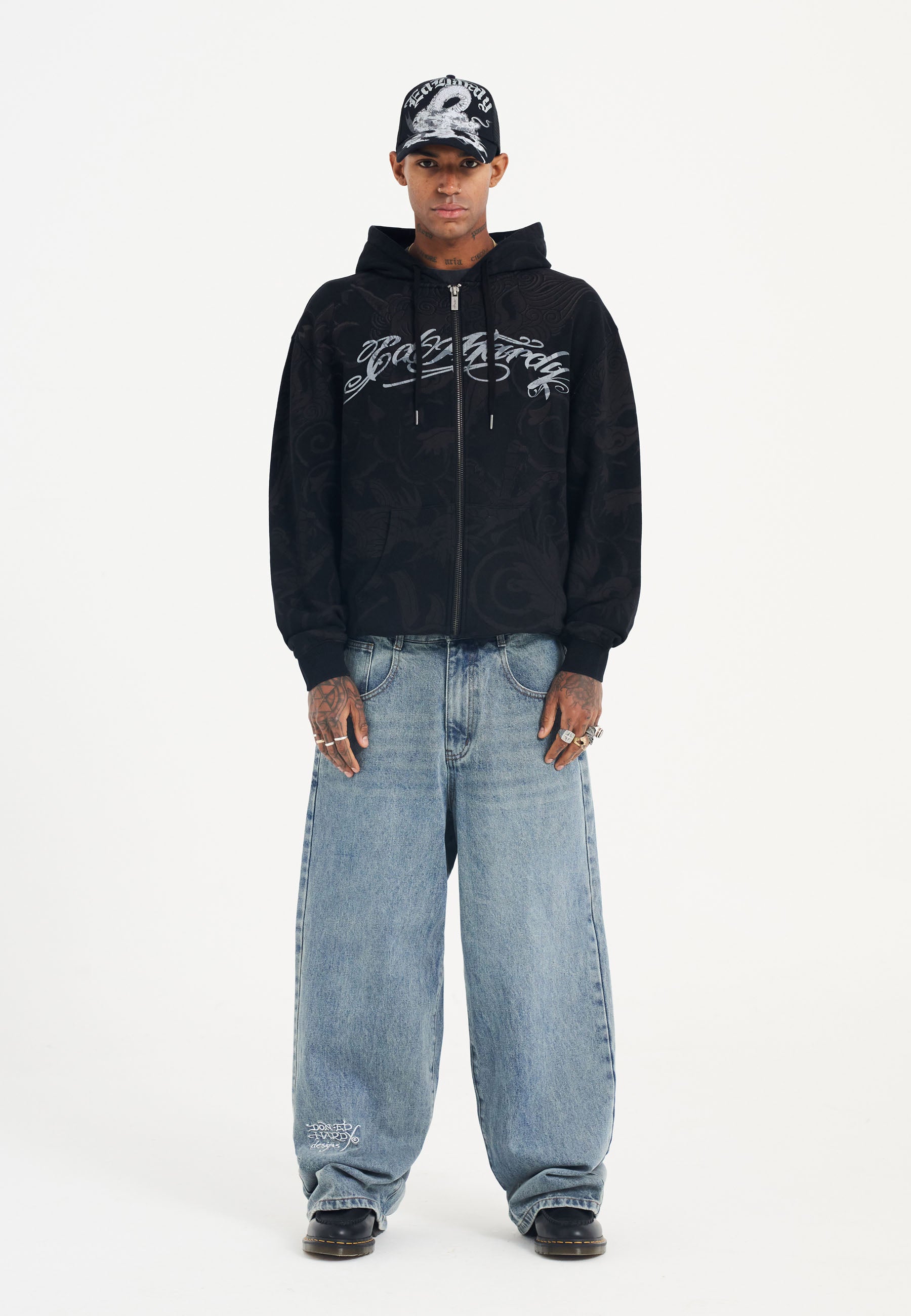Showcasing a tonal, all-over shadow print, distressed chest logo, and Ed Hardy detail across the back left hem.Plus, a full zip-through design, drawstring hood, and kangaroo pocket.