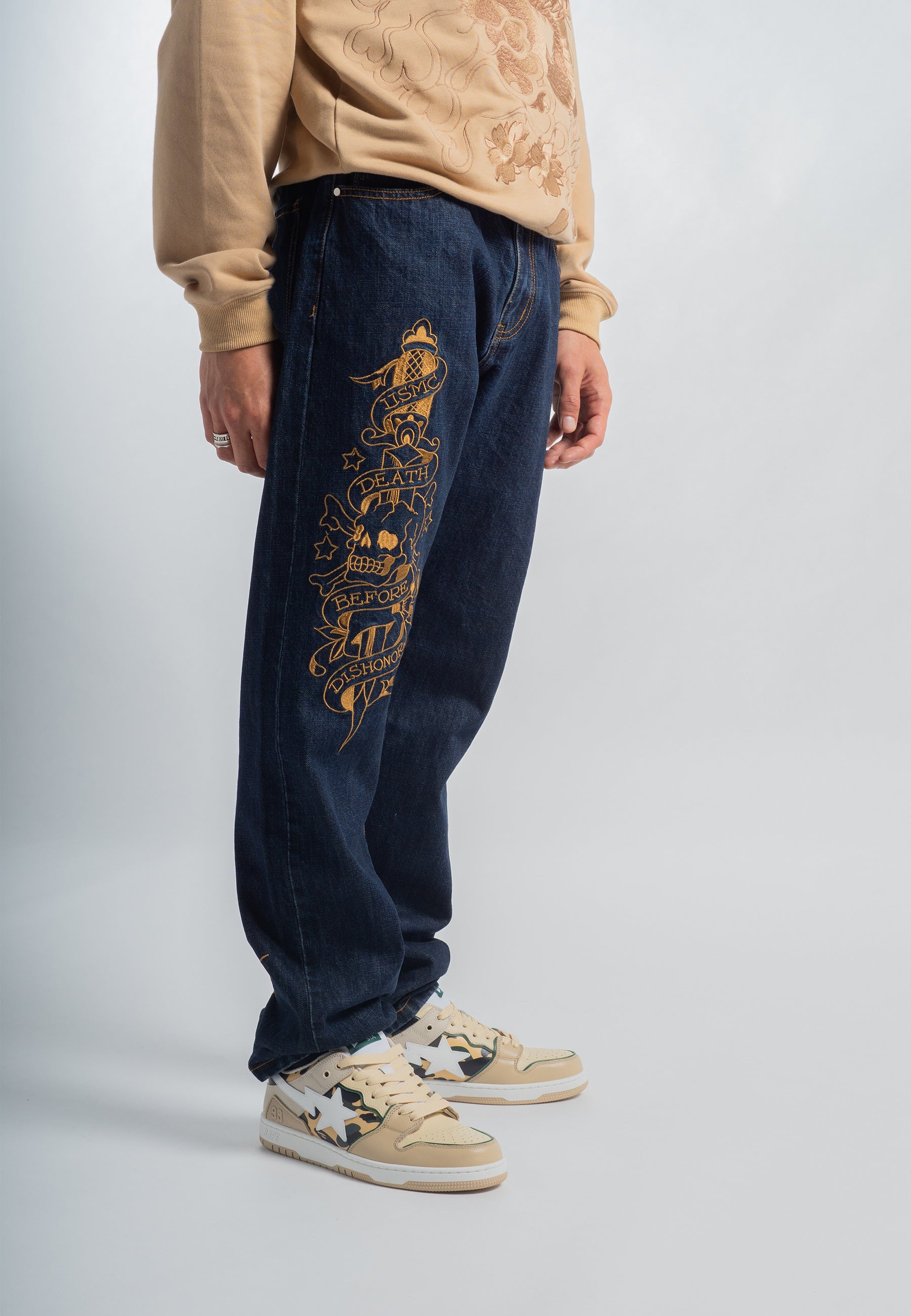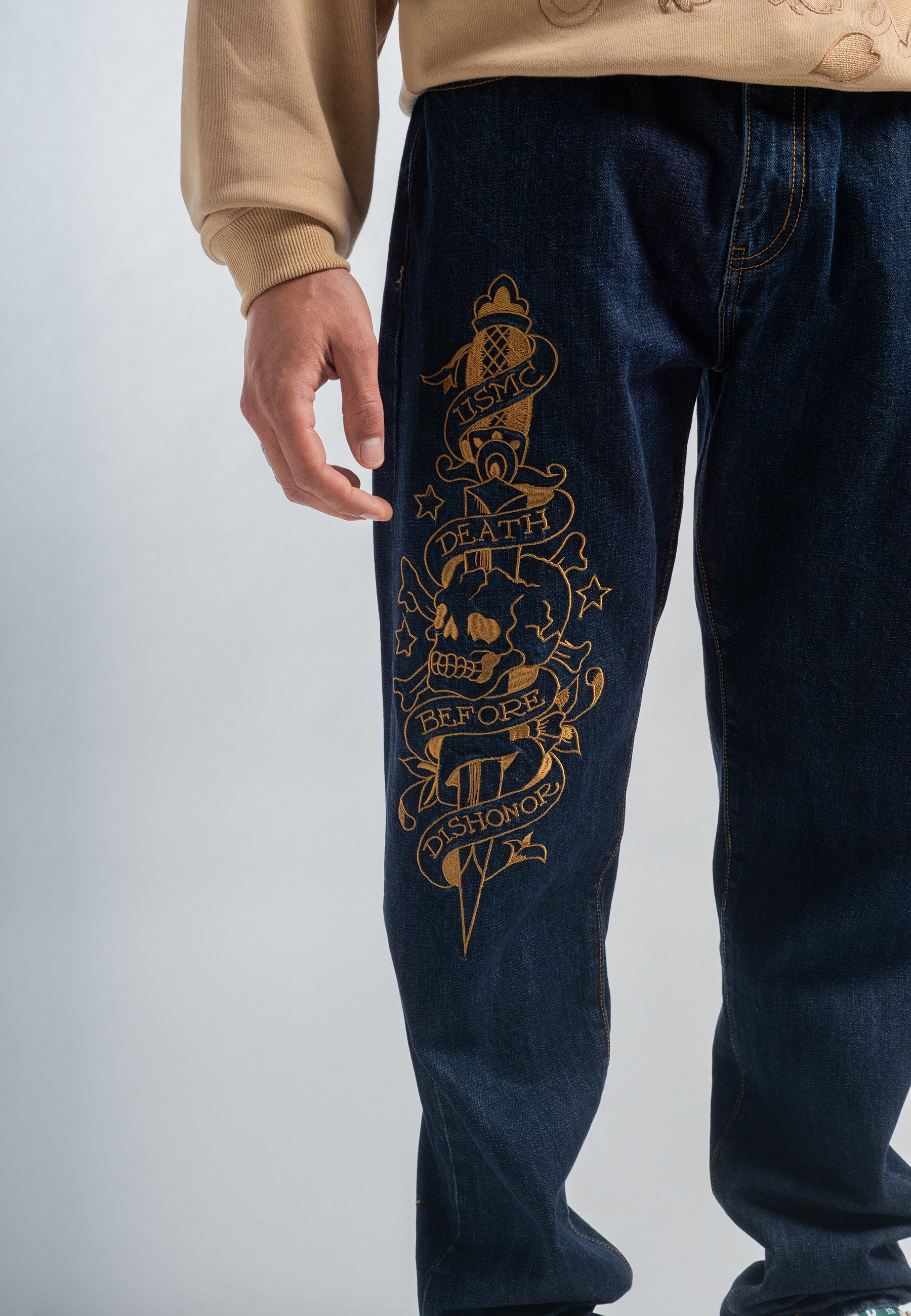 Mens Mono-Skull Tattoo Denim Trousers Jeans - Indigo