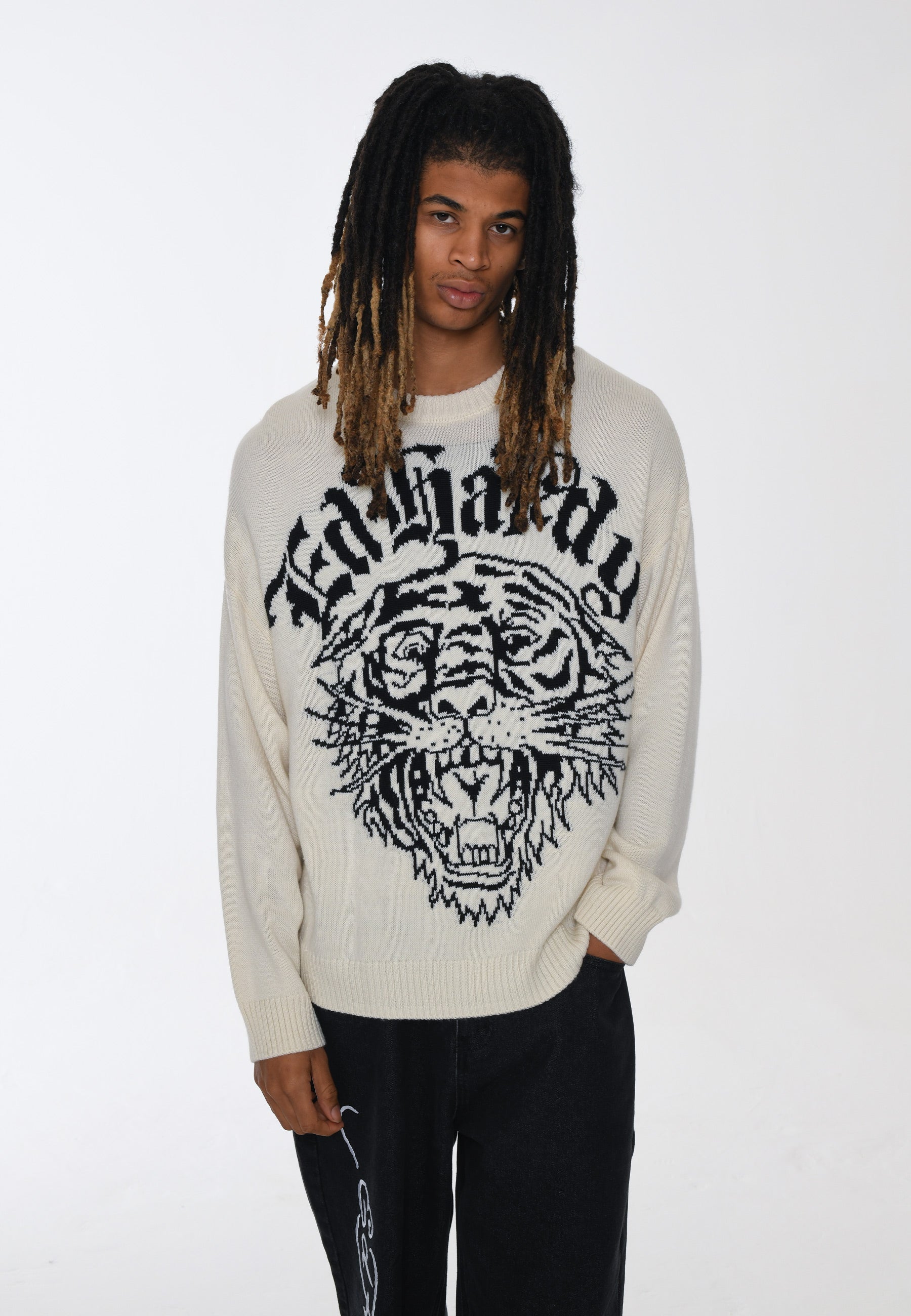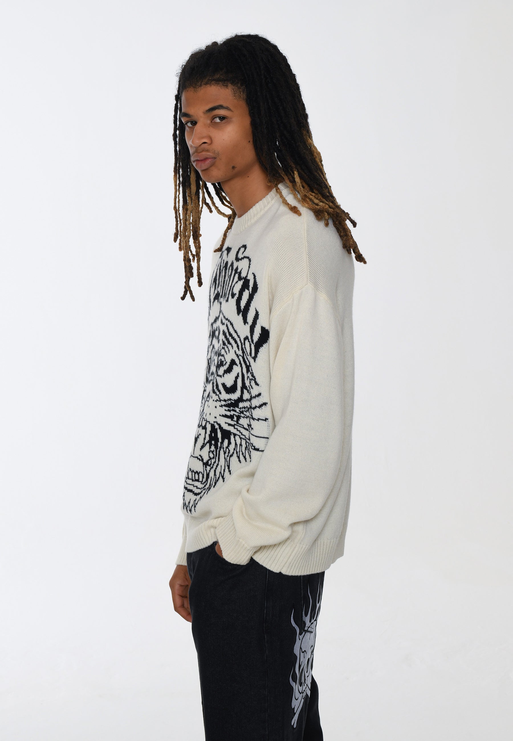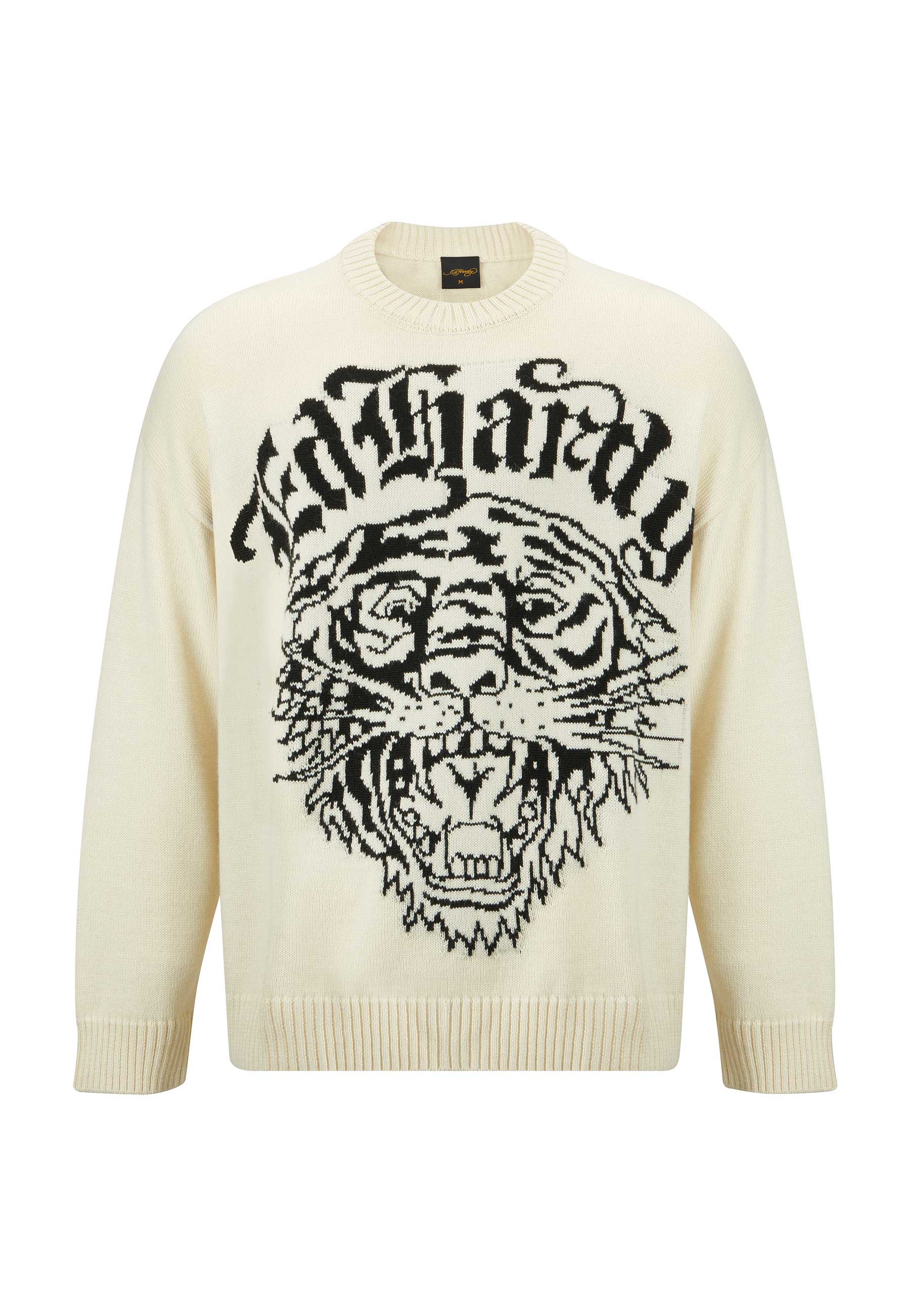 Mens Tiger-Roar Jaquard Knitted Jumper - Off White/Black