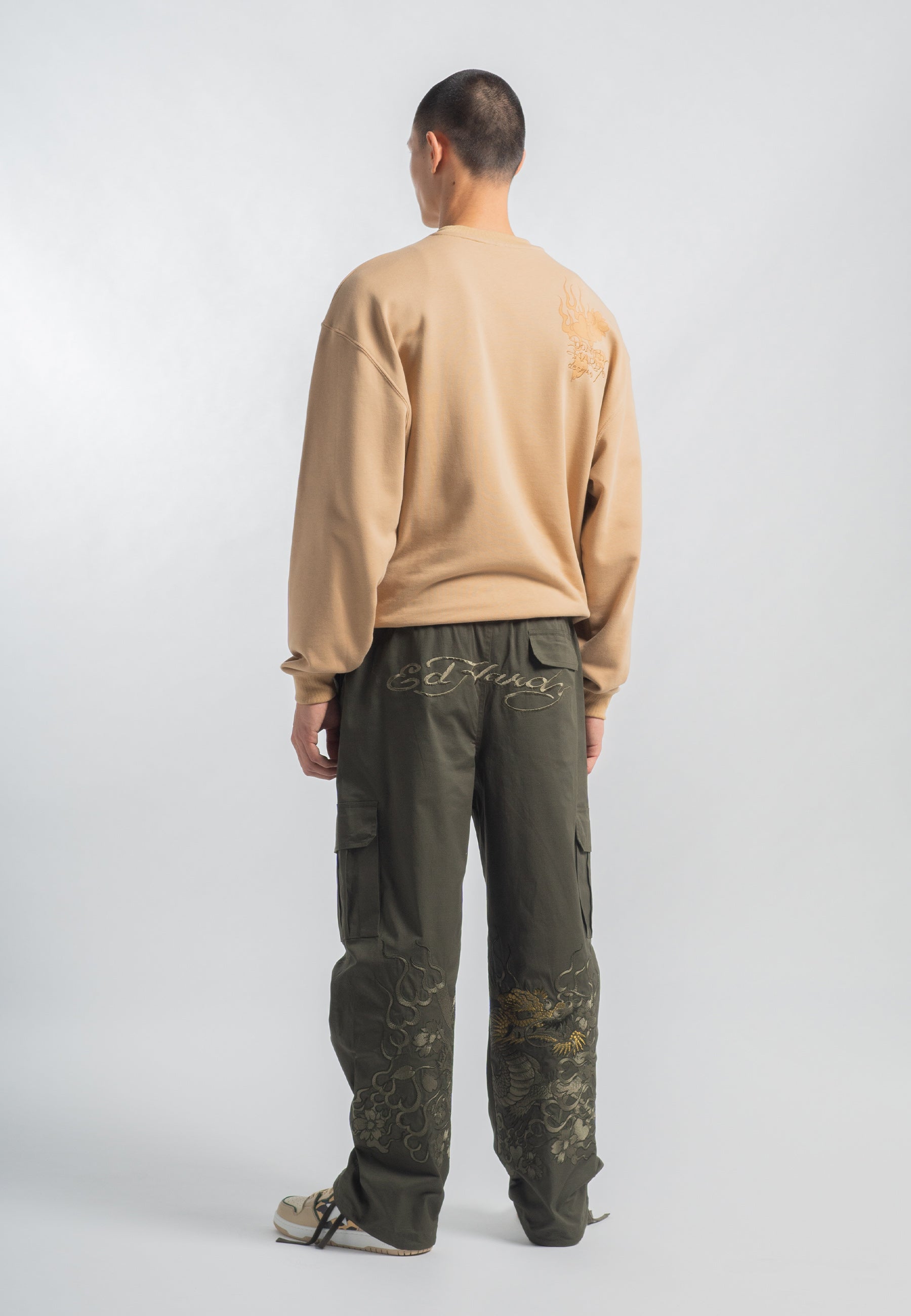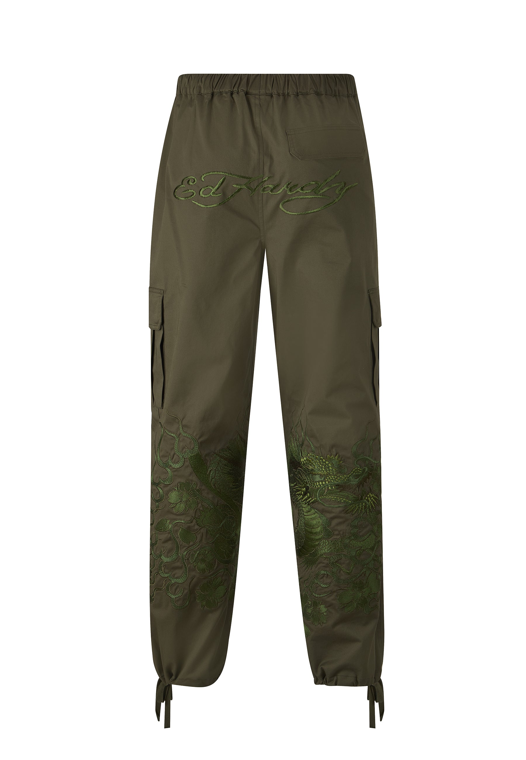 Introducing the Vintage Dragon Combat Trouser. Featuring meticulously crafted vintage-inspired tonal embroidery, the design pays homage to Ed Hardy's archive artworks.
