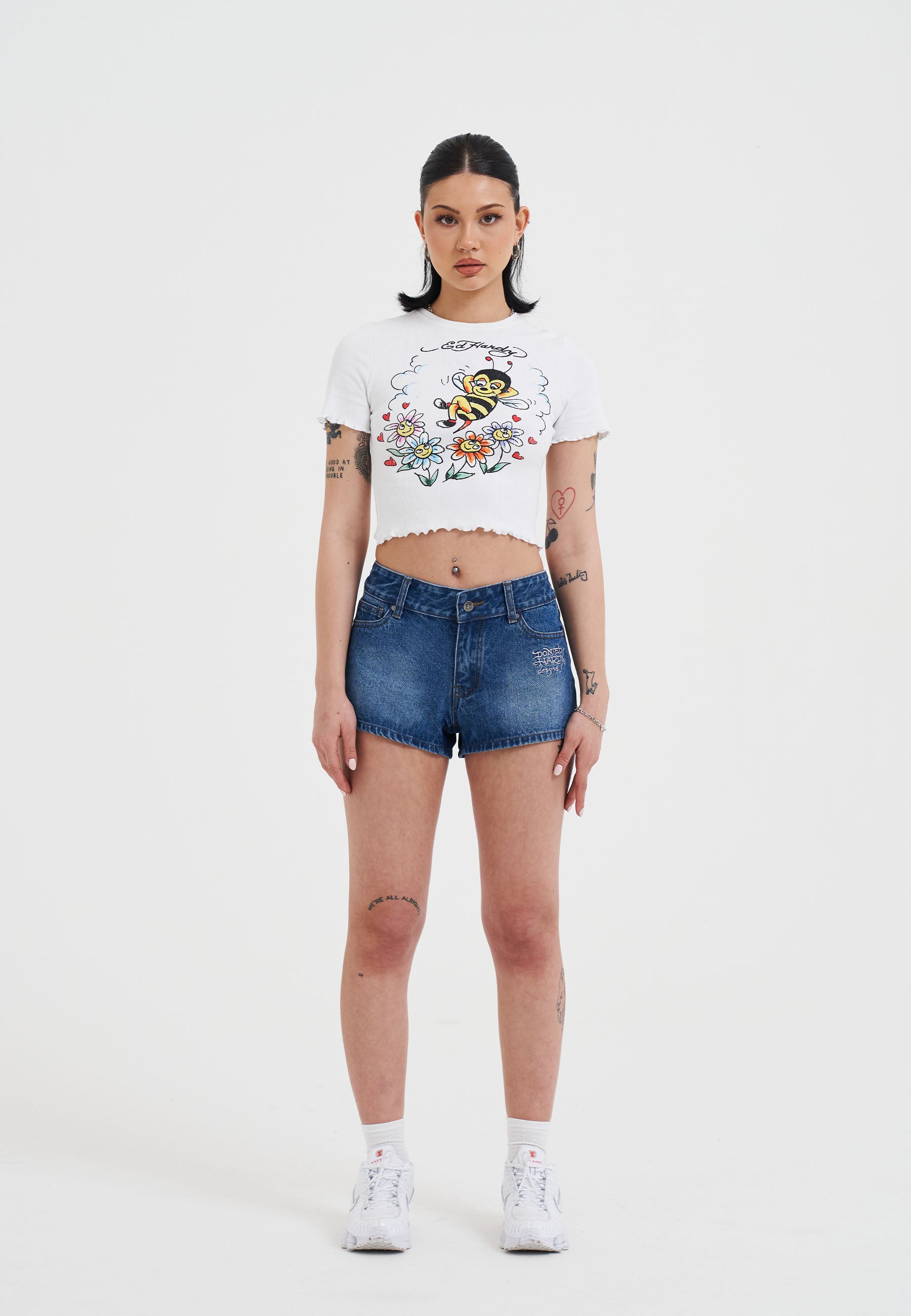 Womens Bee Lettuce Hem Baby T-Shirt Top - White