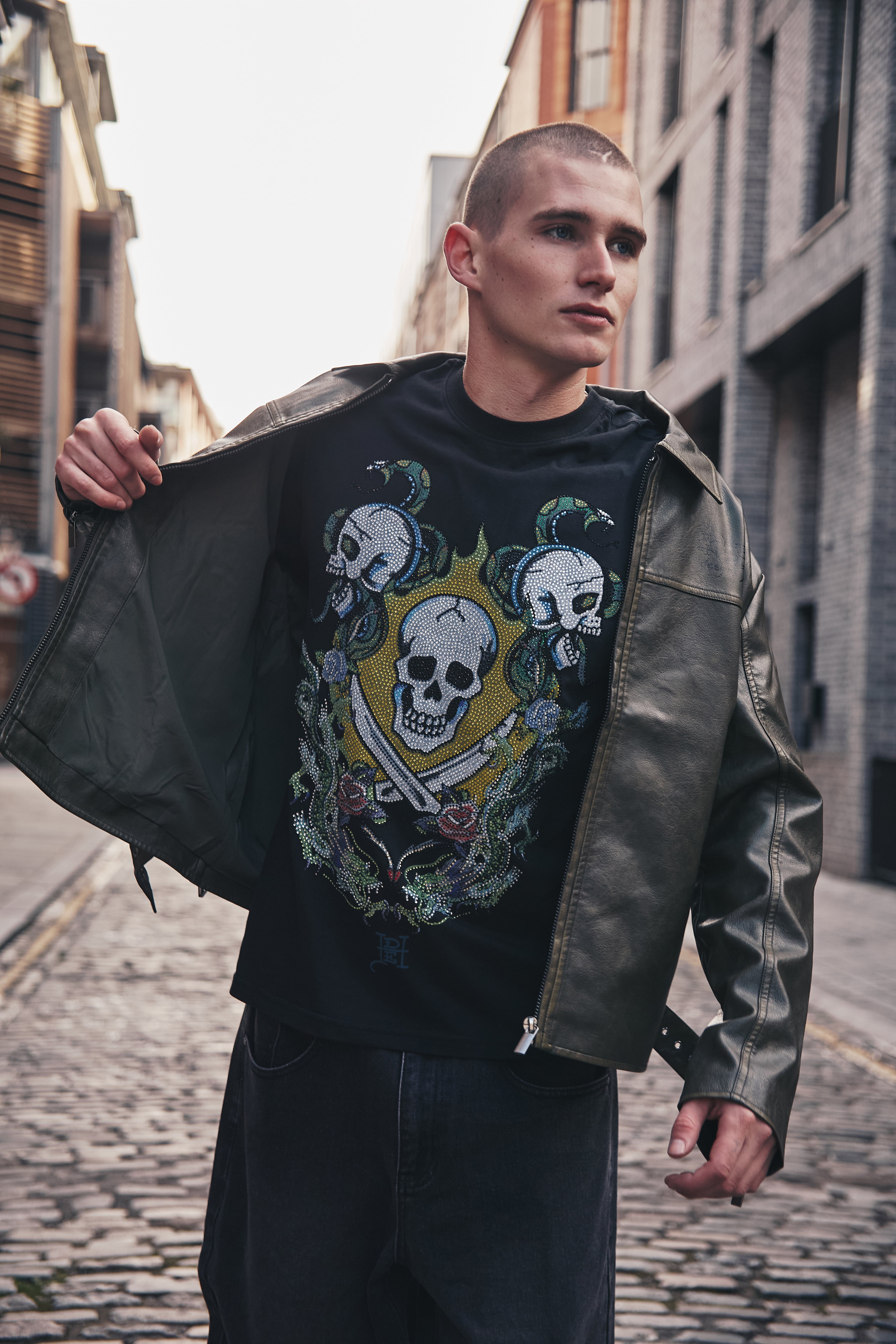 Mens Nyc Skull Longline Bomber Jacket - Black